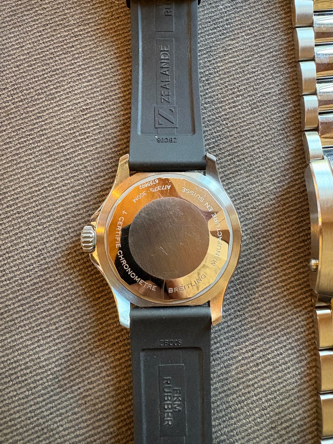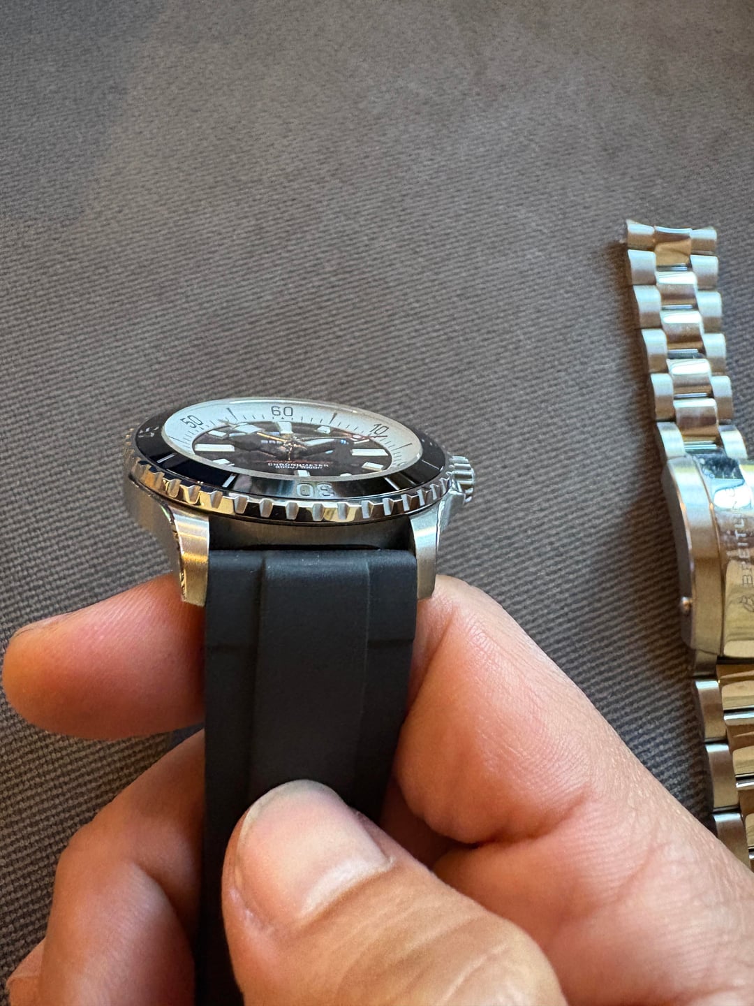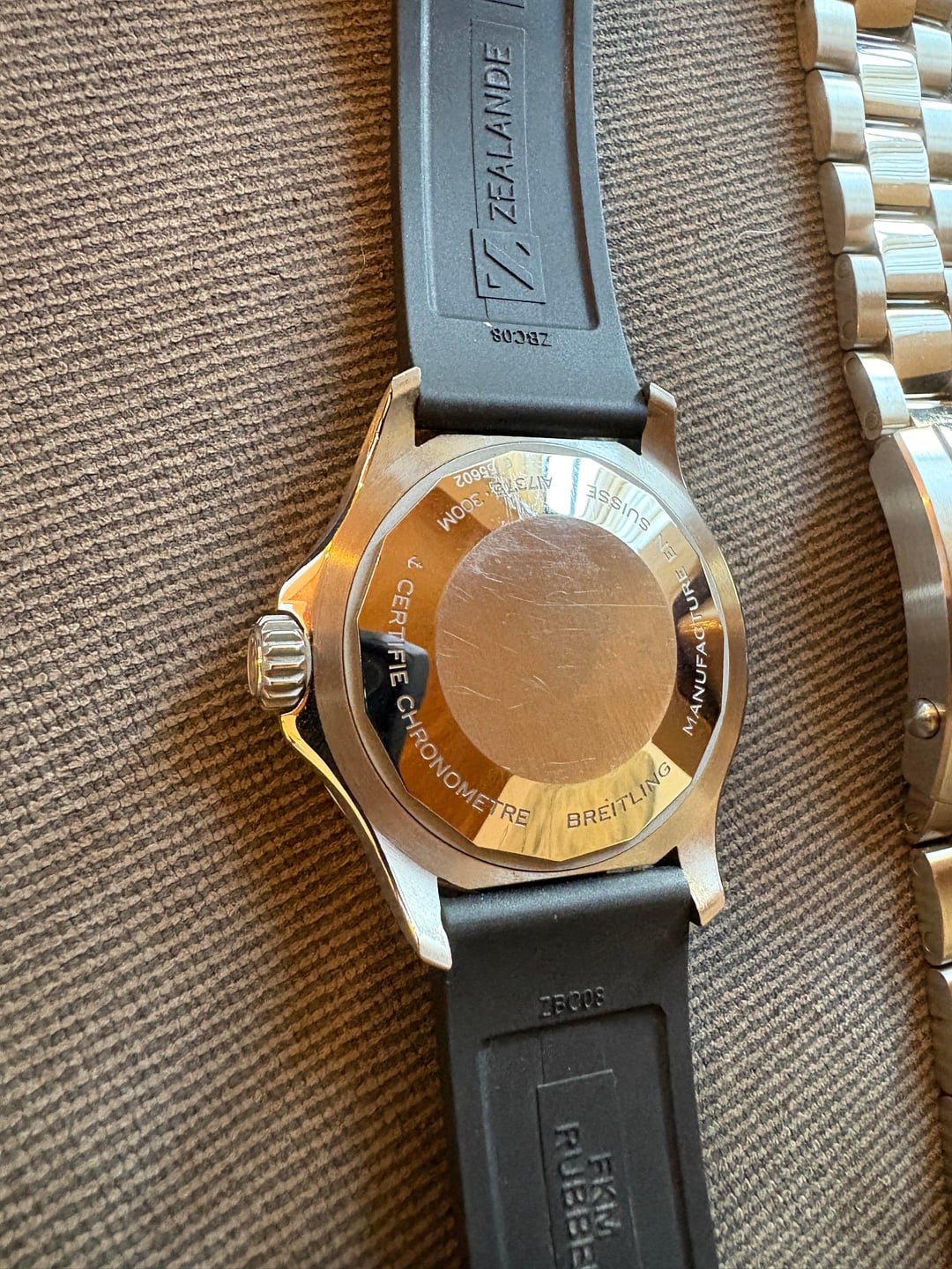 Breitling SuperOcean 42MM Black - A17375211B1A1 - Box + OEM Bracelet with all links + Zealande Rubber Strap **Asking $2900** **shipped insured in the US.** Box and manual but no card. Bracelet with full links. Bracelet has some signs of wear from previous owner. I’ve only worn it on the Zealande strap which I paid $159 for and value in this sale at about 50%. It’s not been worn too much, very comfortable and has a ton of life left. Overall condition is excellent. 90%+ for sure, maybe put it at 92-94% as there’s some scuffing on the caseback and the bracelet’s polished center links show standard wear. EDIT: Payment by wire, Zelle, or cash F2F in SF Bay Area. PayPal is only accepted for users with 25+ successful transactions or similar verifiable references, no exceptions.