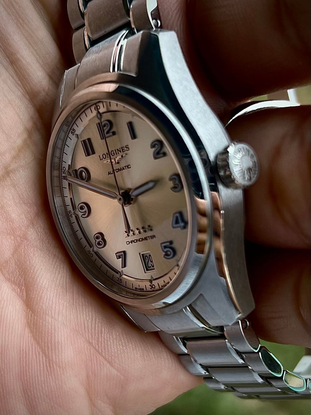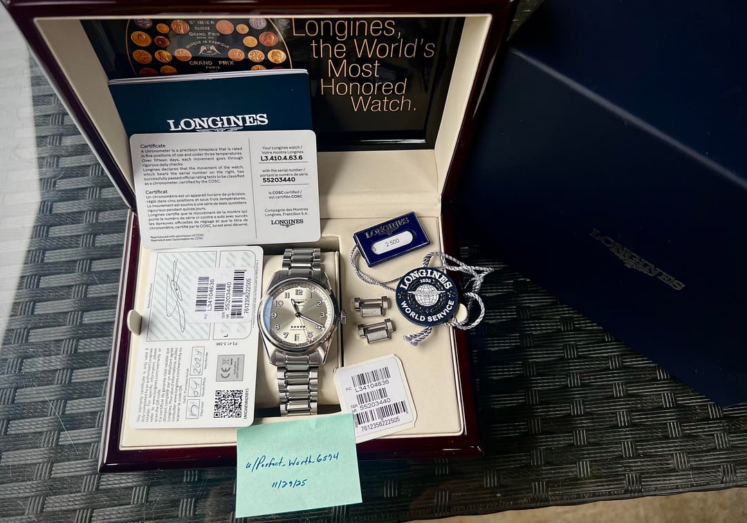 Hello everyone, up for sale is my Longines Spirit 37mm with the beautiful champagne dial, reference L3.410.4.63.6. This is one of the most elegant colorways in the Spirit line, the champagne dial gives off a warm, refined glow that shifts subtly under light, making it an incredibly versatile piece whether you’re dressing casual or more formal. The watch is in good condition overall, showing only light scratches on the bracelet from normal wear, nothing deep or distracting. The case maintains its crisp lines, and the mix of brushed and polished finishing really highlights Longines’ attention to detail. At 37mm, it wears extremely comfortably and is an ideal size for those who prefer a classic, perfectly balanced everyday watch. Specs: - 37mm case - 44.5mm lug to lug - 11.7mm thick - 19mm lug width - Automatic Longines Calibre L888.4 (COSC-certified, silicon balance spring, 72-hour power reserve) - 100m water resistance - Sapphire crystal with AR coating - Screw-down crown Full Kit Includes outer box & inner presentation box, warranty card dated 04/2024, all booklets/papers, stainless steel bracelet with all extra links, hang tags and cleaning cloth. Asking $1,400 net to me, shipping CONUS, no trades please. Feel free to reach out with any questions or requests, thanks for looking!