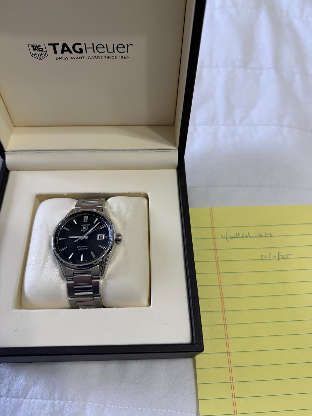 Hi all, Looking to sell my Tag Heuer Carrera Calibre 5 WAR211A.BA0782 in great condition, asking $1,150 plus shipping. Case is in pristine condition, while the clasp and bracelet show some scuff marks from regular use. Keeps time perfectly. Case measures 39mm and is just over 12mm thick. Comes with inner box only and 3 extra links. PayPal preferred payment. Please reach out to me with any questions, thank you.