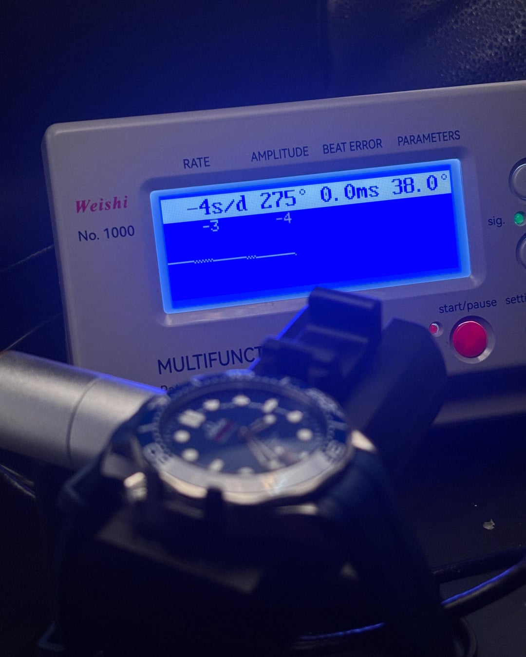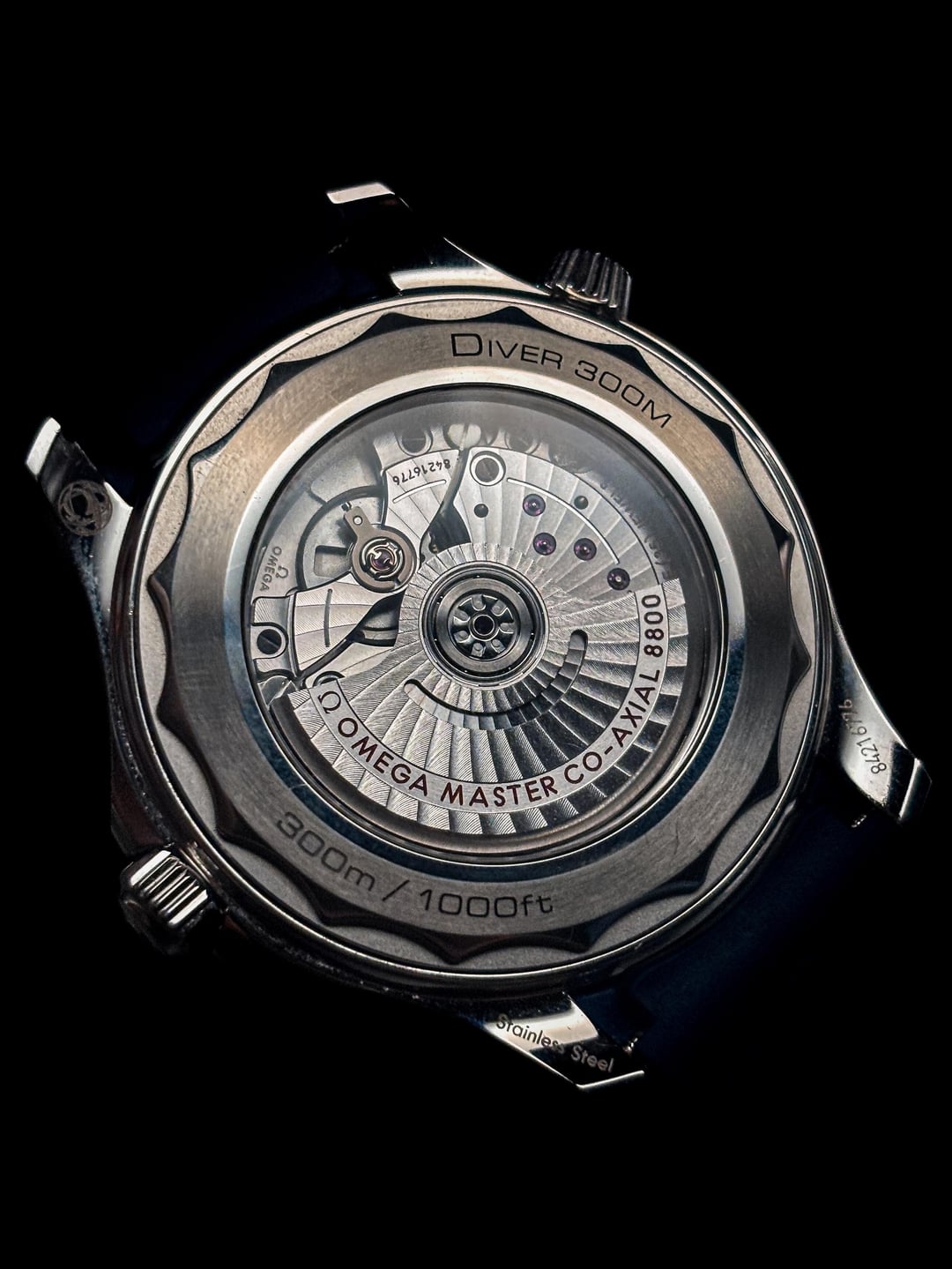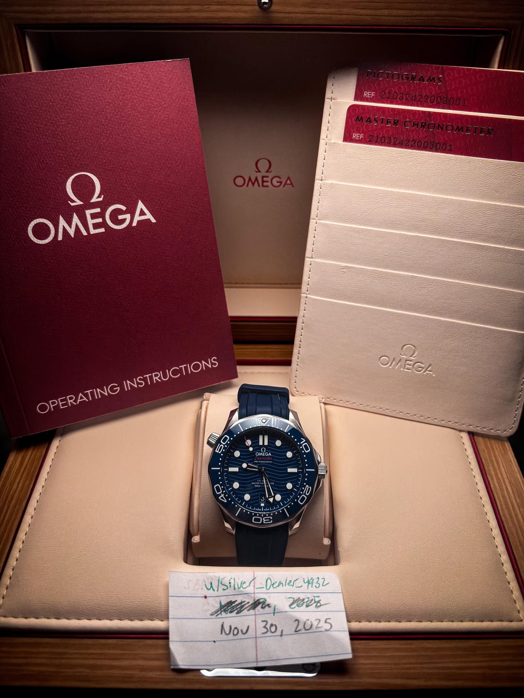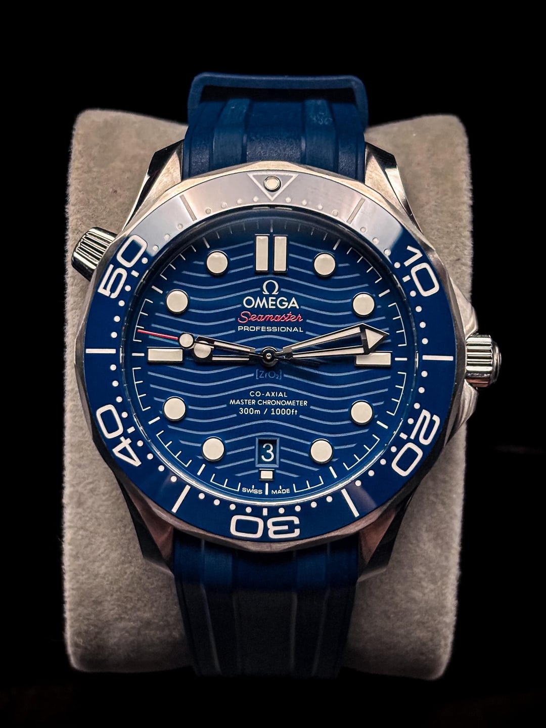 Condition – Excellent overall with normal light wear. Case shows surface scuffs on polished bevels and brushing marks on the flanks. Ceramic bezel is clean with no chips or cracks; action is firm. Sapphire crystal looks clean under direct light with no visible scratches. Dial and hands are excellent — sharp wave pattern, clean lume, no discoloration. Strap shows minor compression at the buckle holes; clasp has light scuffs from use. Movement running well at ~–4 s/d with 0.0 ms beat error (see timegrapher photo). All functions operate normally. Box & Accessories – Includes Omega inner + outer boxes, manual, pictogram card, and chronometer card. Warranty card not included. Price – $3,799 shipped (Zelle / Wire preferred). Apple Pay / Venmo +15. Sales tax required for GA or IL buyers without resale certificate. Shipping – Fully insured FedEx 2-Day within 24 hours of cleared payment. Timestamp – Included in photos. Overview – Omega Seamaster Diver 300M blue ceramic / blue strap. 42mm, Master Chronometer Cal. 8800, 300m WR, display caseback.