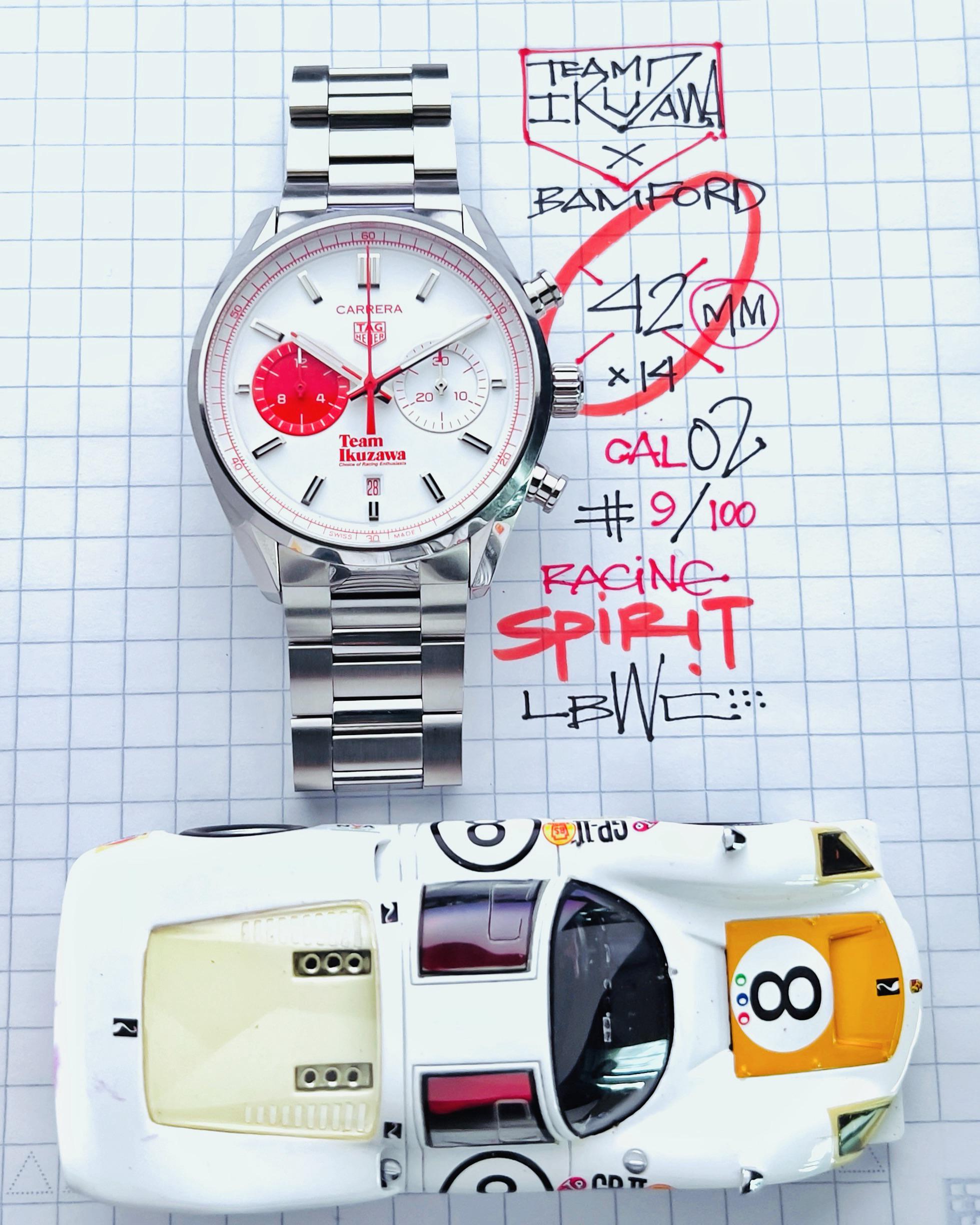 Tag Heuer Ikuzawa X Bamford Team Carrera ref. CBN201F.EB0356 Team Ikuzawa is a cultural brand and a modern racing team with a rich Japanese heritage, and this piece is tribute to Tetsu Ikuzawa a pioneer in Japanese racing. Today, his daughter Mai Ikuzawa's fashion and design bonafides, Team Ikuzawa carries the torch. The Carrera chronograph measuring 42mm X 14.3cc X 48h powered by the Heuer Calibre 02 Movement is not a traditional Glassbox—however— the white opaline dial rocks a red 60-second/minute scale at 9 and a minute chronograph counter at 3 anchored by a date at 6. This eye catcher comes full set: box, card, papers, extra strap and car. Overall, light wear but no damage. Videos and timegrapher: https://drive.google.com/drive/folders/1vGWfyzFToweXjXmZ6DPnWmRNeFW23HKI?usp=share_link Timestamp: https://imgur.com/a/12iLaE9 • Video is the best way to view the watch if in-person test drive is not available. Due to the different characteristic of the cameras and gadgets used, the color of the watch you purchase may not be the same as shown on this website or on our Instagram. * will consider trades that make sense but please consider time, shipping, and trade value—not market. - local special: can possibly accommodate at ButterScotch in Downtown Long Beach by appointment - All sales final unless the watch is misrepresented or lost in transit (always fully insured) - Link to [feedback here](https://www.reddit.com/r/WatchExchangeFeedback/search?q=soycowboy&restrict_sr=1&sort=new) & [watchcharts here](https://watchcharts.com/repcheck/user/soycowboy?source=reddit&type=feedback) Asking a *negotiable* **$5999** via bank wire, Zelle, or venmo. Price includes fully insured Fedex shipping in the USA— hand delivery in Long Beach with drinks or coffee on me ;). Cheers, Stephen