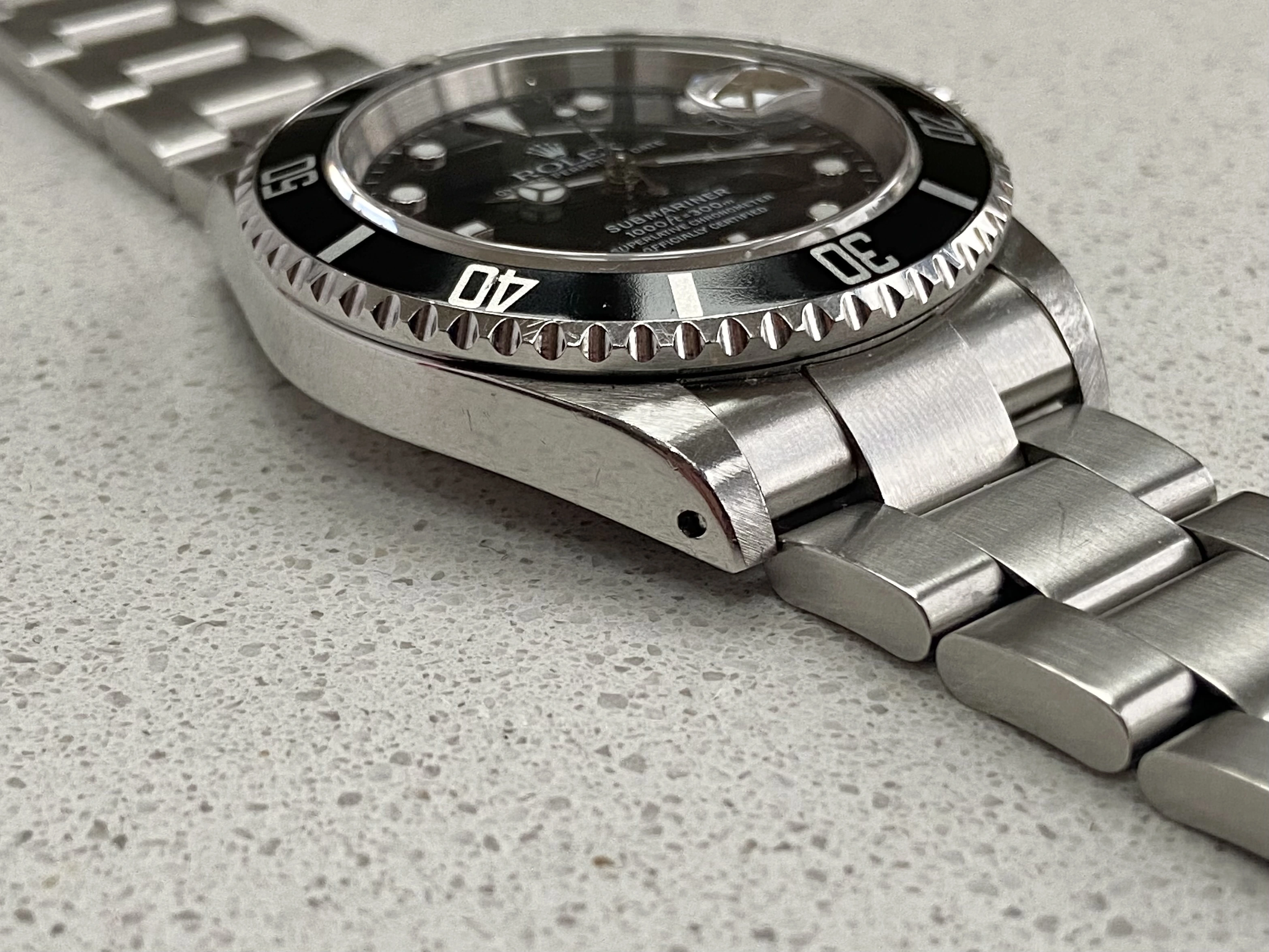 Overall this is a nice honest Sub and a great daily wearer. All parts seem original and correct (serial dates to 2001 and bracelet is 2002), the case is nice and thick and it’s running well. No box and papers which keeps the price down.
