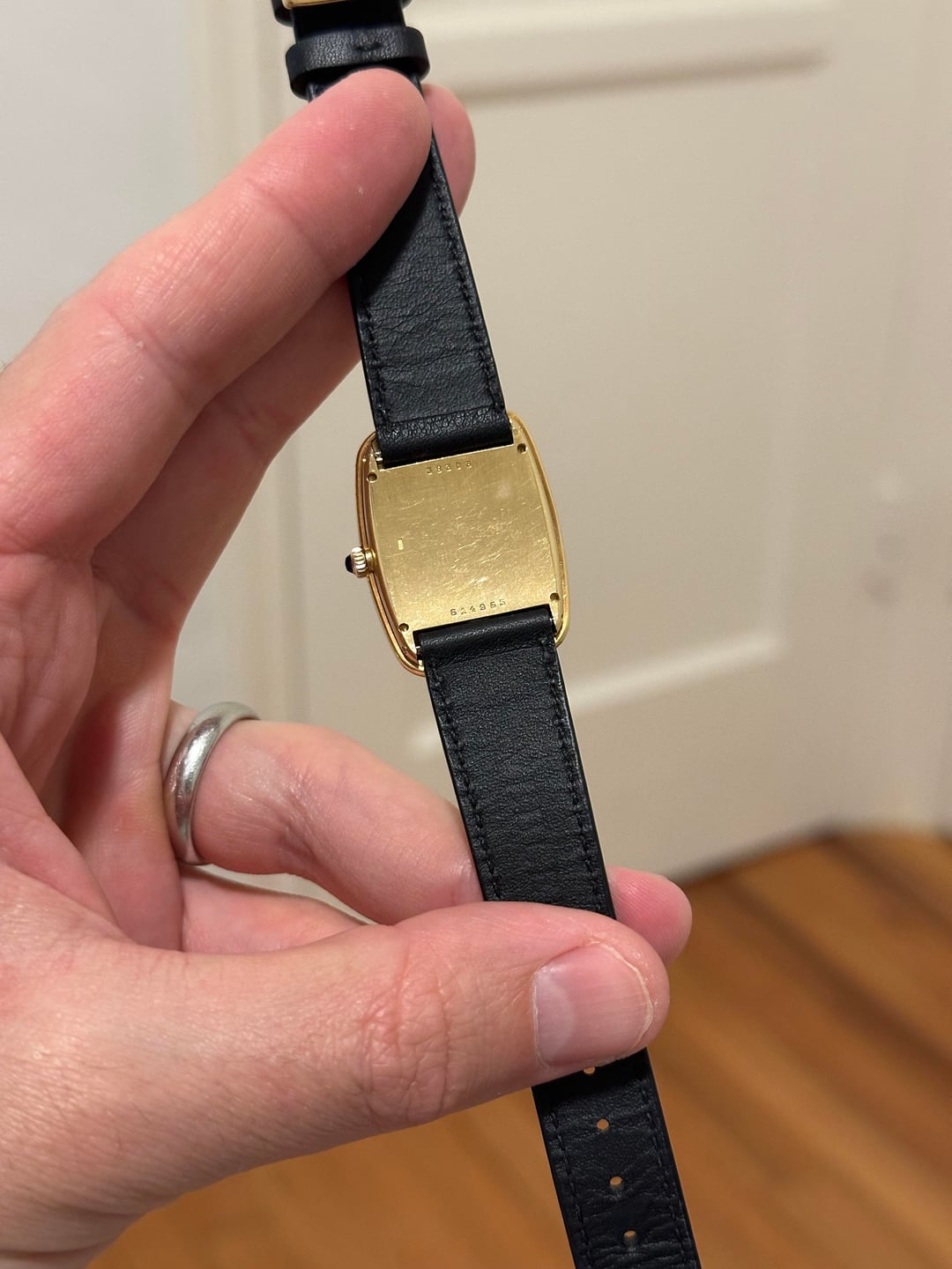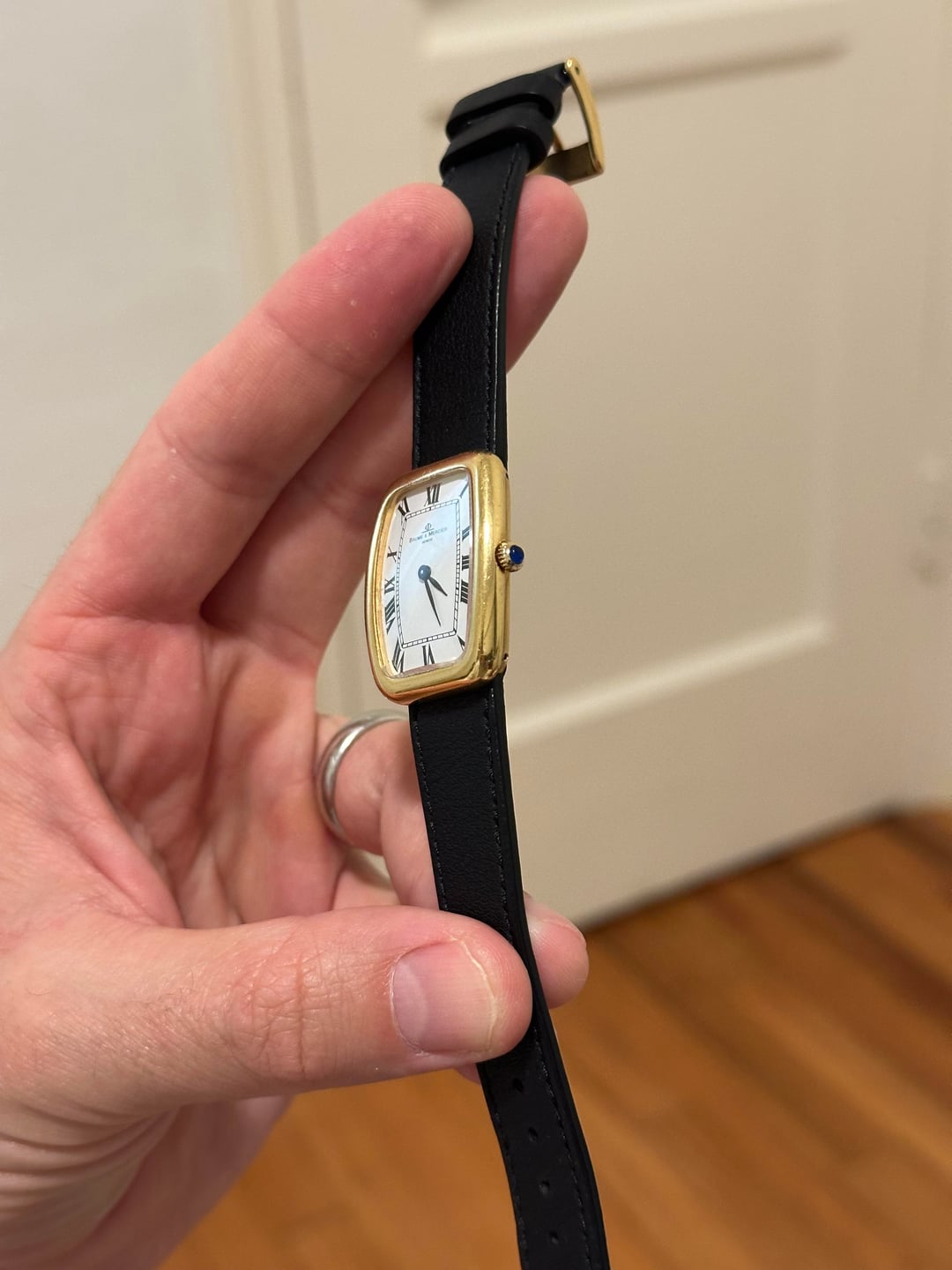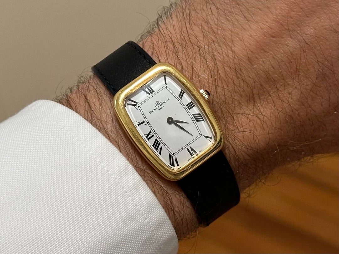 Up for sale is a vintage Baume & Mercier that I am dubbing a "Faberge" based on its similarity to the Cartier Faberge. The watch is solid 18k gold and has a wonderful case shape, with a slight curve to the back and lugs built into the back of the watch that effectively "integrates" the strap. The total weight of the watch without the strap is 30.26g. The watch features classic Roman numerals, a blue sapphire crown, and a rounded crystal. The case is 33mm long, 30mm wide, and 7mm thick. For reference, my wrist in the photo is 6.5". The movement for the watch is an ETA manual wind movement. The watch was recently serviced by my watchmaker and is running great. The watch is in honest condition. It has hairline scratches on the case, and a small fleabite on the crystal. The watch comes on a black leather shell cordovan strap. **Price:** $2,700 but open to reasonable offers **Timestamp:** in photos **Videos:** I can send a video of the watch through my instagram, @WarmDials **Payment and Shipping:** to be agreed upon by the buyer and myself, taking the buyer's purchase history into consideration. I'm located in the United States and frequent user in this community. I have bought and sold often, and I'm happy to answer any questions you may have / provide more photos or a video. You can find me on instagram at @WarmDials. Don't hesitate to reach out if you have any questions or want to chat