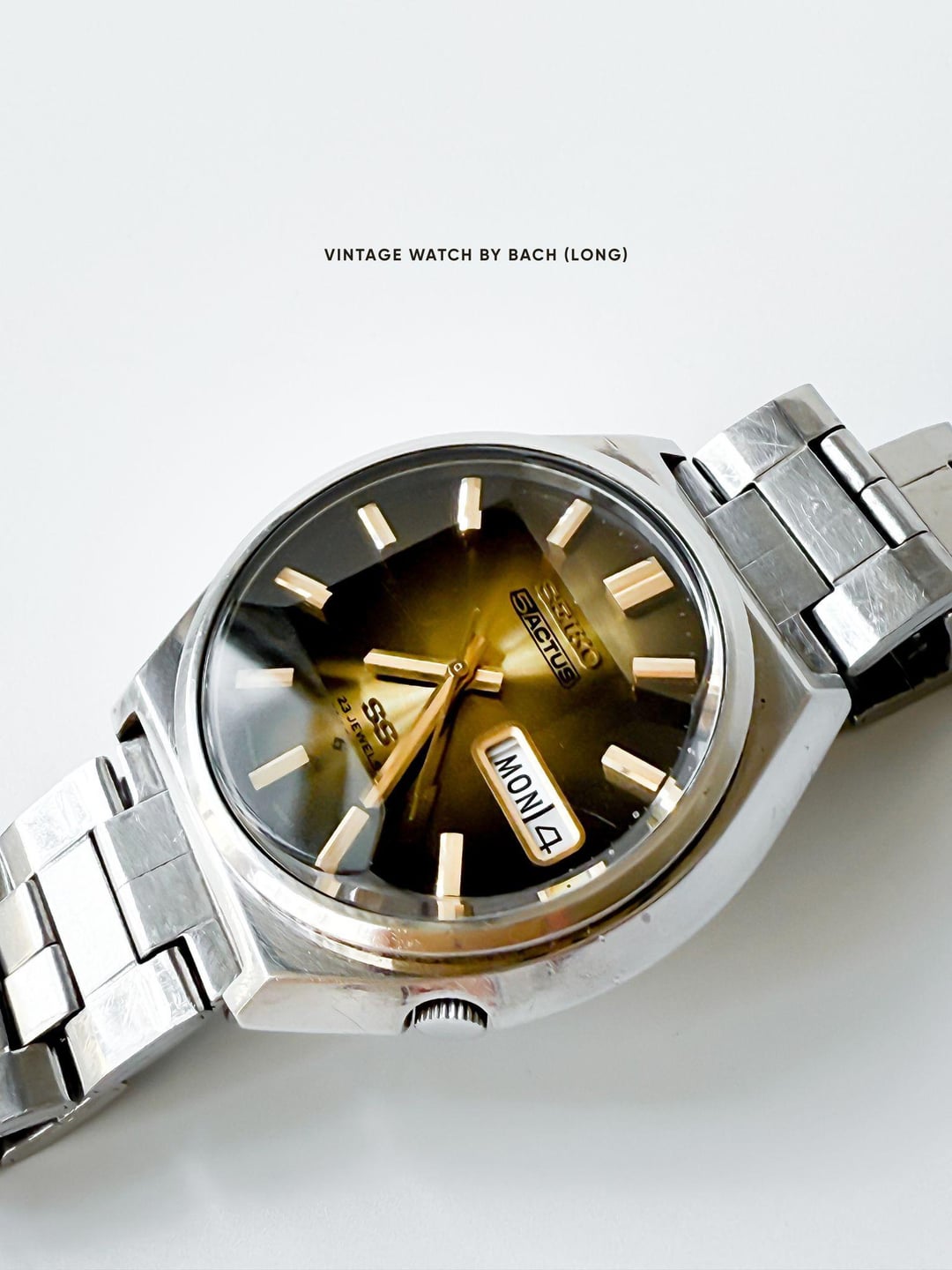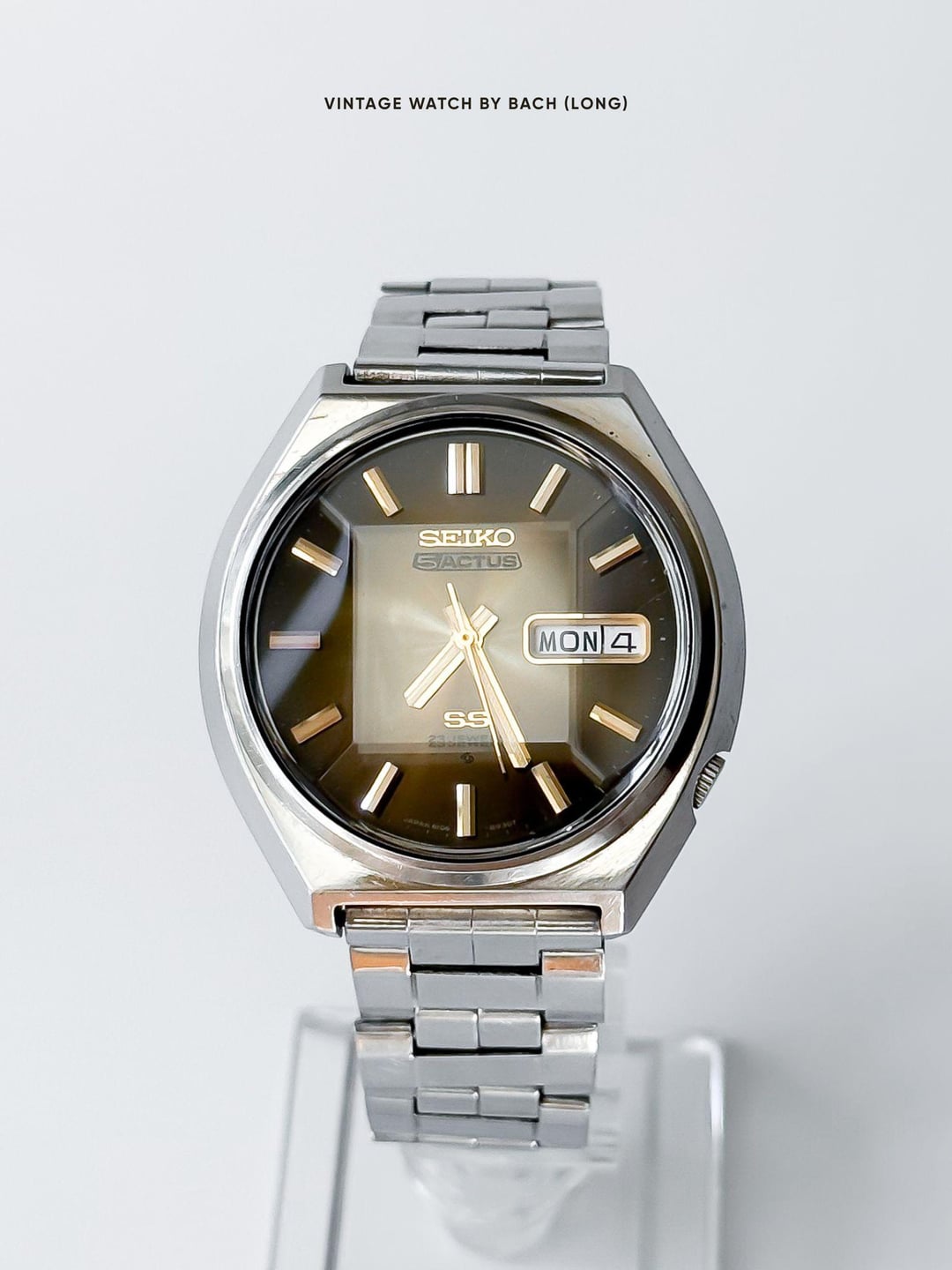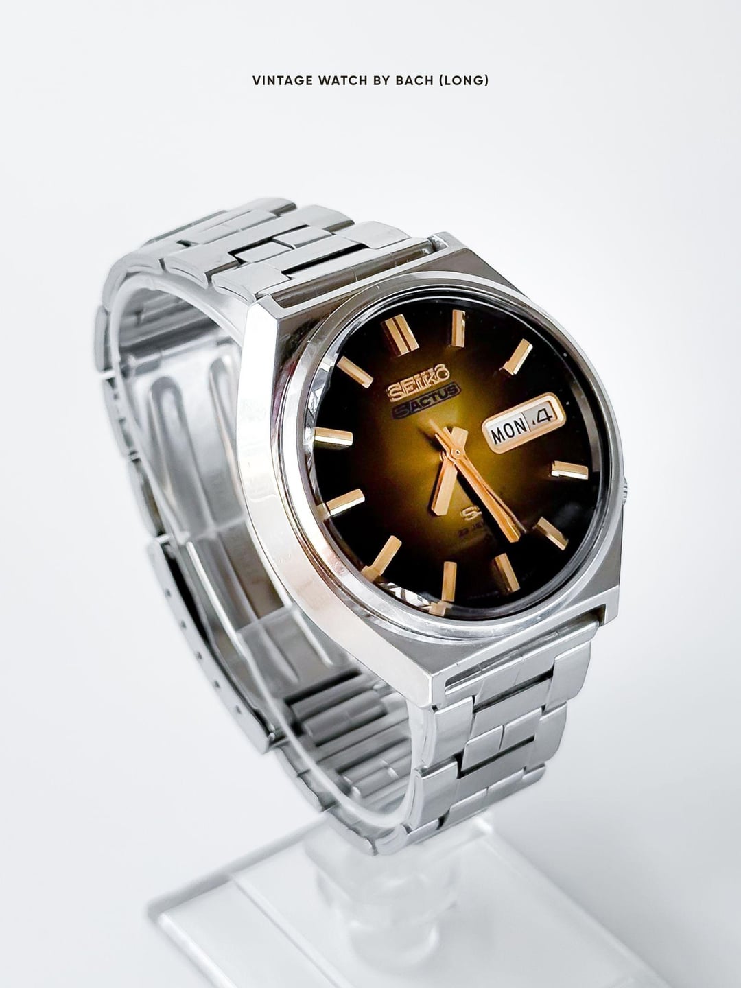 Seiko 5 Actus 6106-8690 Sunburst Brown Dial (Automatic) SPECIFICATIONS: \- Japanese Seiko 5 Actus good condition from December 1974, classic and vintage style. The Actus line was sold only in Japan and designed with higher jewel count, sporty version of the regular Seiko 5. \- Original Seiko 5 Actus stainless steel bracelet fit up to 18cm wrist. \- Stainless steel case size 38mm (without crown), Lug to Lug: 40mm, Lug Width: 18mm, Thickness: 11mm. \- Brown sunburst dial, glowing light when seen from different angles. Thick baton hands with classic baton hour marker. Bold calendar box for Kanji/English day and date. \- Faceted cut crystal add more interesting and eye-catching effect to the watch. \- Quickset date/day, push hard all the way to change weekday, push half way to change date. \- “SS” logo mean Second Setting (Hacking), an advanced watch technology at that time. \- The swirl logo applied at the bottom of the dial, mean Suwa Factory - today's Seiko Epson. CONDITION: The watch is well preserved for its age (See Photos). No obvious signs of wear. Just some inevitable hairline scratches on the case. The original movement works well (keeping the time, changing the date). It’s recommended to only setting the day/date in 6-7 o’clock (safe time), should not change it in 9PM-4AM or that might damage the movement. Recommend to avoid getting wet for vintage watch. The watch has been tested for more than 1 month and operate stably before selling. SHIPPING AND PAYMENT: \- Worldwide shipping via UPS with tracking number. 6-8 business days. \- Price 300 USD (free shipping). \- Import duties, taxes and charges are not included in the item price. These charges are the buyer’s responsibility. Please check this prior to buying. These charges are normally collected by shipping company (UPS).