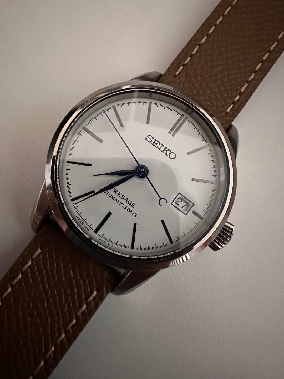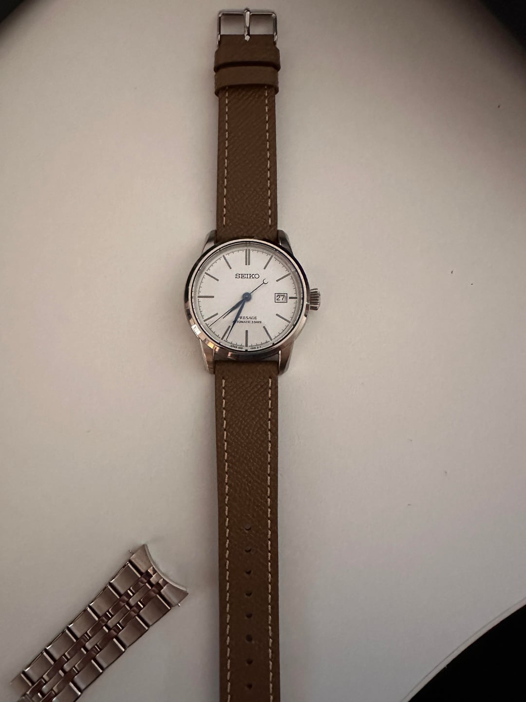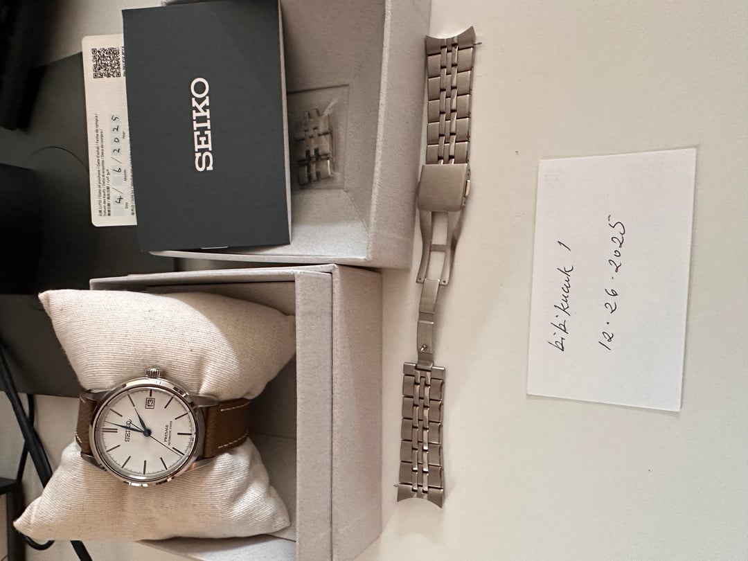 Just got this in a trade. Beautiful watch, but probably won’t replace my dress watch. Since SARX 105 is not well-known, here’s a run down: It’s a 40.2mm watch with a handmade lacquer/urushi dial. The white dial has a hue and sheen that’s unlike anything that I’ve owned. It’s really bright white, but has a warmness to it. That’s why it’s in the craftsmanship series. The case and the bracelet have hardened coating, which changes the color slightly and adds to the feeling that you are wearing a very high quality watch. Not the usual Seiko fare. As far as the dial is concerned, I’d also put it above the entry level Grand Seikos. It is touted as a budget alternative to the Credor Eichi GBLT999 It runs on the 6R55 movement, which has a 72-hour power reserve. I immediately put the watch on an taupe epsom strap to check and yes, it looks better on epsom than it does on the bracelet. This is a full kit, including the signed warranty card. $850 OBO. Zelle preferred. CONUS shipping only. Would be interested in straight trades and trades down. Currently, I am looking forbronze watches, Mido Patrimony or TV and, Kuoe.