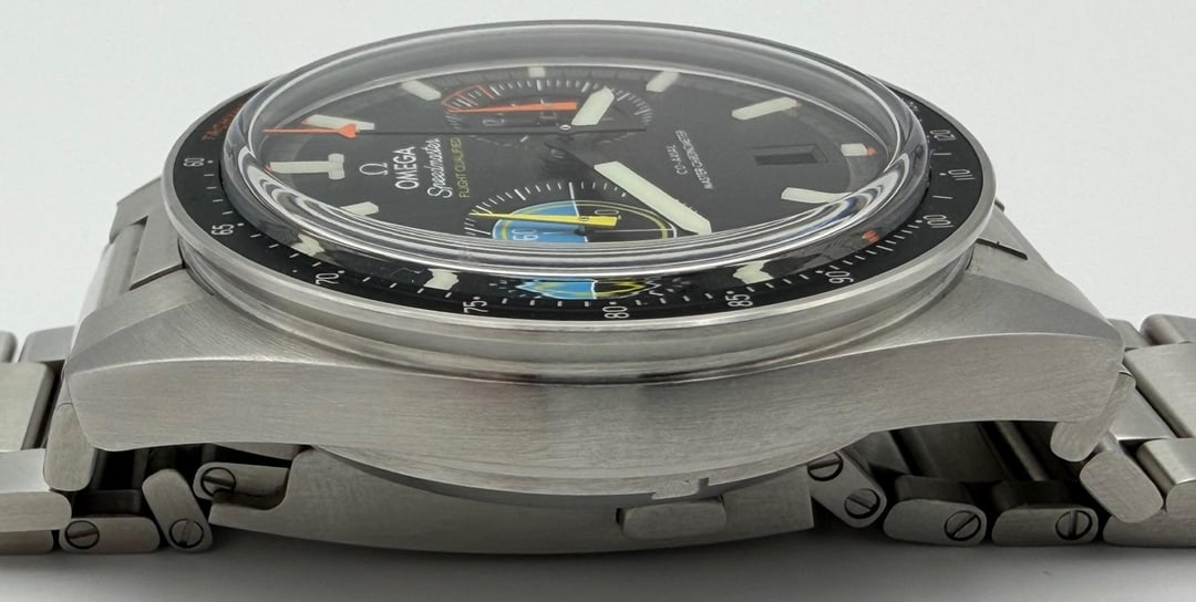 This is one of the coolest recent releases from Omega - the Speedmaster Pilot Automatic. This really embodies a tool watch and just has a really cool look and feel that is unlike any other Speedmaster our there (the all brushed surfaces are really well done). Purchased earlier this year and worn sparingly in rotation, it is in excellent plus preowned condition. A few desk diving marks on the clasp and bracelet, but the case and crystal are perfect. Comes as a complete set with all boxes, kevlar sleeve, hang tag, 3 cards, manual and unworn fabric NATO. **Asking $7600.** Wire/Zelle. I'll cover 2-day shipping to your local FedEx. No Trades. Plenty of references from various forums. From Omega: Flight Qualified for the Next Generation Worn during all six moon landings, the Omega Speedmaster is one of Omega's most iconic watches. This special version takes its design inspiration from the 1957 original, and the collection's long history in flight. The 40.85 mm watch in brushed stainless steel features a grained matt finish black dial with a rhodium-coloured outer ring, and hour markers made of white Super-LumiNova blocks which emit a green glow. Its cockpit-inspired display has two subdials with opaline centres and brushed bevels. At 3 o'clock, a 60-minute and 12-hour recorder, designed to look like a “burn rate” indicator. It includes a triangular matte-orange hand and transferred white numerals. At 9 o'clock, a Small Seconds display, designed to look like a target/sight indicator, featuring a varnished matte-yellow hand and artificial horizon in blue. The hour/minute hands are PVD-coated matt black with blocks of white Super-LumiNova with green emission. The central chronograph hand has a varnished orange airplane tip. This Speedmaster Pilot has a brushed flat-links steel bracelet with Omega's patented screw and pin system. Providing the power is Omega's Co-Axial Master Chronometer Calibre 9900. The watch is presented in a special travel pouch with strap-changing tool and pass-through strap made with Kevlar threads. Specs: Case: 40.8mm Stainless steel (14mm thick, 49.6mm L2L) Caliber: Omega cal. 9900 Movement: Self-winding chronograph Movement features: silicon balance spring, magnetic resistance (15,000 gauss), Master Chronometer certified Power reserve: approx. 60 hrs Water resistance: 100 meters Crystal: Domed sapphire Lug width: 20mm