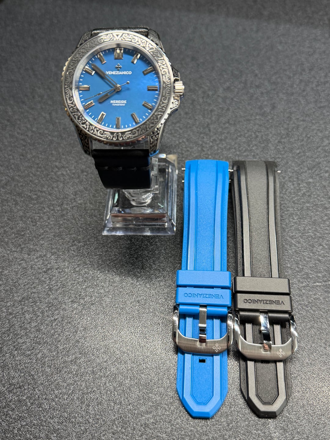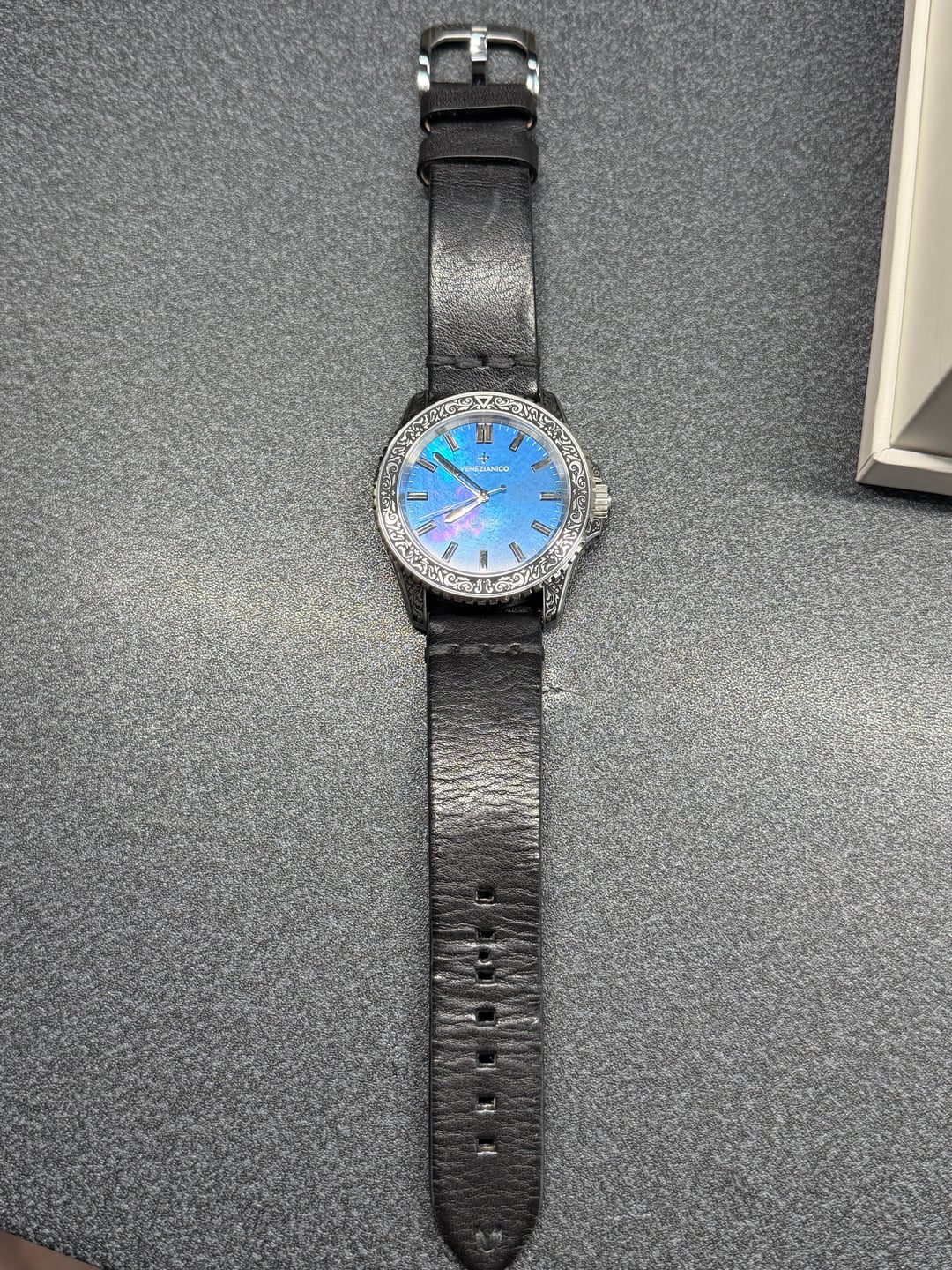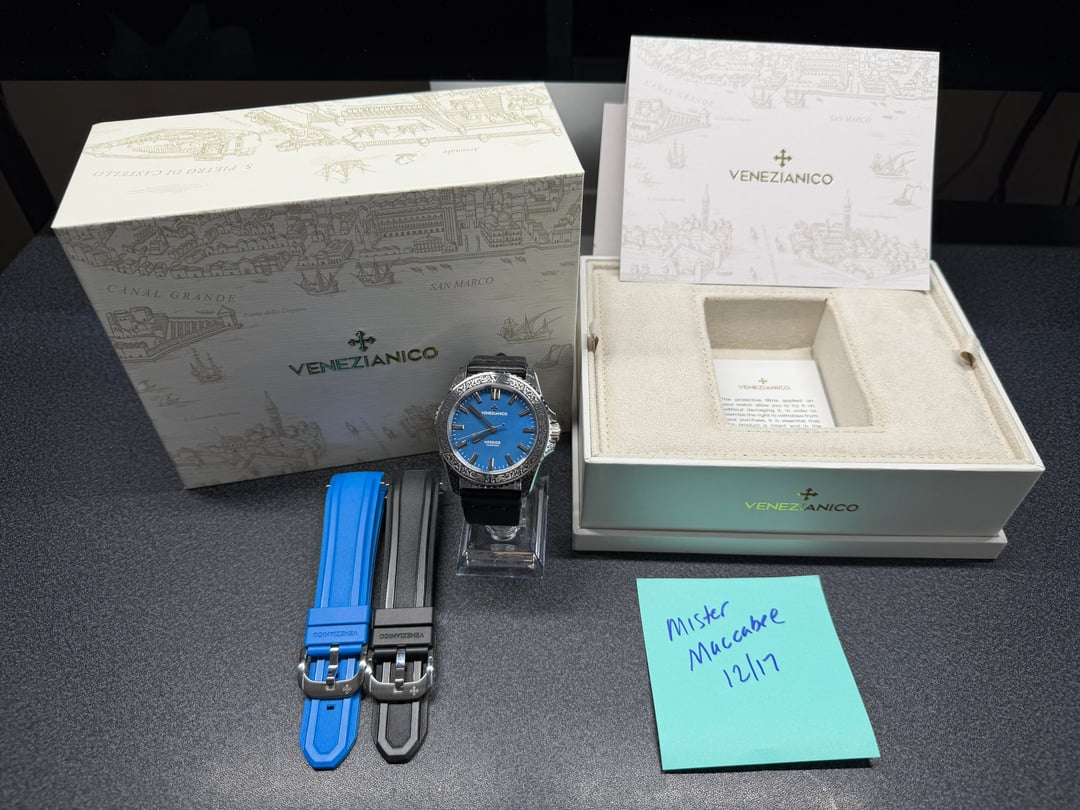 Hey folks So this is cool - straight from Venezianico I had them make a 1 of 1 bespoke of the Acquaforte case with the Tungsteno dial - blue mother of pearl with hints of light blue, purple, etc. Gorgeous dial that changes everytime you move your wrist. Under lights, especially outside light it shines. Wild. I'll put some specs below from their website from the Acquaforte page so you see the case size, etc. Watch is in excellent condition, worn only a couple times indoors. Leather strap shows slight signs of wear due to wearing it a couple times on wrist which curls the strap a bit. See pics - everything is in great condition. Comes full kit. It comes on the aged black leather strap that the Acquaforte comes with originally. But I also purchased 2 of the intetgrated rubber straps - the blue that matches the Tungsteno dial and a black one as well. Here is a link with some wristshots of me wearing it with both of these rubber straps. [Venezianico strap pics](https://imgur.com/a/lVXrCwm) $1650 shipped conus PayPal F&F or Zelle. I have 60 positive transactions on watchexchange with good feedback so please read them. Also have an eBay store with hundreds of sales and hundreds of positive feedback so read them as well (offtherakcollectibles) Sale only, no trades. Ships from NYC so if you're in area can meet up locally. Please leave a comment here so I can view your transaction history and then message me if you're interested. Thank you! \--------------------- **CASE MATERIAL**: 316L Stainless Steel **DIMENSIONS**: Ø42 mm, lug to lug 49.00 mm **DECORATIONS**: Engraved case filled with ink **MOVEMENT**: Automatic Cal. Miyota 9039 **CRYSTAL**: Sapphire Glass with anti-reflective coating **LUMINOUS MATERIAL**: Black Swiss Super-LumiNova® **BEZEL**: 316L Stainless steel, 120 clicks WR: 20ATM (= 200mt) **STRAP**: Hand-aged Leather, engraved buckle