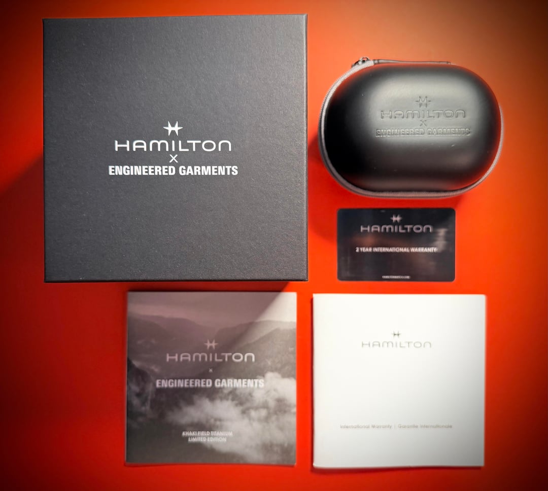 Limited Edition piece alert! Hamilton x Engineered Garments Khaki Field watch in 36mm. Watch is constructed out of titanium and is extremely light and durable, making it ideal as a daily piece. As noted in the intro, the watch was released as a limited edition collaboration between Hamilton and NYC based Japanese designer Daiki Suzuki of Engineered Garments. The watch comes fully with all box, manuals and papers. Price is $1,700 - sale and US only please.