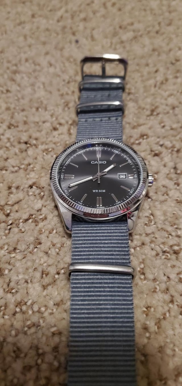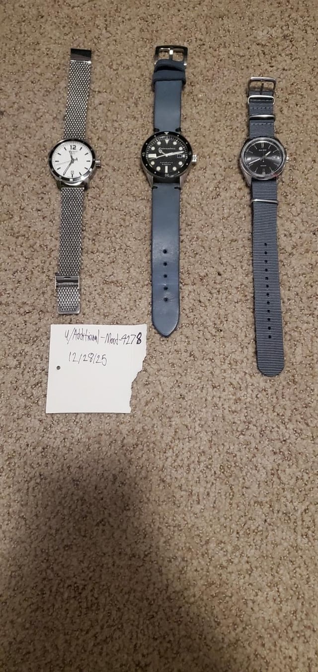 For sale are three watches I purchased separately from this sub years ago. I bought them all using an old account (u/HighGroundSand) that I have since deleted, because I wanted to get off Reddit; but just when I thought I was out, r/Watchexchange pulled me back in! From left to right: *Tissot Quickster (****$150 shipped****):* Barely worn, just didn’t end up being my thing. The sapphire crystal is perfect, the case has some mild scuffing but nothing too bad. Decent WatchGecko stainless steel mesh bracelet. I added this after I got the watch, since the bracelets these come with are terrible, and imo the mesh is an improvement. The clasp/buckle has a notable scuff on it which I’ve tried to capture in its own picture. Needs a new battery. 40mm, quartz movement *Spinnaker Cahill (****$200 shipped****):* Worn well but still in pretty good shape, with the exception of a notable scratch on the mineral crystal that is otherwise double domed and looks great. I tried to get a good picture of the scratch in the closeup image, you can see it above the ‘S’ in Spinnaker. Miyota 8125 movement is nothing special, and unfortunately does not have hacking, although it runs well, and features a decorated rotor with a display caseback. The 43mm case is in great shape, and the strap is a cheap but decent aftermarket 22mm baby blue (I think fake) leather strap with quick release springbars. *Casio MTP-1302D-1A2 (****$40 shipped****):* Barely worn, like-new, great Datejust look-alike. This one made me realize sub-40mm watches just don’t agree with my big wrists! Has a very nice dark gray sunburst dial that the lighter gray NATO complements well. Needs a new battery. 38.5mm, quartz movement. Not certain about strap size but I’m pretty sure it’s 20mm. **$325 TAKES ALL, SHIPPED**