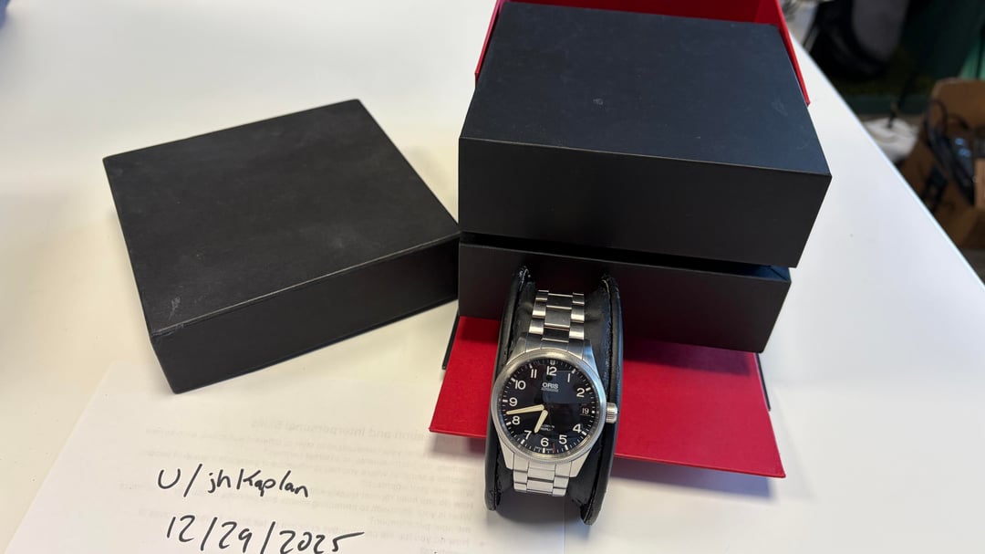 Up for sale is my **Oris Big Crown ProPilot Big Date 41mm** with the black dial on the OEM stainless steel bracelet. **Ref:** 01.751.7697.4164.07.8.20.19 **The Watch:** The ProPilot is one of the best modern pilot watches at this price point. 41mm case with that signature turbine-style fluted bezel—functional, aviation-inspired design without being too flashy. The oversized screw-down crown is easy to grip (even with gloves if you're actually flying), and the domed sapphire on both sides with inner AR coating keeps it super legible. Black dial with lumed Arabic numerals and that big date window at 3 o'clock. Runs on the Oris 751 (Sellita SW 220-1 base)—reliable workhorse with 38hr power reserve. **Specs:** * 41mm diameter / \~13mm thick / 49mm lug-to-lug * Stainless steel case, brushed * Domed sapphire crystal (both sides, AR inside) * Oris Cal. 751 automatic * 100m water resistance * Black dial, SuperLuminova hands/indices **Condition:** Pre-owned, purchased November 2016. Shows honest wear from being part of the rotation—some light scratches on the case and bracelet clasp. Crystal is clean. Keeps good time, no issues. **Includes:** * Watch on OEM stainless steel bracelet (currently sized for \~7.25" wrist) * Extra links * Warranty card (dated 11/29/16, no longer under warranty) * Inner and outer box (some damage/wear to inner box) **Price:** **$950 shipped** CONUS. PayPal F&F, Zelle, or Venmo (with references), G&S +3% with no references. Not looking for trades. Happy to answer questions or send more pics/video. Thanks for looking! **Timestamp:** \[[Timestamp Link](https://preview.redd.it/wts-oris-big-crown-propilot-big-date-41mm-black-dial-on-v0-6hbofsp9c6ag1.jpg?width=1080&crop=smart&auto=webp&s=c86d57fdf7917c28820cfade26c37269fdb87ba8)\]