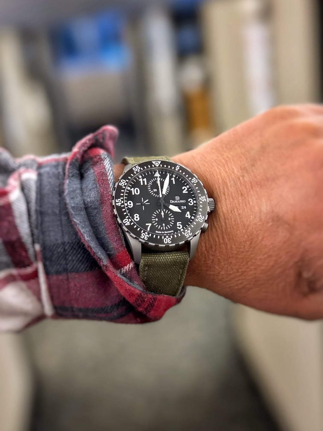 I have thoroughly enjoyed this watch - Wears extremely comfortable and looks great on just about anything I put on it but will come with the Damasko Pilot leather strap Best crown and bezel action I have experienced in decades in the hobby 42mm case 22mm lugs and 13.9 height 100M WR and the awesome VAL7750 movement Ice hardened case is no joke no marks that I can see and bezel and crystal are clean Asking $1500 USD conus