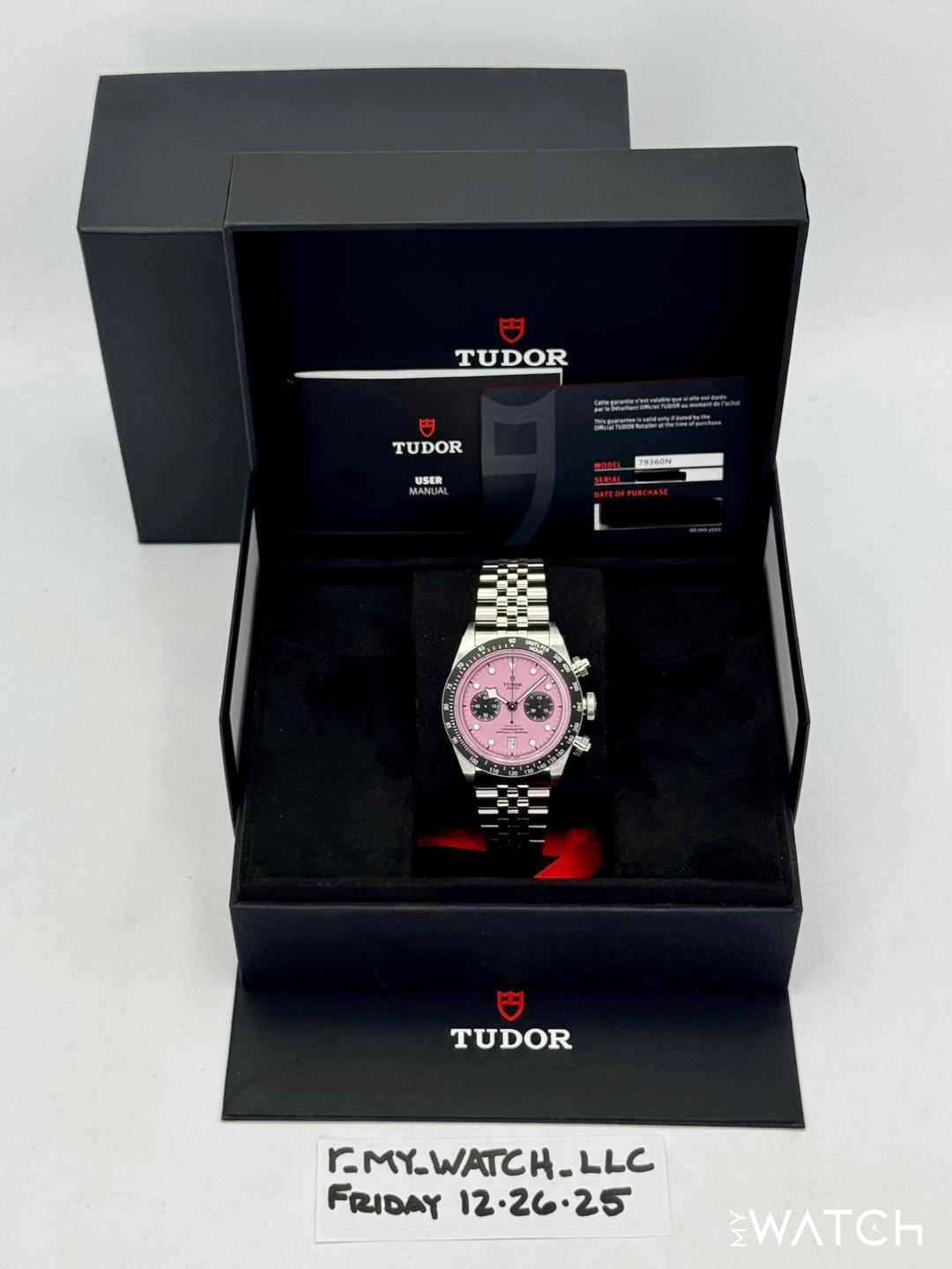 🔵NEW 2025 Tudor Black Bay Chrono 41mm 79360N Stainless Steel Pink Dial 🔵TRADE or SELL us your luxury watch, all brands considered. Message me details. Includes the following: ✔️Original Tudor Double boxed ✔️Box and Papers - Yes ✔️Warranty card dated December 2025 ✔️5 year manufacturer warranty ✔️Manual and Warranty booklets ✔️White Hang Tag included ✔️Size: 8.5inch wrist (Full Links) ✔️Watch is BRAND NEW/UNWORN ✔️Trades welcome Business Name: My Watch LLC LOCATION: Oak Park, Michigan [✔️MyWatchLLC.com](http://✔️MyWatchLLC.com) for current inventory ✔️Google Business Listing [https://g.co/kgs/Cmd6FPW](https://g.co/kgs/Cmd6FPW) ✔️Business Hours M-F 9-6 ✔️Facetime/Video chat/calls welcome to view the watch interested. ✔️Contact: 248-422-0909 via text or call for quickest response. 🟢TERMS: Visit [MyWatchLLC.Com](http://MyWatchLLC.Com) for payments accepted 🟢REFERENCES/REVIEWS: We are well reviewed on all platforms from google, trust pilot, rolexforums, additionally we have 300+ reference in multiple FaceBook watch groups, reference checks welcome. 🟢SHIPPING: If you are not local, we offer Fully Insured FedEx overnight shipping in the USA for a fee. International shipping available. [https://mywatchllc.com/products/new-2025-tudor-black-bay-chrono-41mm-79360n-pink-dial-2](https://mywatchllc.com/products/new-2025-tudor-black-bay-chrono-41mm-79360n-pink-dial-2)