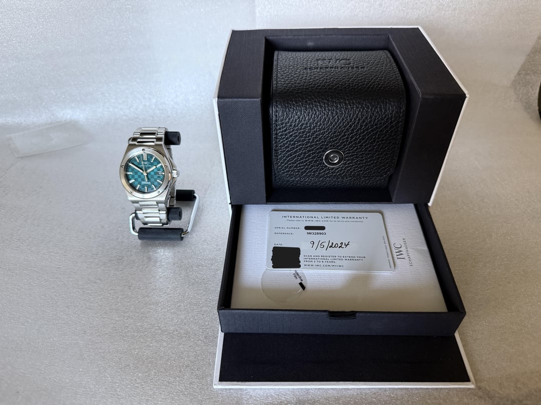 Hey All, Selling my beautiful IWC Ingenieur with the aqua dial, reference IW328903. I absolutely love the color and texture of this piece and think this will be a future grail for many. It just sits in my drawer however as I never really wear nice timepieces anymore. Figured I'd pass it along to someone else who will get some use out of it. Registered in September of 2024 with a warranty good until September 3, 2032. Comes with the original box, papers, warranty card, etc. I'd give it a 9 in condition as with any piece with polished steel piece, there are some tiny hairlines on the middle links though only visible in the right lighting. I'm being really conservative on condition and personally would rate it higher on par with Japanese used pieces as I take care of my stuff. The crown and glass are flawless otherwise. Selling for $8850 net to me. I can give a little discount if you're local to the California Bay Area. Feel free to reach out with questions! Not accepting watch trades currently, as I'm downsizing.