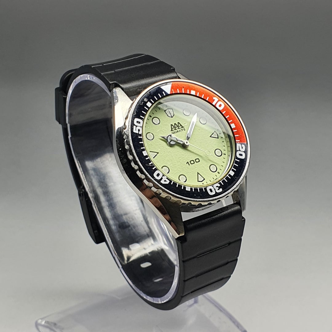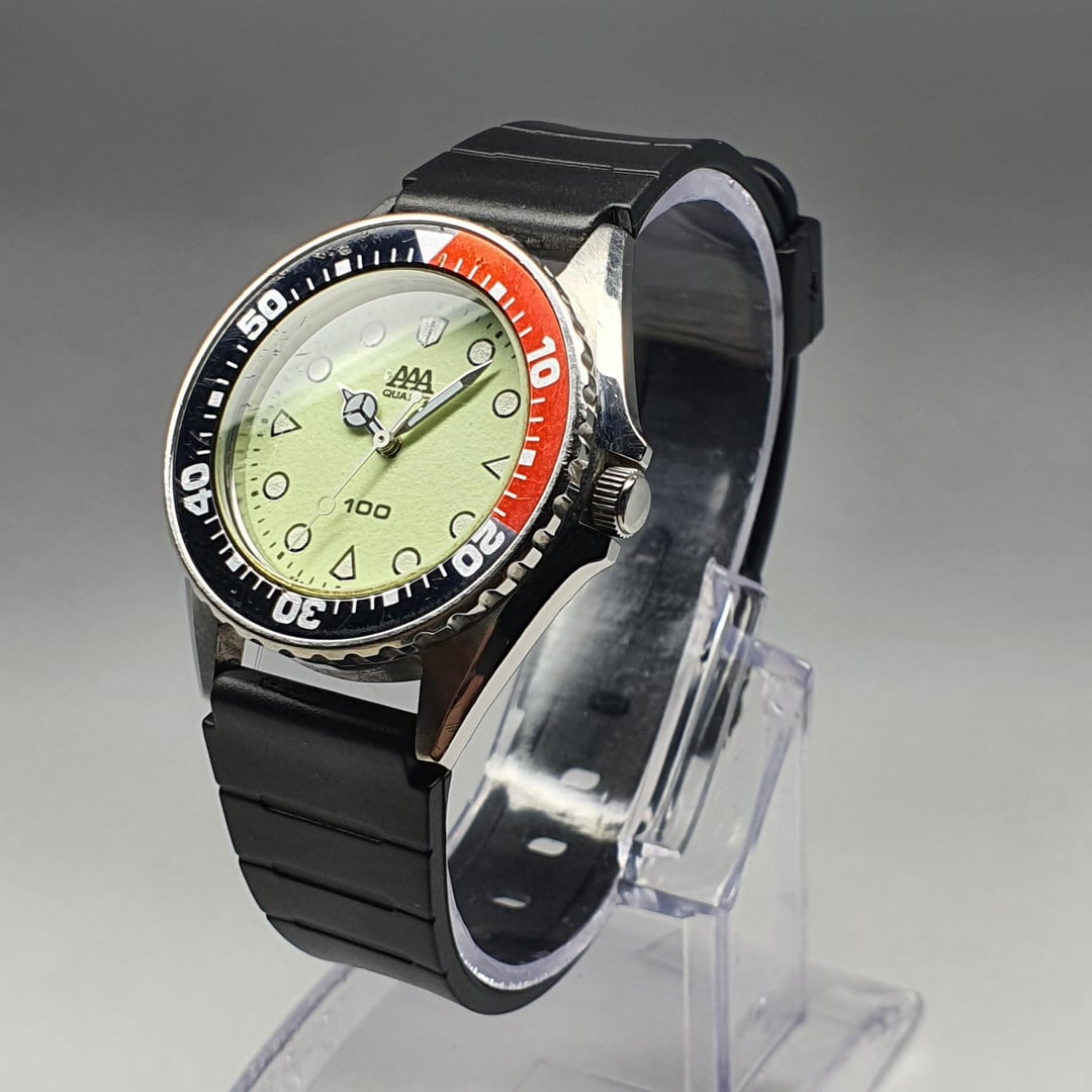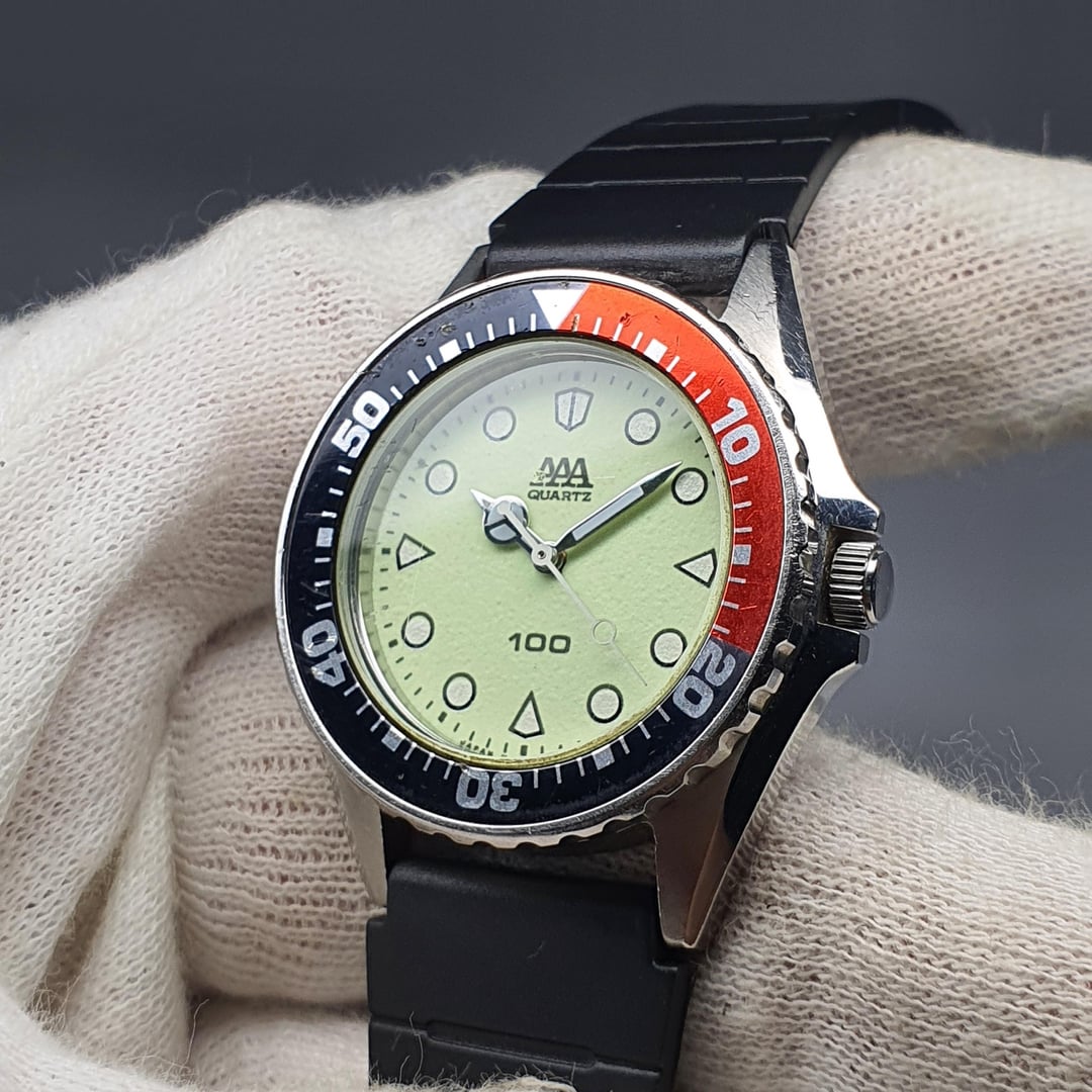 Hey WatchEx! For sale is this Orient "AAA" mid-size diver made in Japan in circa late 1980s. There is not much known about the AAA sub-brand by Orient but the logo is arguably better than the Orient logo (depending on the person). AAA watches were only sold in the Asian market. The build quality is very decent as you would expect from a Japan-made watch from the 1980s. Seiko went on to buy Orient in 2009, although Orient have been making watches since 1951. This model, reference number 5FM301, has a full-luminous dial that still glows brightly at first although fades fairly quickly due to ageing. The indices are a combination of dive circles and triangles that pair with the Mercedes hands. The seconds hand is not missing a lume plot, I've seen other sellers of this watch that exhibit the same seconds hand and it hits every marker satisfyingly. The bezel is a ratcheting 60-click bi-directional rotating bezel that feels good and precise. The bezel insert is an aluminium "coke" black and red dive bezel. The case is actually very nice with a brushed top surface and polished sides. It has a slim profile with some beautiful angles and dimensions to the point where I feel like Orient should release this in a larger size. It houses the Orient calibre 5FB movement that works great. Although this is a 100m diver, as with all vintage watches, they should be treated as if they have no water resistance unless professionally re-tested. The watch is mid-size which means it would suit those with a smaller wrist (watch size is personal preference but I would suggest a wrist of 6 inches or below unless you like a small watch). For reference, my wrist (pictured) is 6 inches (15cm). The watch is in great condition considering it was made around 30-40 years ago with only minor general wear on the case and a few small scratches on the crystal. The dial is virtually spotless. Looking for $99 net (buyer pays Paypal/Wise fee) + shipping Dimensions are: Case: 33mm, Case(inc. crown): 34.4mm, Bezel: 31mm Lug to Lug: 38.4mm, Thickness: 8.8mm, Lug Width: 16mm (roughly measured) Bought in Japan. \*Returns accepted but all return postage costs are the buyer's responsibility in all circumstances and any re-import fees that I have to pay when receiving the watch will be deducted from the refund amount.