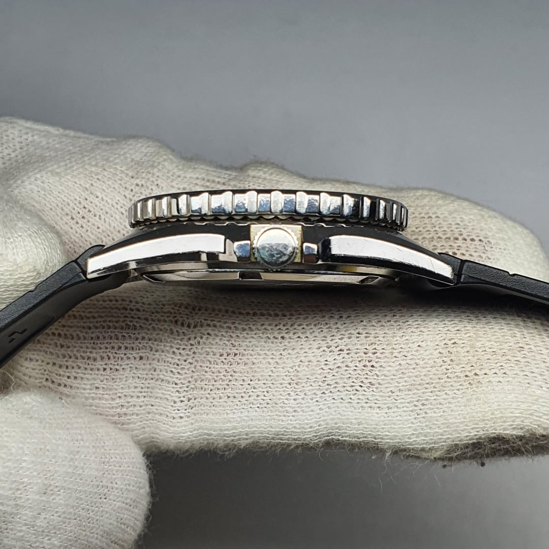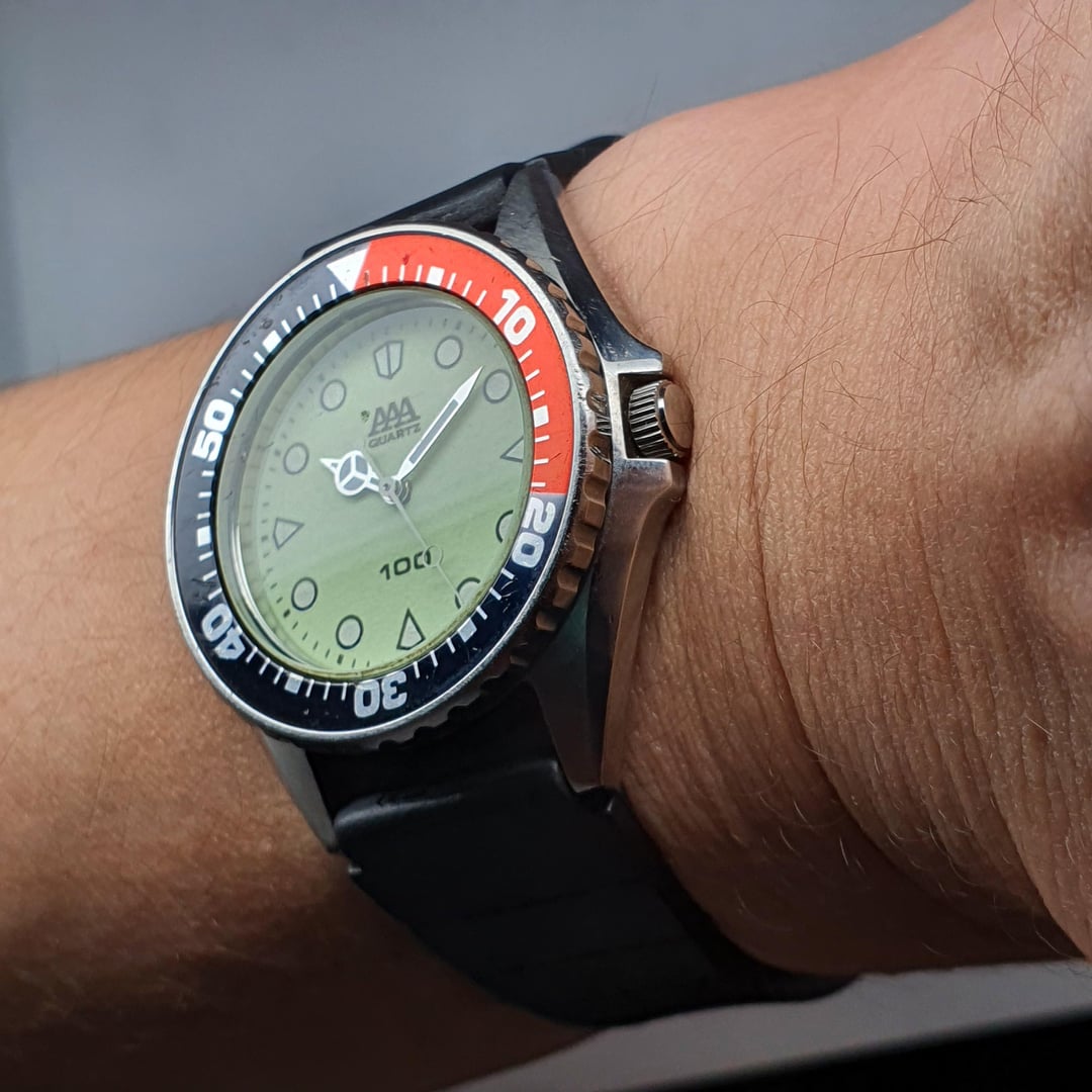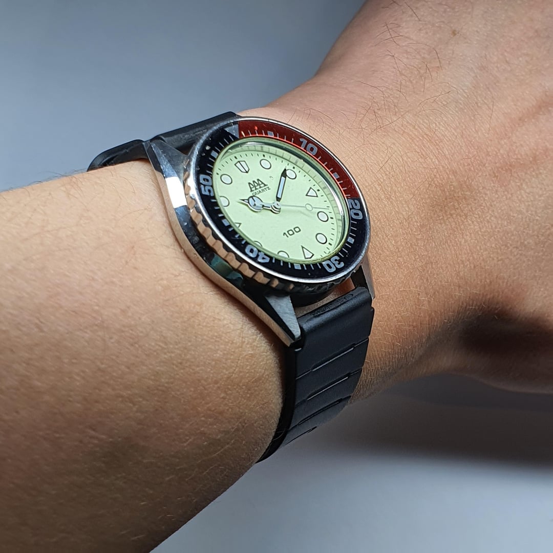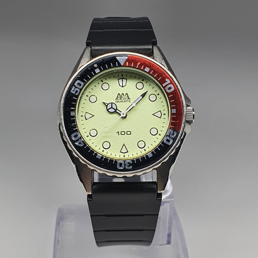 Hey WatchEx! For sale is this Orient "AAA" mid-size diver made in Japan in circa late 1980s. There is not much known about the AAA sub-brand by Orient but the logo is arguably better than the Orient logo (depending on the person). AAA watches were only sold in the Asian market. The build quality is very decent as you would expect from a Japan-made watch from the 1980s. Seiko went on to buy Orient in 2009, although Orient have been making watches since 1951. This model, reference number 5FM301, has a full-luminous dial that still glows brightly at first although fades fairly quickly due to ageing. The indices are a combination of dive circles and triangles that pair with the Mercedes hands. The seconds hand is not missing a lume plot, I've seen other sellers of this watch that exhibit the same seconds hand and it hits every marker satisfyingly. The bezel is a ratcheting 60-click bi-directional rotating bezel that feels good and precise. The bezel insert is an aluminium "coke" black and red dive bezel. The case is actually very nice with a brushed top surface and polished sides. It has a slim profile with some beautiful angles and dimensions to the point where I feel like Orient should release this in a larger size. It houses the Orient calibre 5FB movement that works great. Although this is a 100m diver, as with all vintage watches, they should be treated as if they have no water resistance unless professionally re-tested. The watch is mid-size which means it would suit those with a smaller wrist (watch size is personal preference but I would suggest a wrist of 6 inches or below unless you like a small watch). For reference, my wrist (pictured) is 6 inches (15cm). The watch is in great condition considering it was made around 30-40 years ago with only minor general wear on the case and a few small scratches on the crystal. The dial is virtually spotless. Looking for $99 net (buyer pays Paypal/Wise fee) + shipping Dimensions are: Case: 33mm, Case(inc. crown): 34.4mm, Bezel: 31mm Lug to Lug: 38.4mm, Thickness: 8.8mm, Lug Width: 16mm (roughly measured) Bought in Japan. \*Returns accepted but all return postage costs are the buyer's responsibility in all circumstances and any re-import fees that I have to pay when receiving the watch will be deducted from the refund amount.