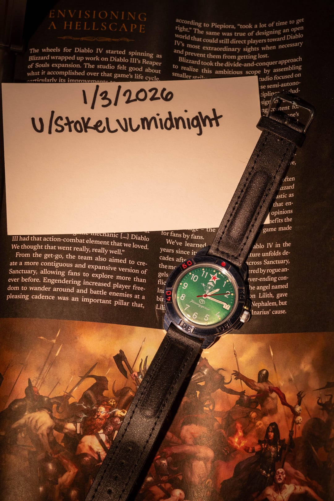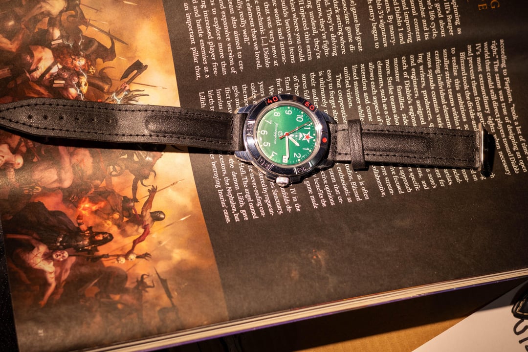 **Price:** $90 Shipped in the US. **Condition:** Excellent, ordered this watch after watching severance and worn once around the house. **Specs:** Acrylic Crystal, Leather Strap, Vostok 2414A (manual winding) movement, Water Resistant 20 Meters.