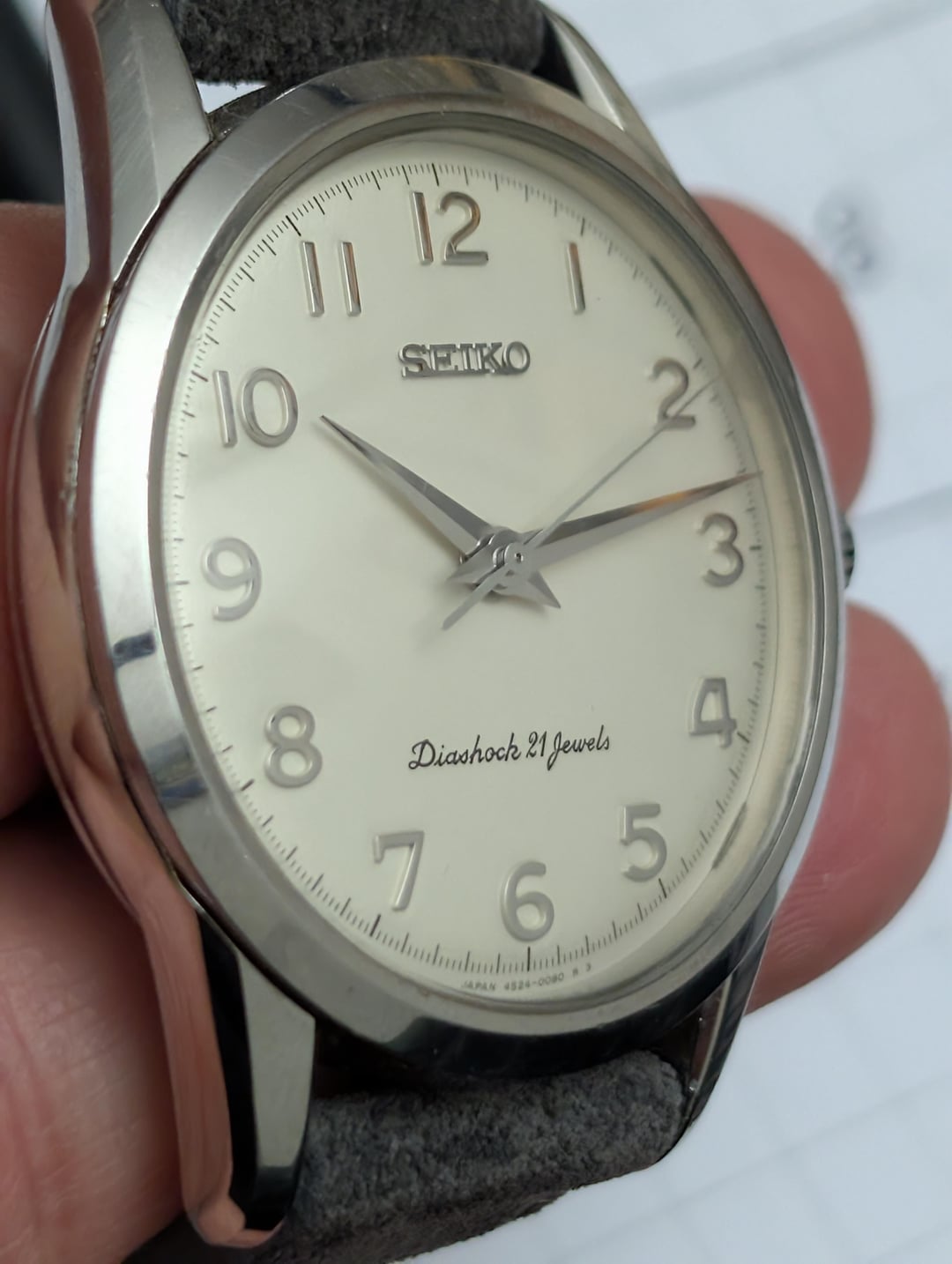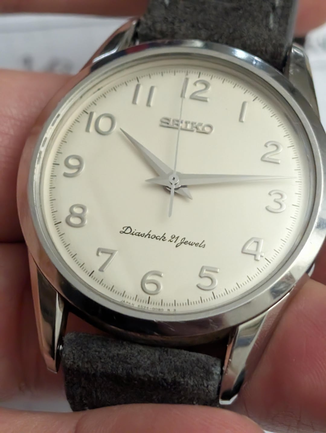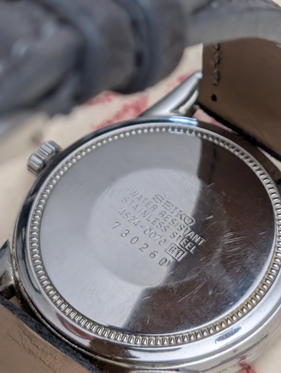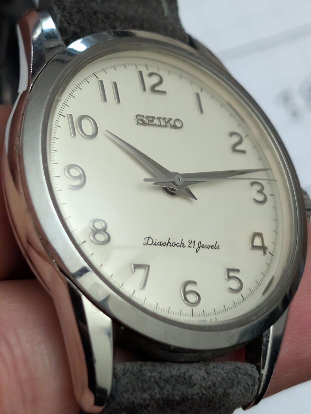 FS: Seiko SCVG007 - 1998 Relatively rare 4S24 hand-winding movement - Arabic numeral indices - Time Only - Free Ship to USA For Sale: $545 Price includes trackable shipping via USPS Ground Advantage to USA. Shipping to other countries to be paid by buyer. Sale only, no trades Timestamp: [https://imgur.com/a/fgDG58x](https://imgur.com/a/fgDG58x) Charming Seiko hand-winding model with Arabic numeral indices. 4S24 Movement. Hacking. Time only - NO day/date. Good condition; some light marks on lugs, caseback, note pictures. Clean, crisp dial with all 12 numeric indices, line minute markers. Crystal is in good shape. Watch on generic aftermarket band. Nicely sized and very appealing proportions. Numeric indices can appear very shiny or matte depending on angle of watch to light/eye. Watch runs well, no issues. Lug width: 18mm 36mm dial with 43.5mm lug to lug Crown at 3 o'clock position Dial Code: 4S24 0080 Case Code: 4S24 0070 I am a private collector of watches. I have sold several watches and accessories through Watchuseek and Reddit, and many more watches and bracelets through eBay (120+ transactions),and will provide references upon request. Let me know if you have any questions. All sales final.