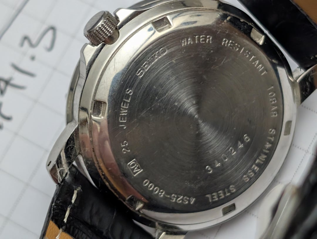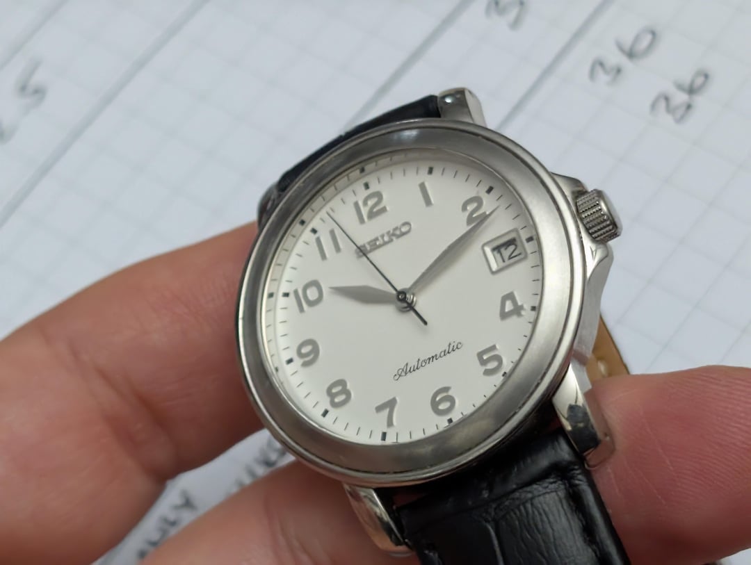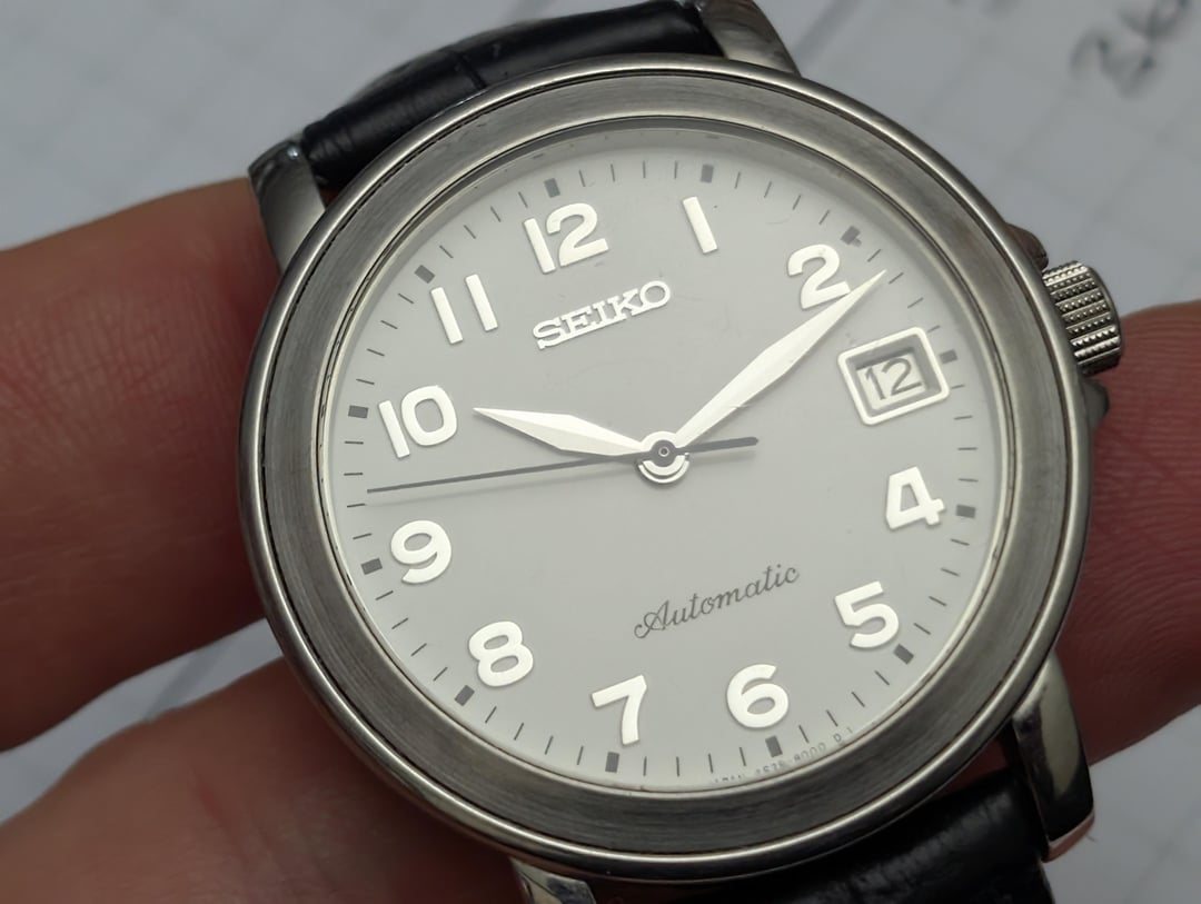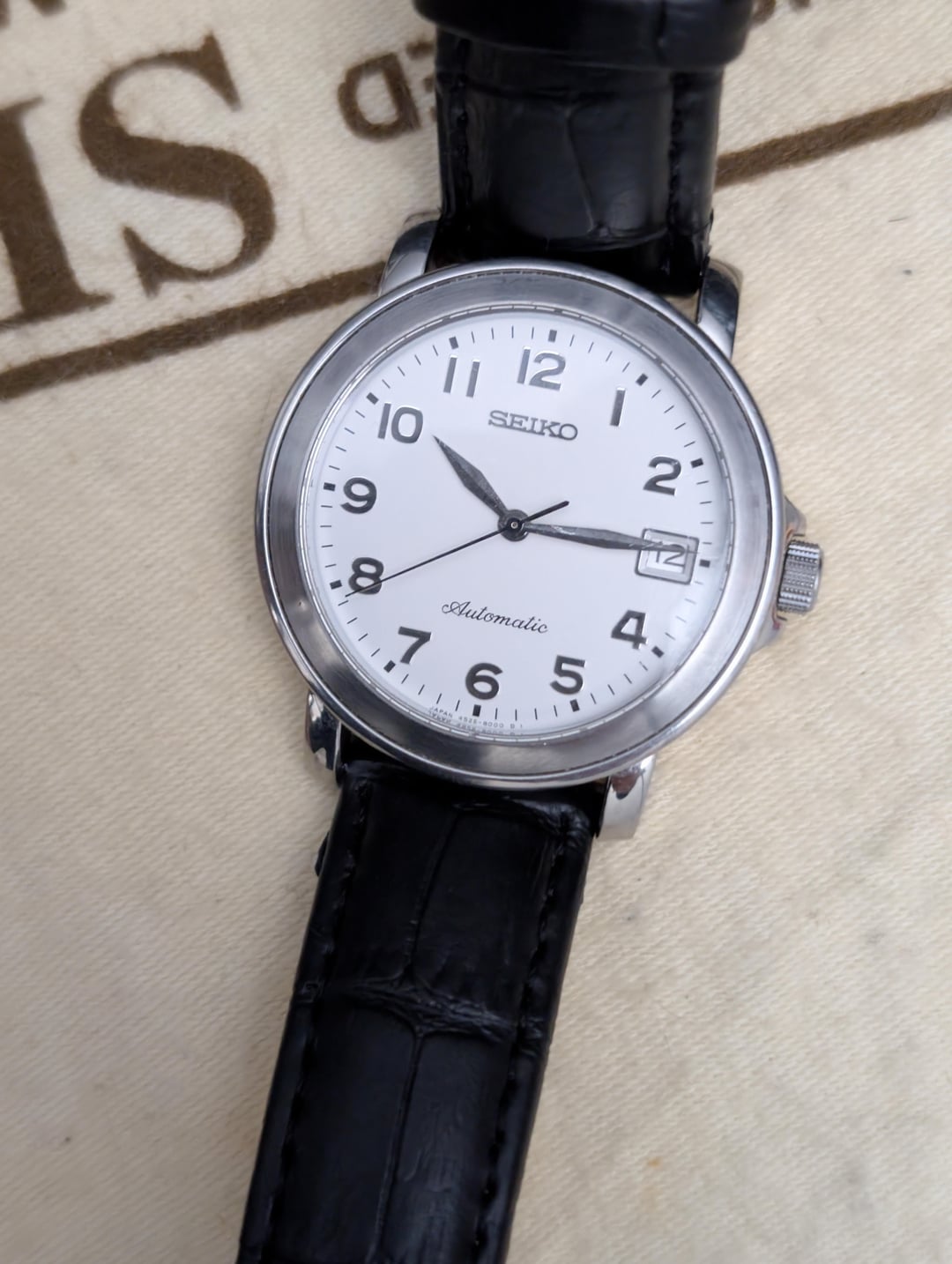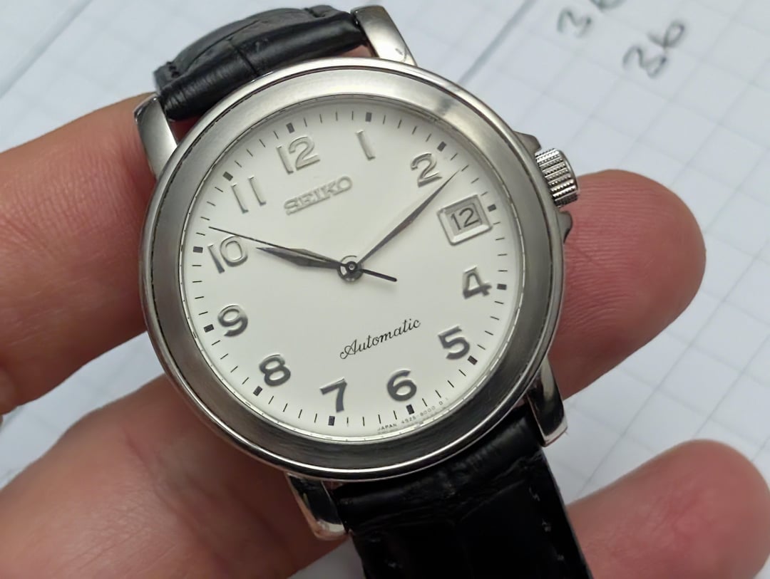FS: Seiko SCVJ001 Rare model from 1994 - Arabic numeral indices with high-end 4S25 Movement - Free Ship to USA For Sale: $395 Price includes trackable shipping via USPS Ground Advantage to USA. Shipping to other countries to be paid by buyer. Sale only, no trades Timestamp: [https://imgur.com/a/oIBWdm5](https://imgur.com/a/oIBWdm5) Unique Seiko from 1994. 4S25 Movement. Hacking. Date with quickset. Quickset works well. Case and crystal in good shape; a few scratches on caseback and sides of case. Nicely sized and very appealing proportions. Numeric indices can appear very shiny or matte depending on angle of watch to light/eye. Watch runs well, no issues. On aftermarket leather band. Drilled lugs. Lug width: 18mm 36mm dial with 41mm lug to lug Crown at 3 o'clock position Dial Code: 4S25 8000 D1 Case Code: 4S25 8000 I am a private collector of watches. I have sold several watches and accessories through Watchuseek and Reddit, and many more watches and bracelets through eBay (120+ transactions),and will provide references upon request. Let me know if you have any questions. All sales final.