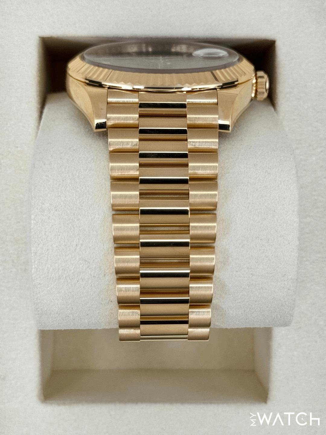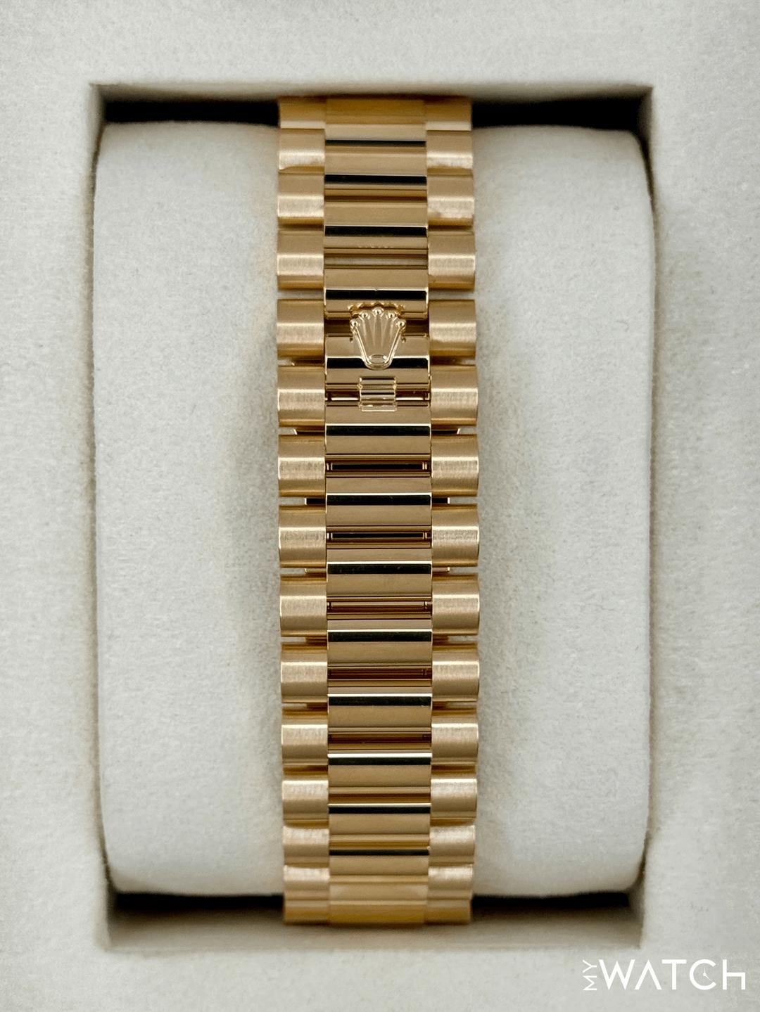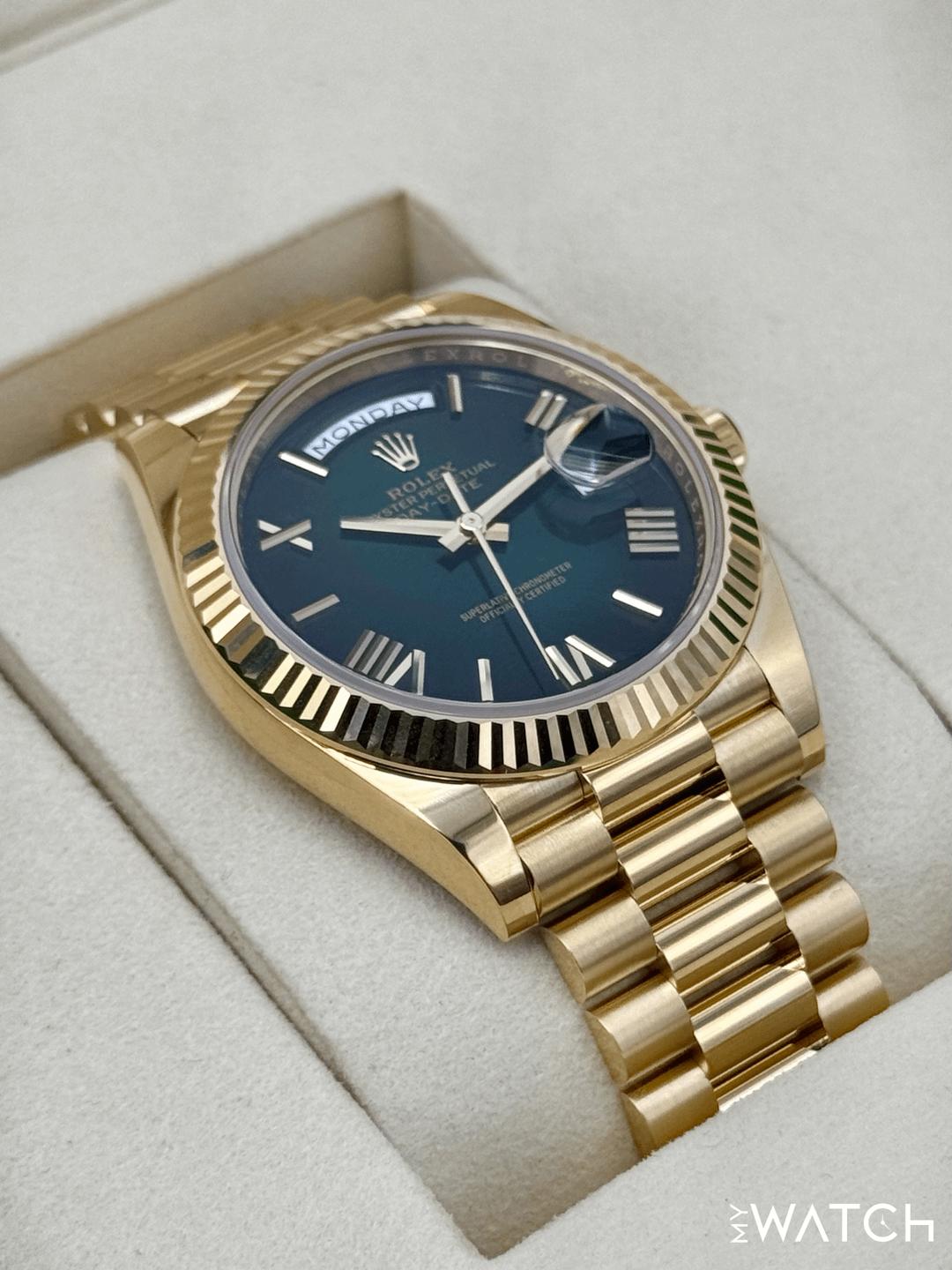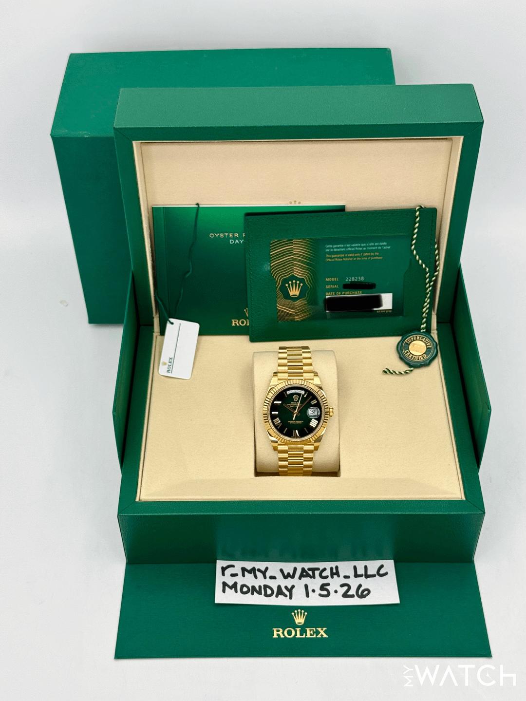 🔵**NEW 2025 Rolex Day-Date 40mm 228238 Presidential 18kt Yellow Gold Green Ombre Dial** 🔵**TRADE or SELL us your luxury watch, all brands considered. Message me details.** **Includes the following:** **✔️BRAND NEW 2025 UPDATED ROLEX BOX (Double Boxed)** **✔️Box and Papers - Yes** **✔️Warranty card dated 2025** **✔️5 year manufacturer warranty** **✔️Manual and Warranty booklets** **✔️Green and White Hang Tags included** **✔️Material:18kt Yellow Gold** **✔️Size: 7.75inch wrist (Full Links)** **✔️Watch is BRAND NEW/UNWORN** **✔️**[**Trades**](https://mywatchllc.com/pages/sell-rolex-watch) **welcome** Business Name: **My Watch LLC** LOCATION: Oak Park, Michigan ✔️[MyWatchLLC.com](http://mywatchllc.com/) for current inventory ✔️Google Business Listing [https://g.co/kgs/Cmd6FPW](https://g.co/kgs/Cmd6FPW) ✔️Business Hours M-F 9-6 ✔️Facetime/Video chat/calls welcome to view the watch interested. ✔️Contact: 248-422-0909 via text or call for quickest response. 🟢TERMS: Visit [MyWatchLLC.Com](http://mywatchllc.com/) for payments accepted 🟢REFERENCES/REVIEWS: We are well reviewed on all platforms from google, trust pilot, rolexforums, additionally we have 300+ reference in multiple FaceBook watch groups, reference checks welcome. 🟢SHIPPING: If you are not local, we offer Fully Insured FedEx overnight shipping in the USA for a fee. International shipping available. [https://mywatchllc.com/products/new-2025-rolex-day-date-40mm-228238-presidential-green-ombre-dial](https://mywatchllc.com/products/new-2025-rolex-day-date-40mm-228238-presidential-green-ombre-dial)