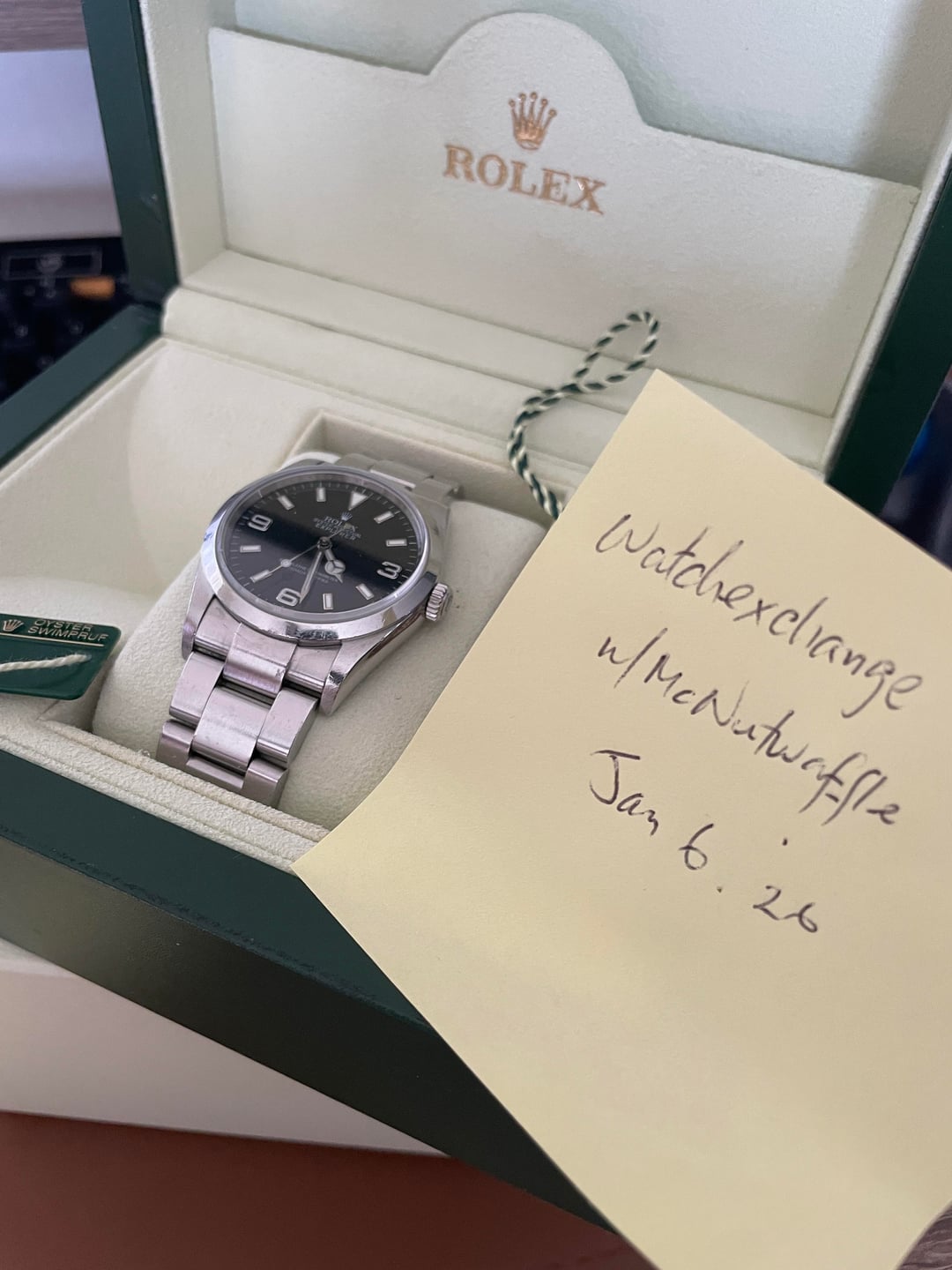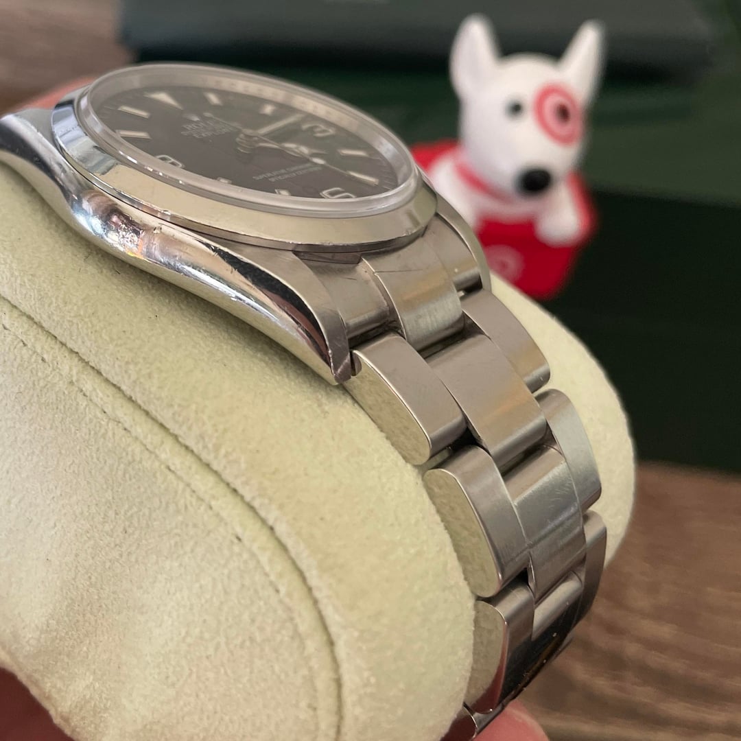 Timestamp: [https://i.imgur.com/Yz3U4ty.jpeg](https://i.imgur.com/Yz3U4ty.jpeg) Album: [https://imgur.com/gallery/114270-z-qzjRLcZ?s=sms](https://imgur.com/gallery/114270-z-qzjRLcZ?s=sms) Price: **$6125 net (accept offers, NO TRADES)** Terms: PayPal G&S, Zelle Shipping: Free CONUS only via FedEx 2-day from Southern California * Rolex Explorer ref. 114270. * Z serial number, circa 2008. * Engraved rehaut * SuperLuminova (green) * Triple-boxed * 4/2008 card * Booklets, matching serial hang tags * 6+5 links for perfect 7" fit with one micro-adjustment left. * Running +15 seconds Overall, I'd rate this 7/10. Tiny flea bite at 7 minutes, scratches, minor dings, and desk-diving throughout the watch (please see pics). The previous owner had polished the watch and bracelet somewhat--not to a high shine but you can tell the factory brushing and matte finish are more reflective. It's not bad, but it's apparent. Edges are still sharp. Was also told that the watch was recently serviced, but I have no service papers, just a normal amplitude reading on my timegrapher. I can get my watchmaker to regulate on a full-price offer. Solid feedback, references, and years of A+ transactions. If I missed anything or if you have further questions, just message. Comment before messaging. Your friend, *McNutWaffle*