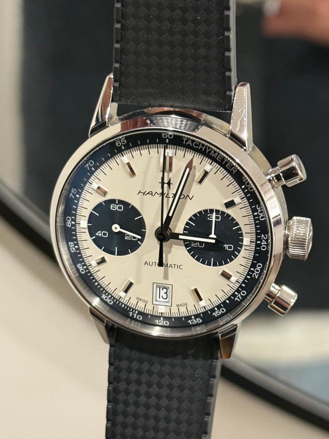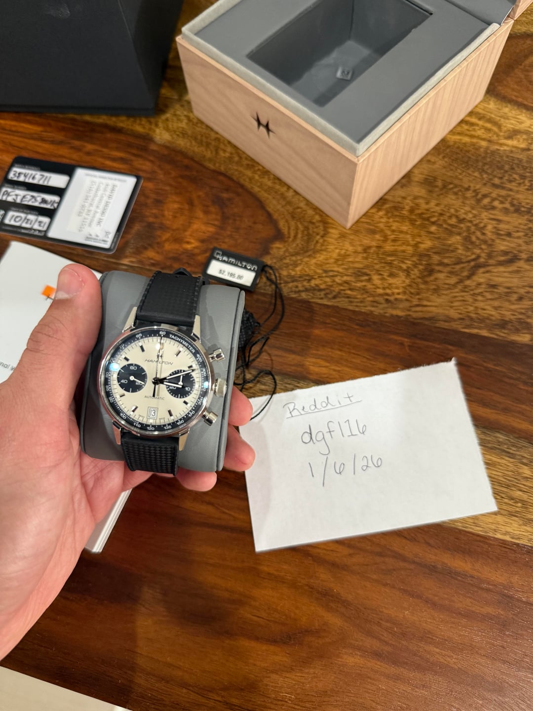 Up for sale is a Hamilton American Classic Intra-Matic Auto Chronograph, reference H38416711, in mint condition. Asking $1375 The watch comes as a full set, including the original box, papers, warranty card, and original strap. The case and crystal are clean with no dents, chips, or scratches noted, and the watch has never been serviced and is running excellent. This model features a 40mm case and is powered by Hamilton’s H-31 automatic chronograph movement. Payment via Zelle, Venmo, or bank wire is accepted. PayPal Goods & Services is also available if the buyer prefers and covers the 3% fee. Price includes fully insured CONUS shipping. Timestamp and full photo set are available in the linked Imgur album below: https://imgur.com/a/anbUJ1T