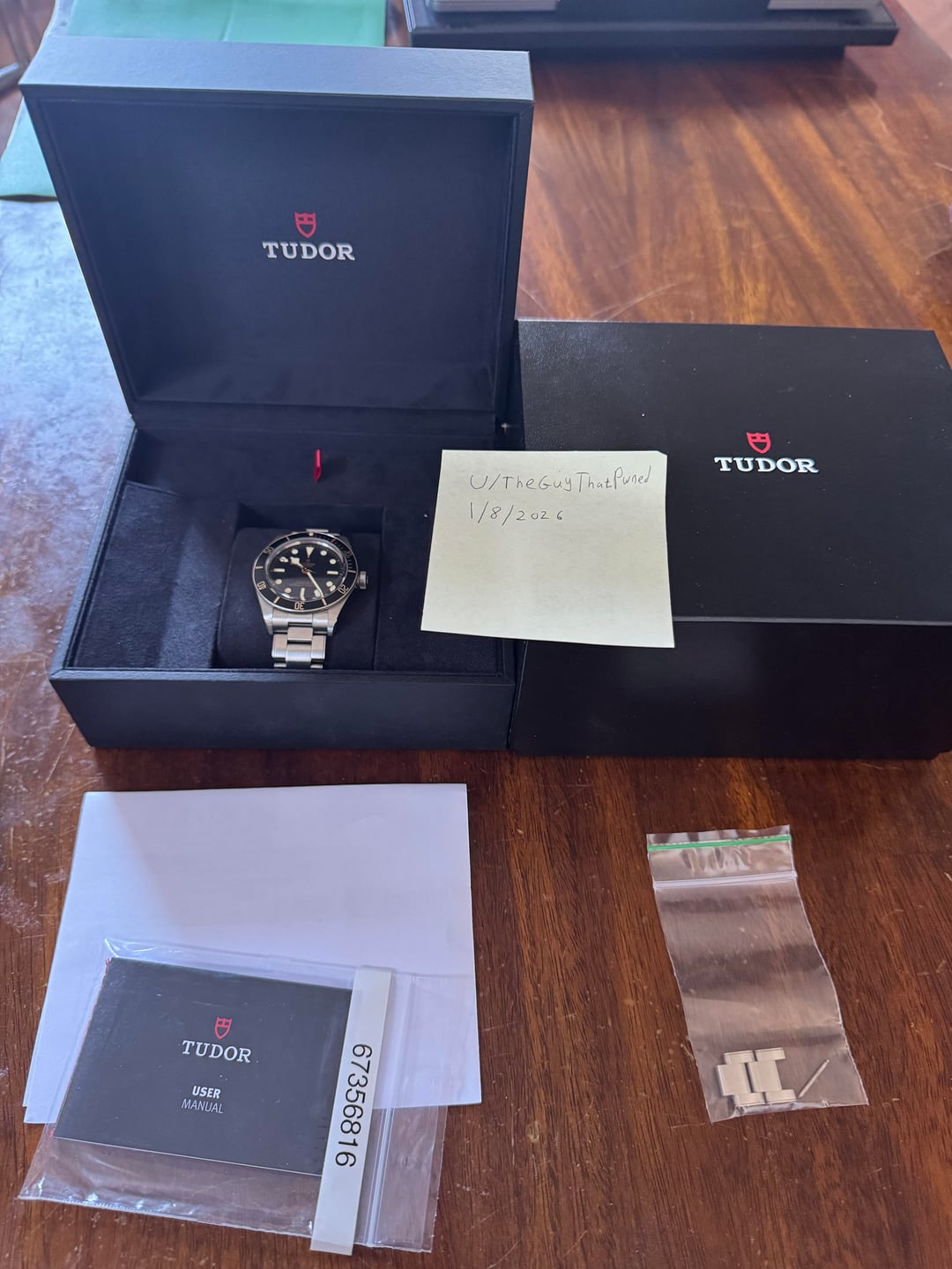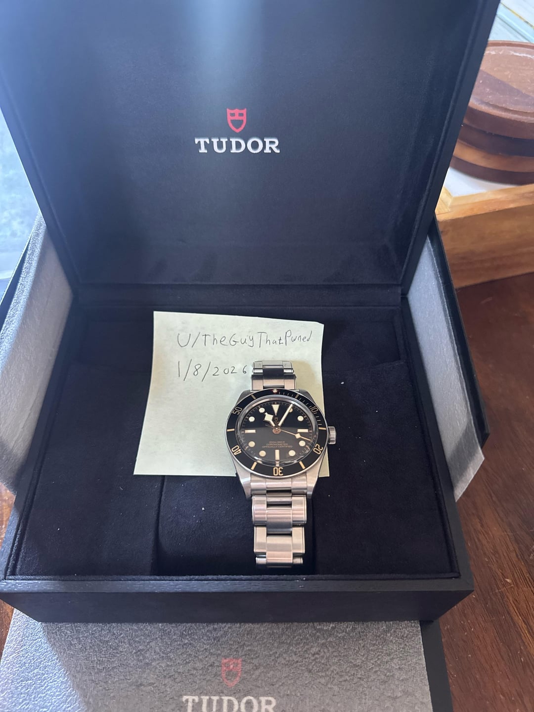 For sale is my Tudor Black Bay 58. I'm asking $2850. I purchased this watch from London Jewelers in NYC in December of 2023. This comes with the full set, which includes: the watch, extra links, original boxes, manual, and warranty card. Will pay for shipping (US), also happy to meet locally in NYC. I'll gladly FaceTime to show the watch. UPDATE: I just facetimed with a potential buyer who noticed a discrepancy in my warranty card. It has an incorrect model number, which I'm working with London Jewelers to fix. I will update here once this has been sorted out.