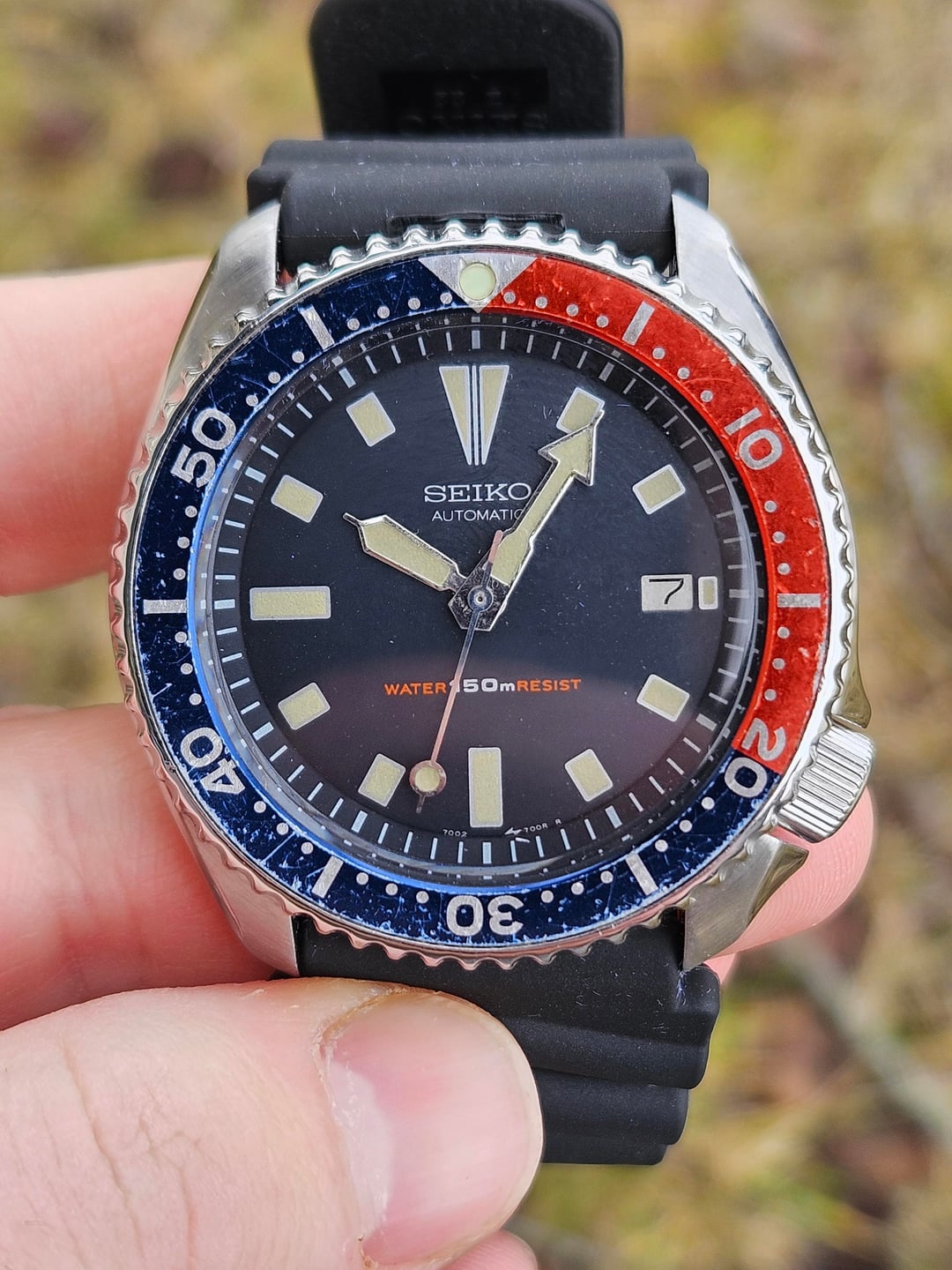 Hey there! For sale is my Seiko 7002-7001 from 1993. The watch is in good condition, and I’m happy to provide more details. Internally the watch is keeping fairly good time for its age. The bezel action is nice, and the day/date function works as it should. The only thing to note is that the crown only has about one quarter of a turn worth of threads that it catches. The issue is on the case side, meaning it needs a new crown tube. The crown will bite and has not popped open on it’s own. Timestamp: [https://imgur.com/a/LJQ6i03](https://imgur.com/a/LJQ6i03) Asking $150 which includes insured CONUS shipping. PayPal or Zelle. No trades. Thanks for looking!