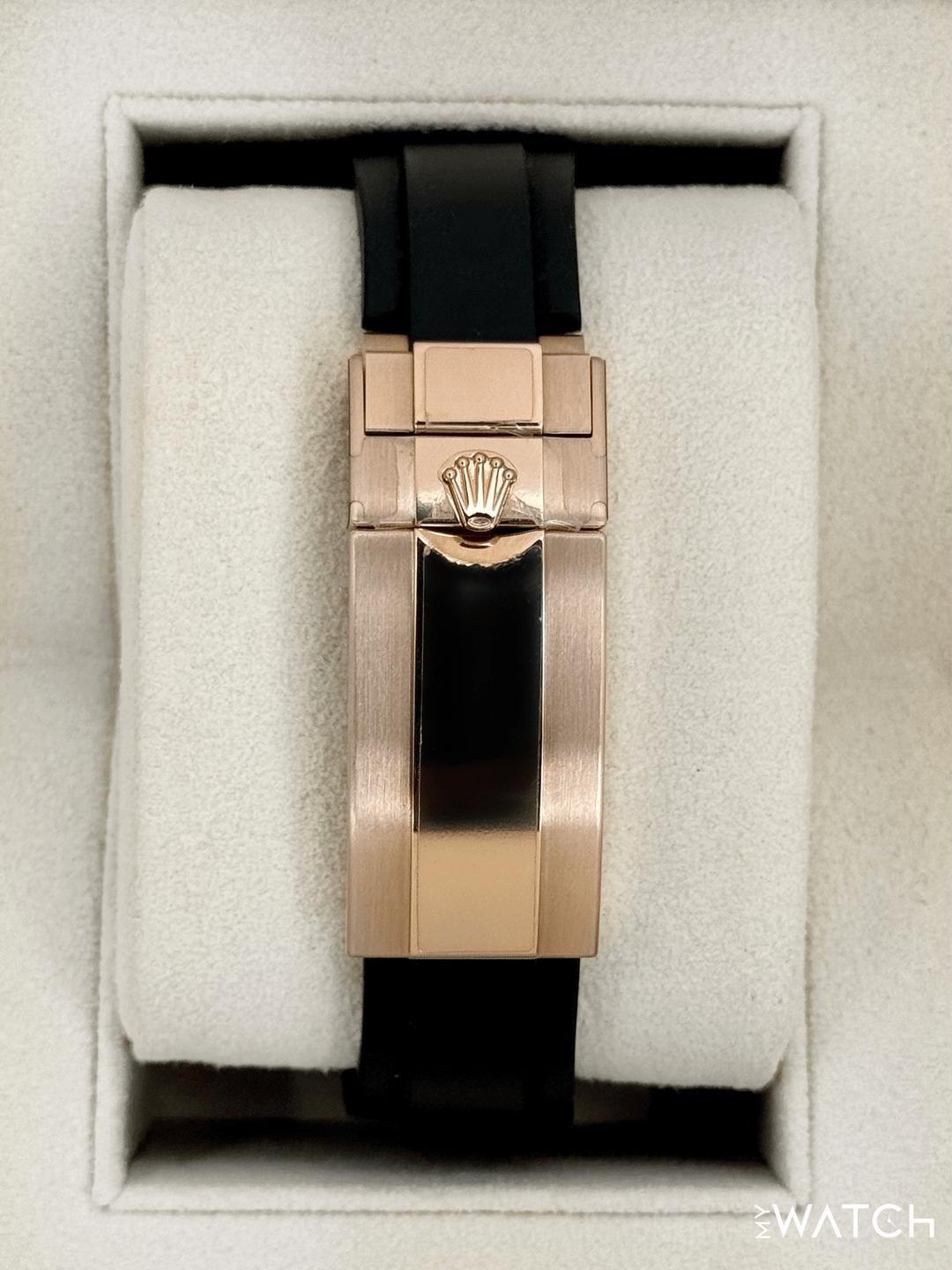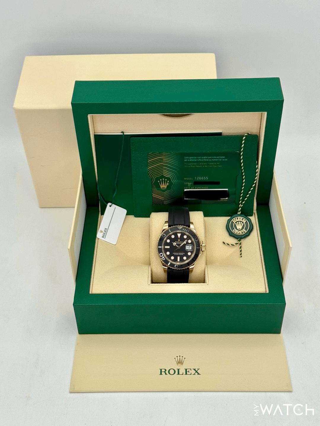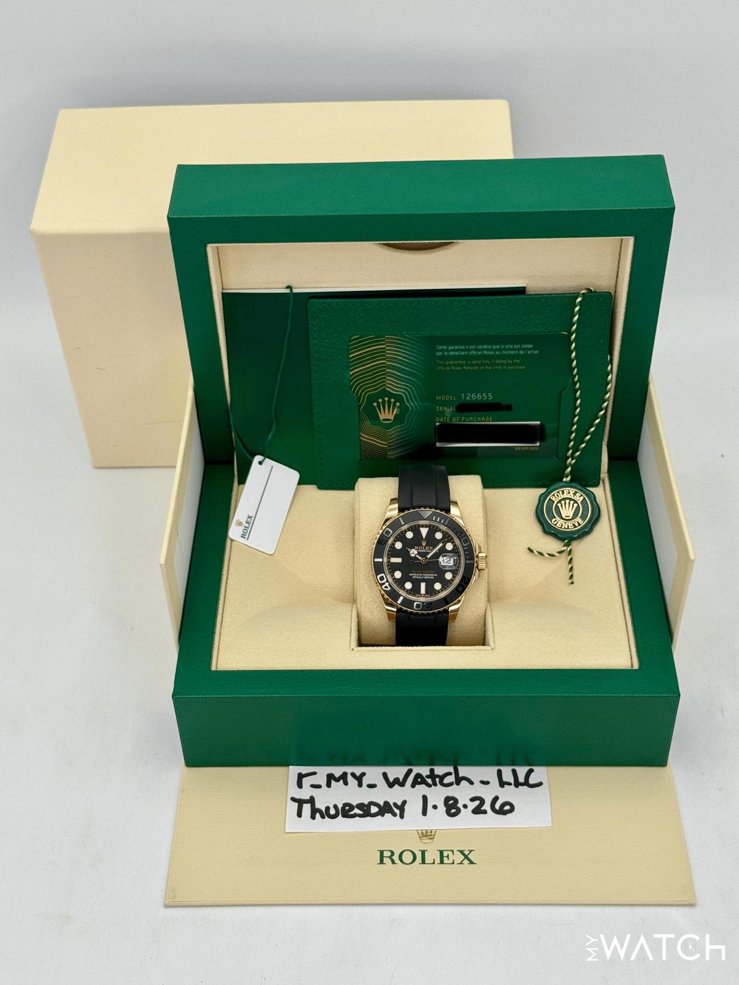 🔵**2023 Rolex Yacht-Master 40mm 126655 18kt Rose Gold Oysterflex Black Dial** 🔵**NOTE: Watch still has factory stickers on the clasp** 🔵**TRADE or SELL us your luxury watch, all brands considered. Message me details.** **Includes the following:** **✔️Original Rolex Double Boxed** **✔️Box and Papers - Yes** **✔️Warranty card dated August 2023** **✔️5 year manufacturer warranty** **✔️Manual and Warranty booklets** **✔️Green and White Hang Tags included** **✔️Size: 7.0inch - 7.5inch wrist (Oysterflex)** **✔️Additional straps available. Please inquire before purchase** **✔️Watch is in excellent overall condition. Please see photos for details.** **✔️**[**Trades**](https://mywatchllc.com/pages/sell-rolex-watch) **welcome** Business Name: **My Watch LLC** LOCATION: Oak Park, Michigan ✔️[MyWatchLLC.com](http://mywatchllc.com/) for current inventory ✔️Google Business Listing [https://g.co/kgs/Cmd6FPW](https://g.co/kgs/Cmd6FPW) ✔️Business Hours M-F 9-6 ✔️Facetime/Video chat/calls welcome to view the watch interested. ✔️Contact: 248-422-0909 via text or call for quickest response. 🟢TERMS: Visit [MyWatchLLC.Com](http://mywatchllc.com/) for payments accepted 🟢REFERENCES/REVIEWS: We are well reviewed on all platforms from google, trust pilot, rolexforums, additionally we have 300+ reference in multiple FaceBook watch groups, reference checks welcome. [https://mywatchllc.com/products/2023-rolex-yacht-master-40mm-126655-rose-gold-oysterflex-black-dial-stickered](https://mywatchllc.com/products/2023-rolex-yacht-master-40mm-126655-rose-gold-oysterflex-black-dial-stickered)