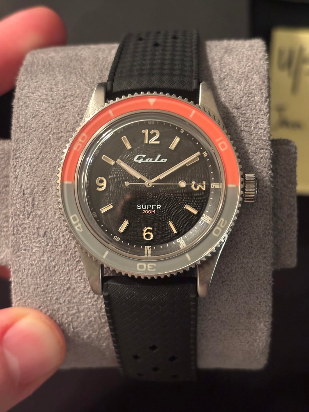 For sale is a super cool Galo Super 200 “Pepsi”. This was one of the “First Edition” batches and has been sold out for a long time now. 39mm x 11.5mm case, Miyota 9039 no date movement, domed top hat sapphire crystal and lumed sapphire bezel insert, lumed crown, 200m of water resistance and a cool custom rotor and image on the caseback. The texture on the oil-pressed dial is beautiful Condition is near mint. No flaws or marks on the watch case. The watch comes with a rubber tropical strap and a vintage leather strap. Comes as a full kit with warranty card (still active) and leather watch roll. I am asking $400 which includes shipping in CONUS. Not interested in trades at this time, trade offers will be ignored. Please message me with any questions or interest and thanks for looking!