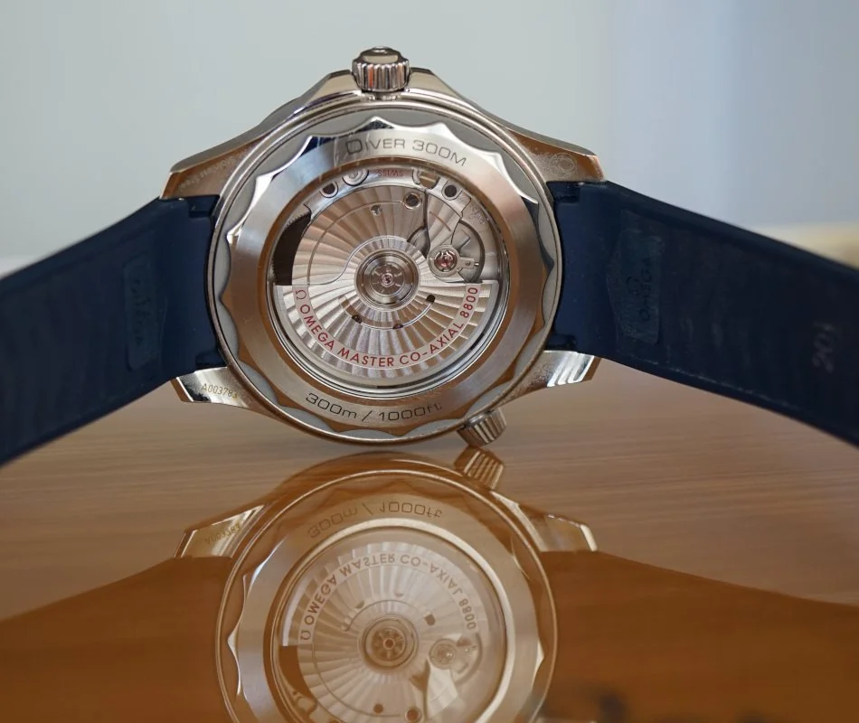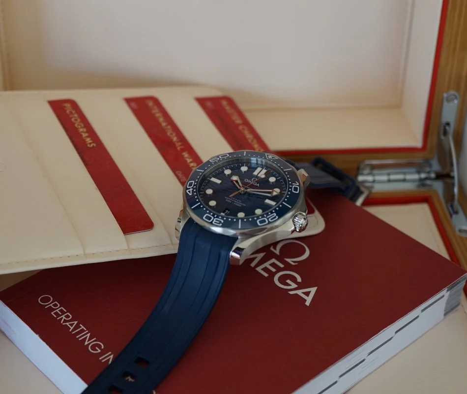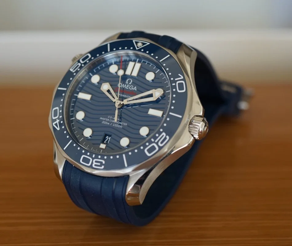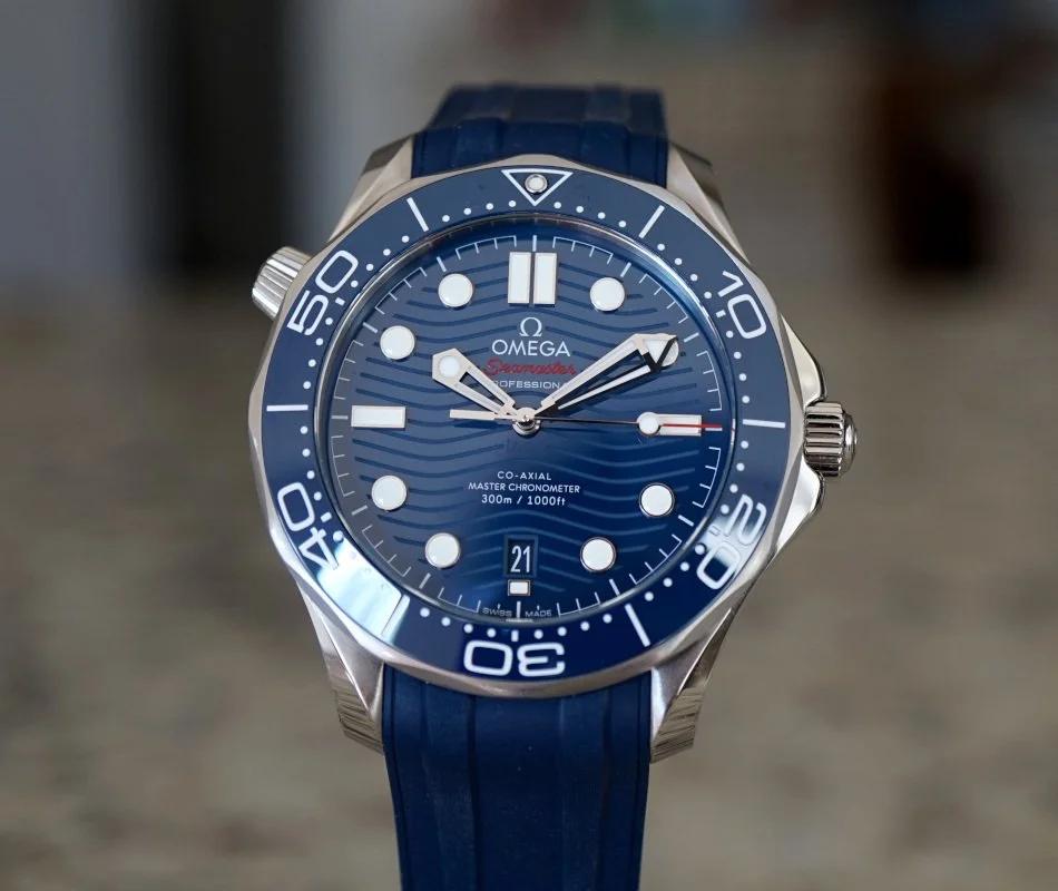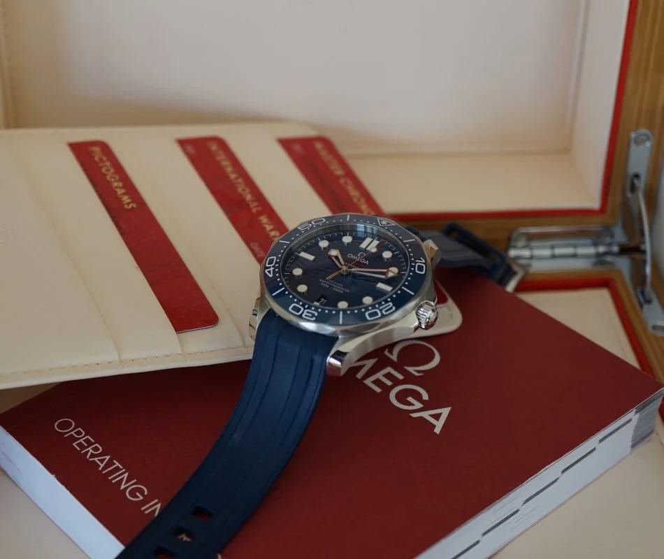 Omega Seamaster Diver 300M Co-Axial Master Chronometer 210.32.42.20.03.001, 21032422003001, 210 32 42 20 03 001, stainless steel case on a rubber strap with a stainless steel tang buckle, automatic Omega Co-Axial Master Chronometer caliber 8800 movement, 55-hour power reserve, blue wave dial, date at 6 o'clock, luminous hands and hour markers, blue ceramic rotating bezel, sapphire crystal, water resistant to 300M. Diameter: 42mm, Thickness: 14mm. Excellent condition with box and papers