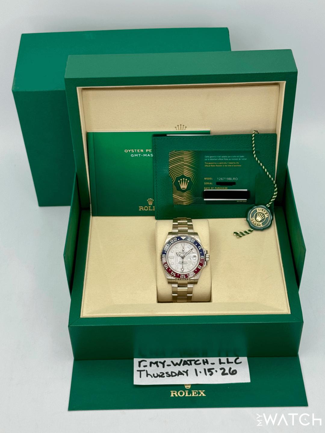 🔵**NEW 2025 Rolex GMT-Master II "Pepsi" 40mm 126719BLRO White Gold Meteorite Dial Oyster Bracelet with Red and Blue Ceramic Bezel** 🔵**Note: Watch still has factory sticker on the clasp** 🔵**TRADE or SELL us your luxury watch, all brands considered. Message me details.** **Includes the following:** **✔️BRAND NEW 2025 UPDATED ROLEX BOX (Double Boxed)** **✔️Box and Papers - Yes** **✔️Warranty card dated December 2025** **✔️5 year manufacturer warranty** **✔️Manual and Warranty booklets** **✔️Green Hang Tag included** **✔️Size: 8.0inch wrist (Full Links)** **✔️Watch is BRAND NEW/UNWORN** **✔️**[**Trades**](https://mywatchllc.com/pages/sell-rolex-watch) **welcome** Business Name: **My Watch LLC** LOCATION: Oak Park, Michigan ✔️[MyWatchLLC.com](http://mywatchllc.com/) for current inventory ✔️Google Business Listing [https://g.co/kgs/Cmd6FPW](https://g.co/kgs/Cmd6FPW) ✔️Business Hours M-F 9-6 ✔️Facetime/Video chat/calls welcome to view the watch interested. ✔️Contact: 248-422-0909 via text or call for quickest response. 🟢TERMS: Visit [MyWatchLLC.Com](http://mywatchllc.com/) for payments accepted 🟢REFERENCES/REVIEWS: We are well reviewed on all platforms from google, trust pilot, rolexforums, additionally we have 300+ reference in multiple FaceBook watch groups, reference checks welcome. 🟢SHIPPING: If you are not local, we offer Fully Insured FedEx overnight shipping in the USA for a fee. International shipping available. [https://mywatchllc.com/products/new-2025-rolex-gmt-master-ii-pepsi-40mm-126719blro-meteorite-dial-1](https://mywatchllc.com/products/new-2025-rolex-gmt-master-ii-pepsi-40mm-126719blro-meteorite-dial-1)