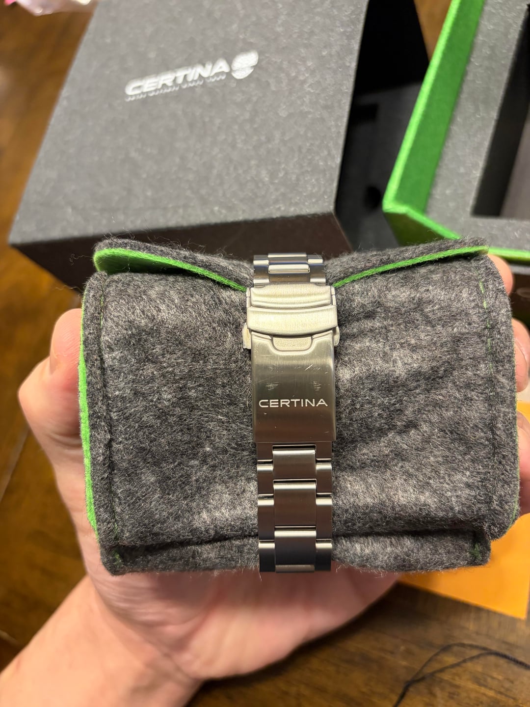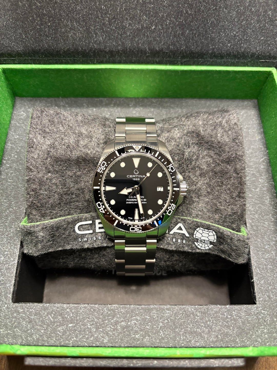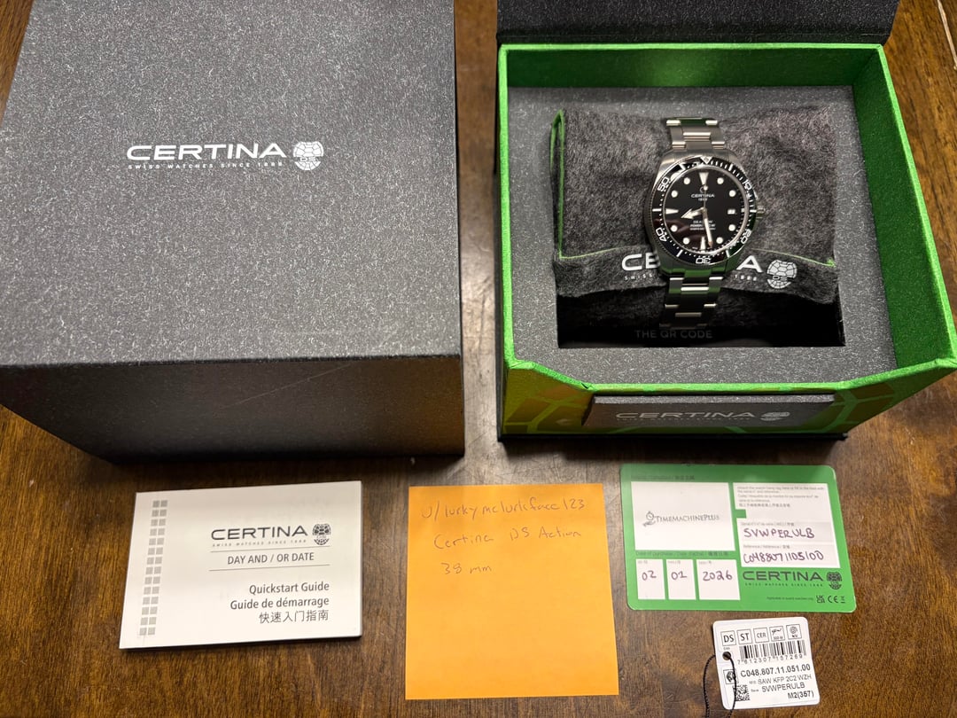 Placing for sale the brand new Certina DS Action Diver, 38mm, ceramic bezel, and new shock proofing system. This is an ISO certified dive watch I’d rate as like new. Watch head and bracelet are immaculate, as the piece has only been worn a couple times. Clasp has very fine desk lines, picture included for reference. This piece is just arriving to US distributors. Selling as I’m moving on from dive watches in general. Includes full set, full links, hang tag, and stamped warranty card from January 2nd 2026. Asking $699, shipping included. Venmo or PayPal. I can get this to you USPS priority today if funding clears. If not I can ship after postal holiday Monday. CONUS only.