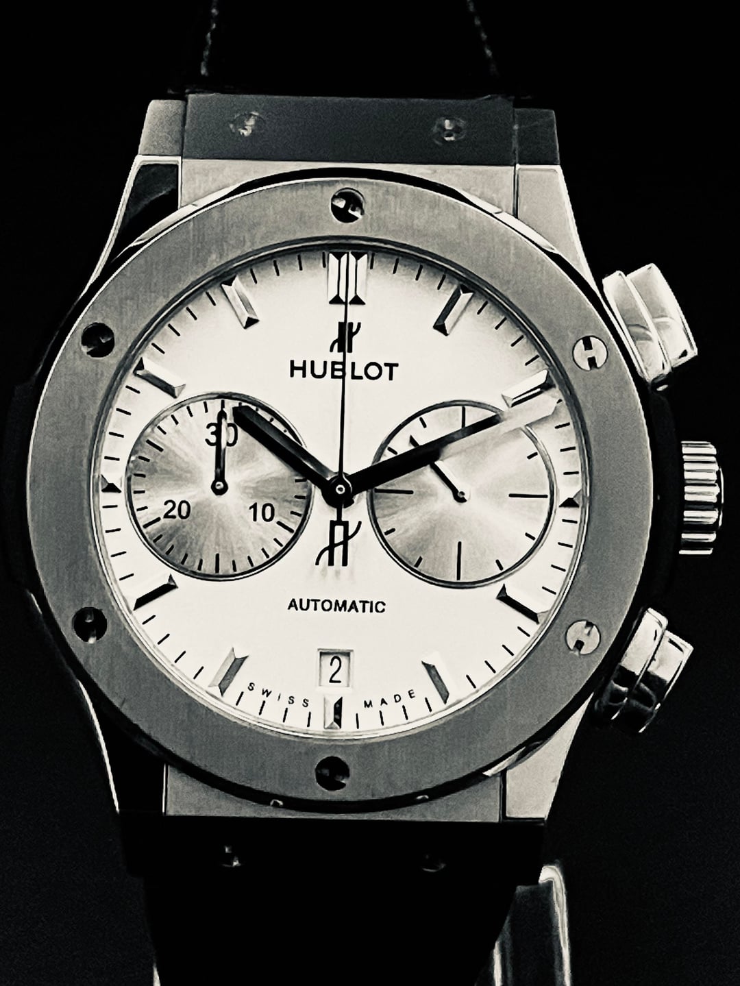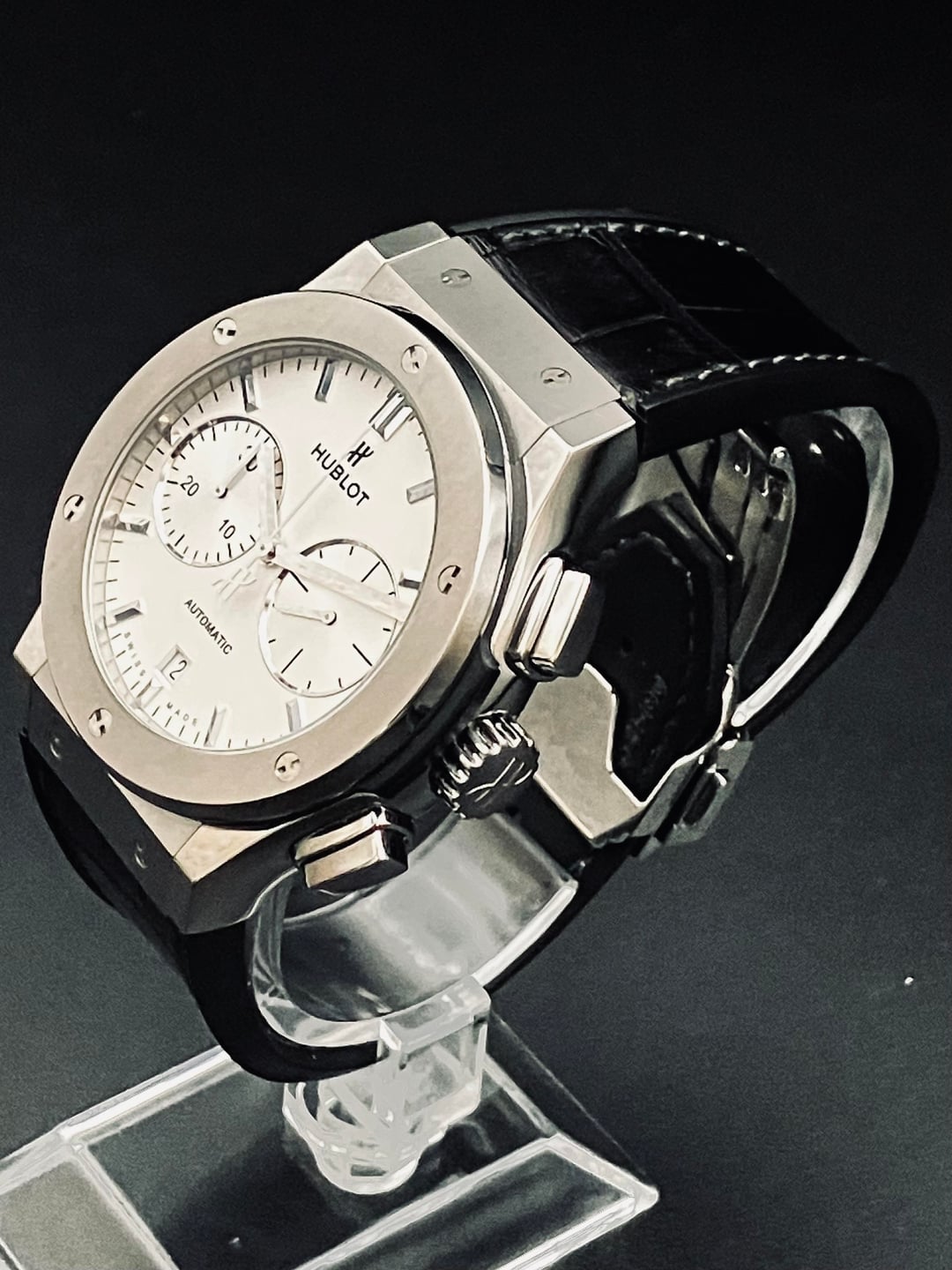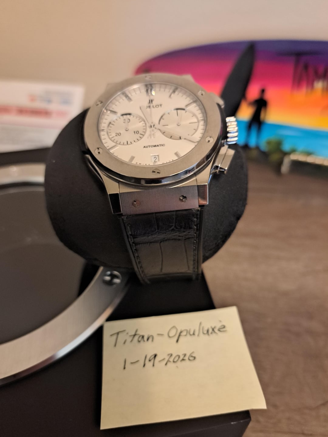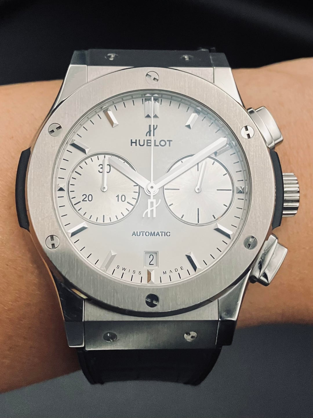 Experience the pinnacle of luxury watchmaking with this stunning Hublot Classic Fusion Chronograph, a sophisticated timepiece that seamlessly blends elegance and precision. This watch features a striking 45mm titanium case, a sleek opaline white dial, and is powered by Hublot's automatic chronograph movement. It is in excellent condition, showcasing only minimal signs of wear, with a clear crystal and keeps excellent time. The only exception are a couple of hairline scratches on the case, which are detailed in the pictures. The watch comes with its original outer box, inner box, instruction booklet, warranty card, and accessories/tools, offering a full, complete and authentic set for discerning collectors or first-time buyers. It is also reduced by more than $3,000 from its original MSRP of $11,600. Priced at $6747, including priority overnight insured shipping to your nearest FedEx location. \*\*\*Please note that due to the photography equipment used, dust and/or imperfections may appear more pronounced, as everything is magnified to a greater extent. \*\*\* Payment methods accepted: Wire & Zelle Shipping is Overnight/Insured/Signature Required I am happy to jump on FaceTime/Video Chat and take additional photos/videos to answer any questions and ensure you are comfortable/confident in the transaction. [https://imgur.com/a/zkNRQND](https://imgur.com/a/zkNRQND)