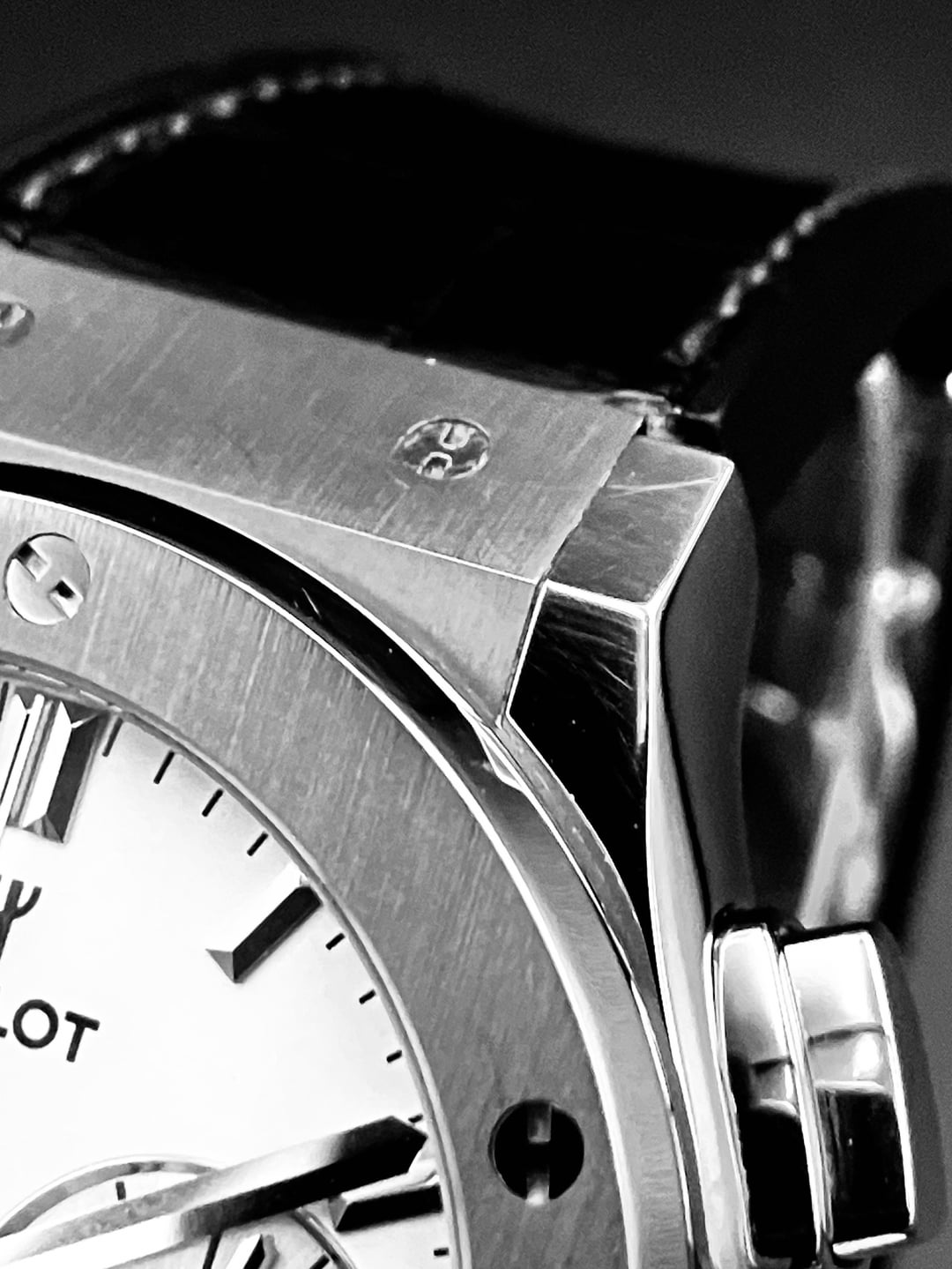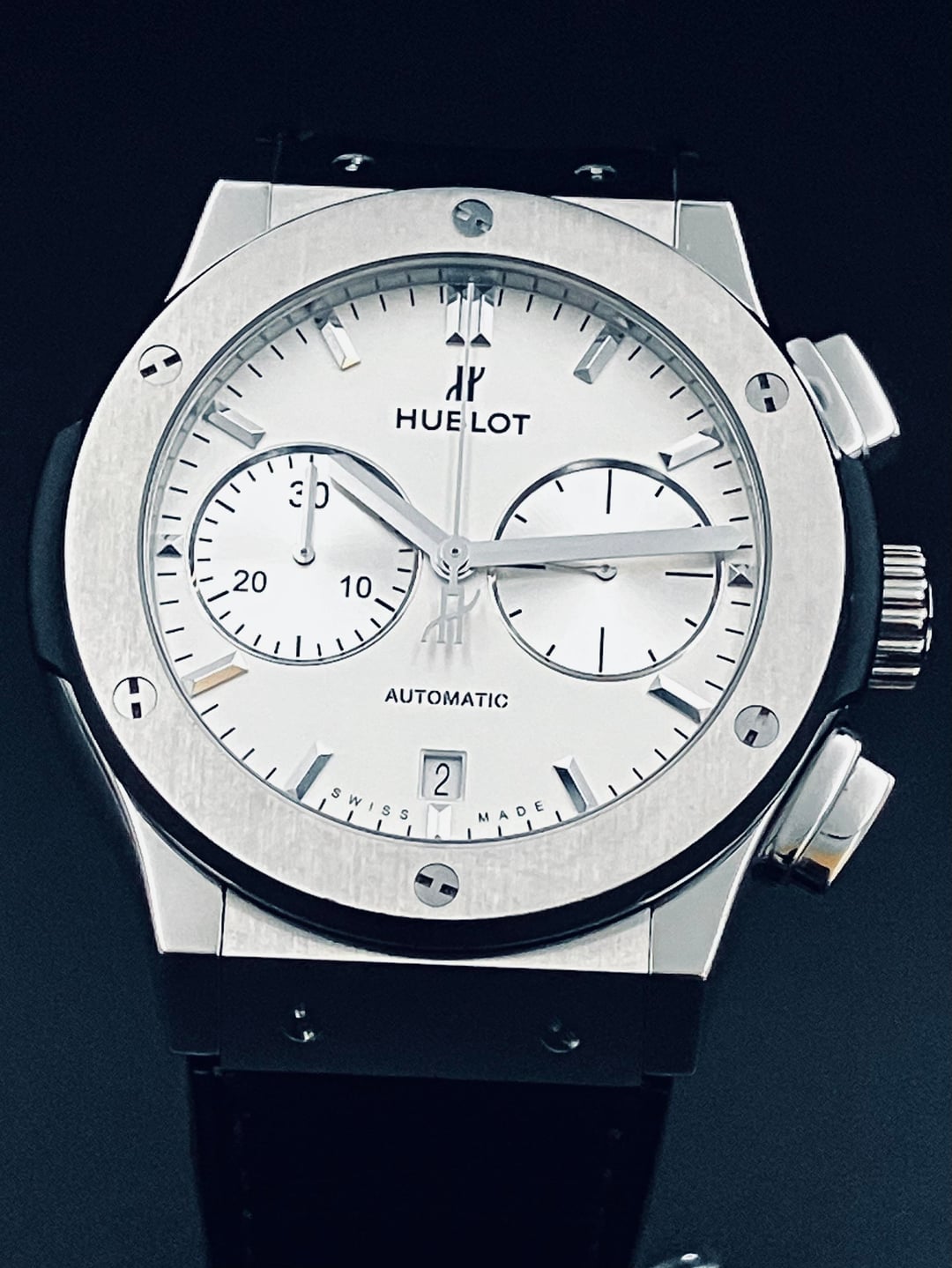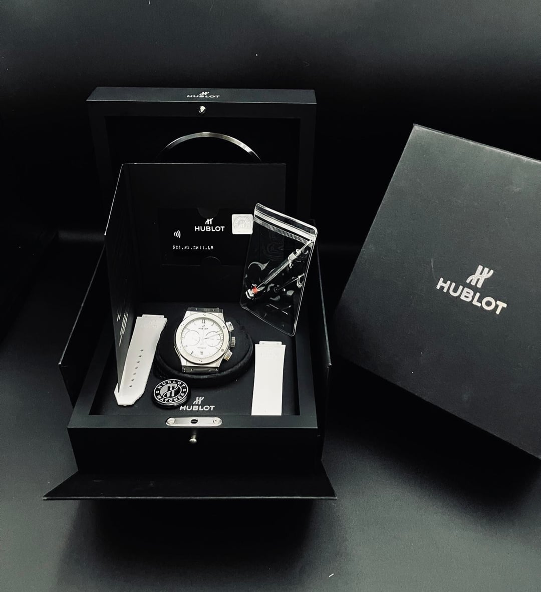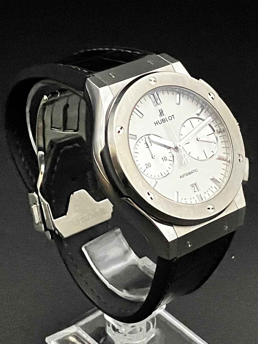 Experience the pinnacle of luxury watchmaking with this stunning Hublot Classic Fusion Chronograph, a sophisticated timepiece that seamlessly blends elegance and precision. This watch features a striking 45mm titanium case, a sleek opaline white dial, and is powered by Hublot's automatic chronograph movement. It is in excellent condition, showcasing only minimal signs of wear, with a clear crystal and keeps excellent time. The only exception are a couple of hairline scratches on the case, which are detailed in the pictures. The watch comes with its original outer box, inner box, instruction booklet, warranty card, and accessories/tools, offering a full, complete and authentic set for discerning collectors or first-time buyers. It is also reduced by more than $3,000 from its original MSRP of $11,600. Priced at $6747, including priority overnight insured shipping to your nearest FedEx location. \*\*\*Please note that due to the photography equipment used, dust and/or imperfections may appear more pronounced, as everything is magnified to a greater extent. \*\*\* Payment methods accepted: Wire & Zelle Shipping is Overnight/Insured/Signature Required I am happy to jump on FaceTime/Video Chat and take additional photos/videos to answer any questions and ensure you are comfortable/confident in the transaction. [https://imgur.com/a/zkNRQND](https://imgur.com/a/zkNRQND)