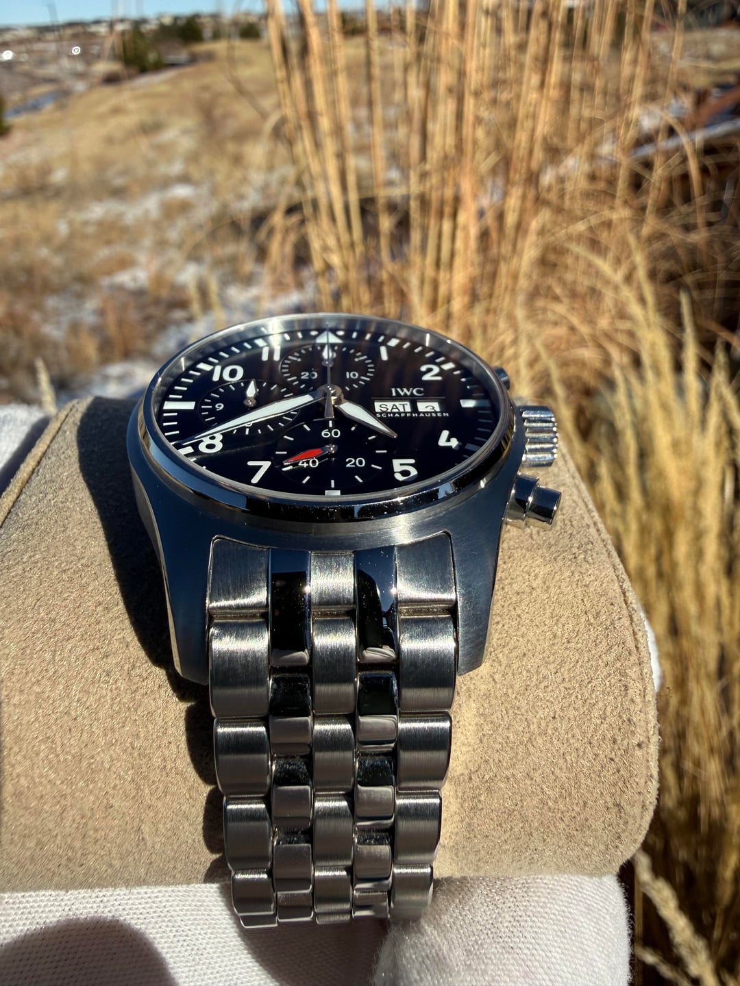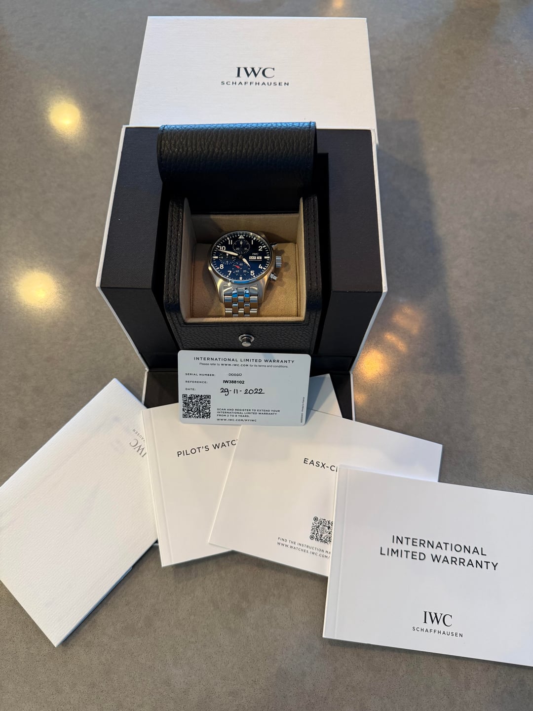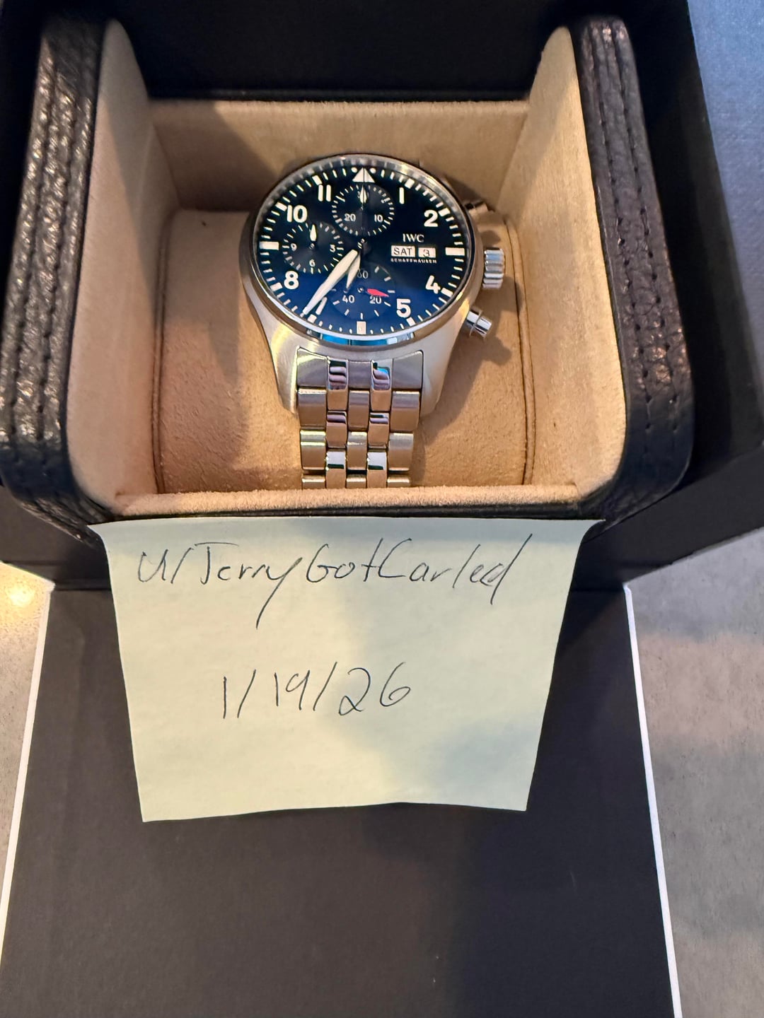 Brand: IWC Model: Pilot’s Watch Chronograph 41 Reference: IW388102 Year: 2022 Condition: Mint Scope: Full Set Price: $5,399 Location: Denver, CO Shipping: Fully insured shipping within the US Payment: Zelle, Wire, or other methods with WatchExchange history or references. ⸻ Description Up for sale is an IWC Pilot’s Watch Chronograph 41, reference IW388102, purchased in 2022 and presented here in mint condition. This watch shows virtually no signs of wear and has been extremely well cared for. The IW388102 features the classic blue dial with crisp white numerals, day/date complication, and the in-house IWC Caliber 69385 automatic chronograph movement. The 41mm case wears comfortably on the wrist and offers the perfect balance of tool-watch aesthetics and everyday versatility. This example comes as a complete full set, including: • Inner and outer boxes • Warranty card • Manuals and booklets • Original bracelet Everything functions perfectly, keeping excellent time (see timegrapher picture)and the chronograph operates as it should. ⸻ Specs (for reference) • Case Size: 41mm • Case Material: Stainless Steel • Movement: IWC Caliber 69385 (In-house automatic chronograph) • Power Reserve: ~46 hours • Crystal: Sapphire (front and back) • Water Resistance: 100m • Bracelet: IWC stainless steel bracelet ⸻ Why buy this one? Mint condition, modern in-house movement, and a true full set—an excellent opportunity to pick up a near-new IWC Pilot Chronograph without the wait or retail premium. Feel free to reach out with any questions, requests for additional photos, or to discuss the deal. References available upon request. More than happy to hop an a FaceTime with serious buyers. Thanks for looking. Cheers!
