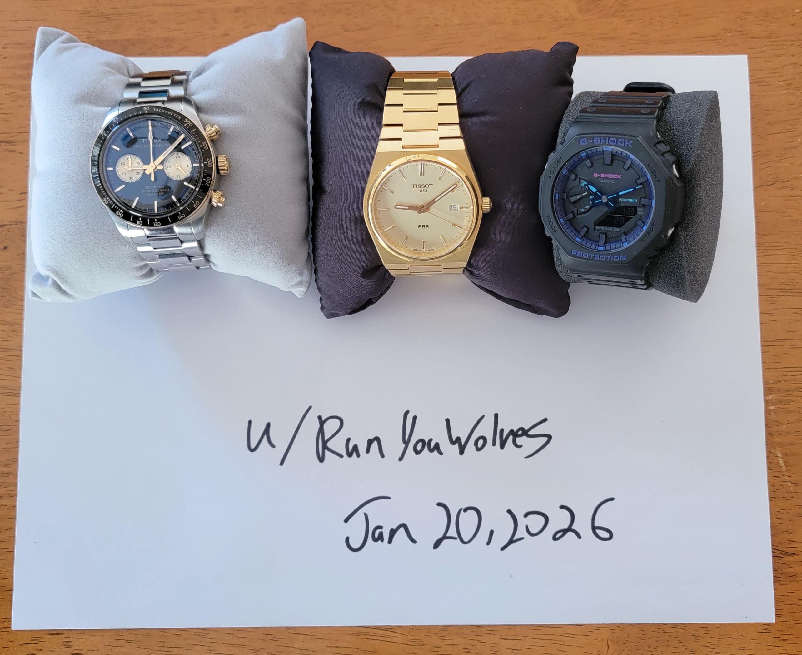 Time to rotate the collection! Timestamp: [https://imgur.com/a/w9WlXl0](https://imgur.com/a/w9WlXl0) **G‑Shock “CasiOak” GA‑2100VB‑1A (Virtual World) — $100** What’s included: Tin case, outer box. Watch is on its factory resin strap. Condition: Good to great overall. There’s a small scuff on the strap (see close‑up in photos), but the case and crystal are immaculate. Everything functions as it should. Pics: [https://imgur.com/a/g-shock-casioak-virtual-world-R1OAaVX](https://imgur.com/a/g-shock-casioak-virtual-world-R1OAaVX) **Tissot PRX 40 mm – Gold PVD Quartz (Ref. T137.410.33.021.00) — $265** What’s included: inner & outer boxes, paperwork, extra links, and the watch on its original bracelet. Condition: Excellent. This piece has been gently worn and is pristine. Pics: [https://imgur.com/a/tissot-prx-quarts-gold-pvd-WVJFEJs](https://imgur.com/a/tissot-prx-quarts-gold-pvd-WVJFEJs) **Timex Waterbury Heritage Chronograph 39 mm (Ref. TW2Y24000) — $260** What’s included: Full kit — box, paperwork, extra links, and the watch on its original bracelet. Condition: Immaculate. I bought this new in 2025, wore it gently a handful of times, and it looks basically fresh out of the box. Deserves some wrist time. Pics: [https://imgur.com/a/timex-waterbury-chrono-heritage-YsUKoSl](https://imgur.com/a/timex-waterbury-chrono-heritage-YsUKoSl) All prices include shipping to CONUS. PayPal F&F or Zelle. Open to trades.