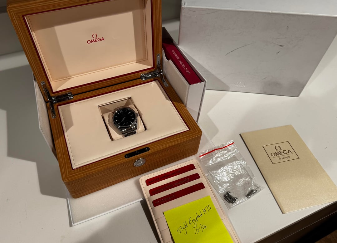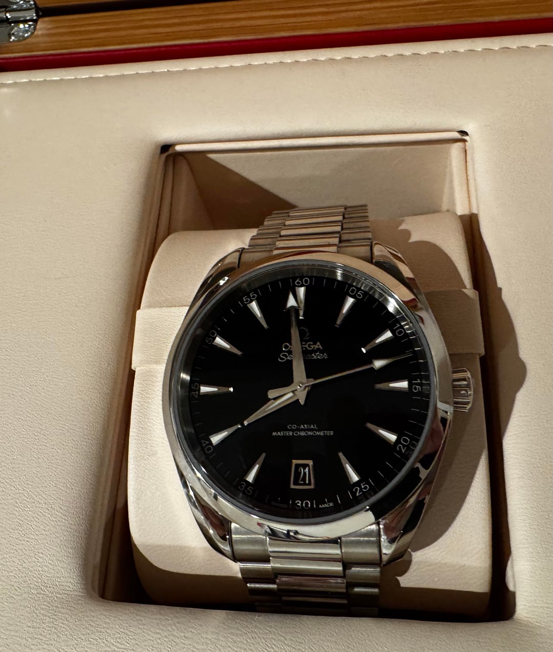 **\[WTS\] Omega Aqua Terra 41 Black Lacquer (220.10.41.21.01.002)** FULL KIT! - Warranty Card (dated 1/11/25), Master Chronometer Card, Pictograms Card, Warranty Book, extra links, inner and outer box, and original receipt from Omega Boutique! **Overview:** Up for sale is a gently used Omega Seamaster Aqua Terra Black Lacquer. This is the 41mm version. Watch is in excellent / perfect working condition and good cosmetic condition with minor swirls, surface scratches, and signs of use on the case and bracelet. There is one very minor knick on the side of the bezel / case at roughly 7 o’clock. I would rather over explain than under explain these areas. These watches are heavily polished so minor scratches like this are inevitable. The crystal (on both sides) is in great shape with no scratches or marks. The micro adjust on the clasp is in perfect working condition. This is one of the most comfortable watches you can buy from Omega! This watch still has lots of warranty left and is a great one watch solution! Selling this to help pay for my new Planet Ocean. **Specs:** Reference - 220.10.41.21.01.002 Calibre - 8900 Size - 41mm / 13.40mm thick / 48mm lug to lug Material - Steel Power Reserve - 60 hours WR - 150M All Links - Currently Sized for 7.25” **Price - $4875 Shipped and Insured to US** Payment - Venmo, PayPal, Bank Wire - add 5% for protection Solid references available from the community!