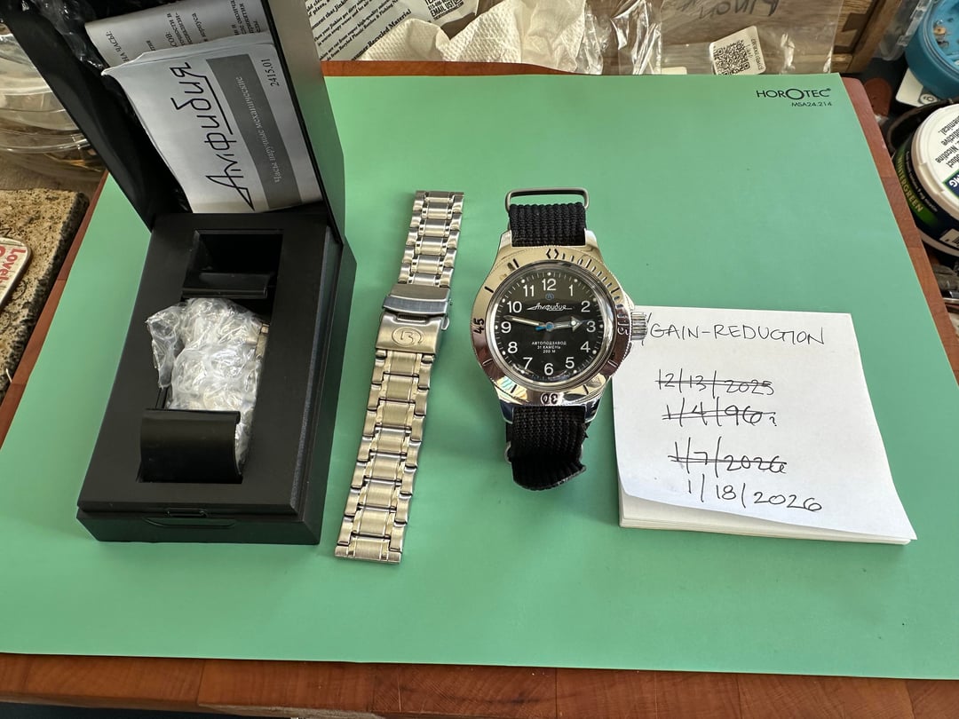 **SOLD** Up for sale is my Vostok Amphibia. This is the perfect entry point into Russian mechanical watches or a rugged "beater" that can actually handle the elements. It features the iconic "wobbly" crown design (a feature, not a bug!) and 200m water resistance. **SOLD** Specs: • Model: 120811 (Case style 120) • Movement: Vostok 2415 Automatic (Self-winding, 31 jewels) • Case Diameter: 41mm • Lug-to-Lug: 46mm • Lug Width: 18mm • Crystal: Domed Acrylic (easy to buff out scratches with Polywatch) • Water Resistance: 200m Condition: The watch is in great pre-owned condition. The acrylic crystal and polished case show some light hairlines consistent with careful wear, but no major gouges. Keeping good time within Vostok specs. Includes: • The watch itself on a comfortable black NATO strap. • Original Vostok stainless steel bracelet (with signed clasp). • Original box and manual/papers (stamped "Амфибия"). Price: $109 shipped (OBO) Accepted: Venmo or PayPal Friends & Family (F&F). PayPal G&S: Accepted only if you have at least five (5) confirmed transactions on r/WatchExchange, and you must add an additional 5% to cover the fee.