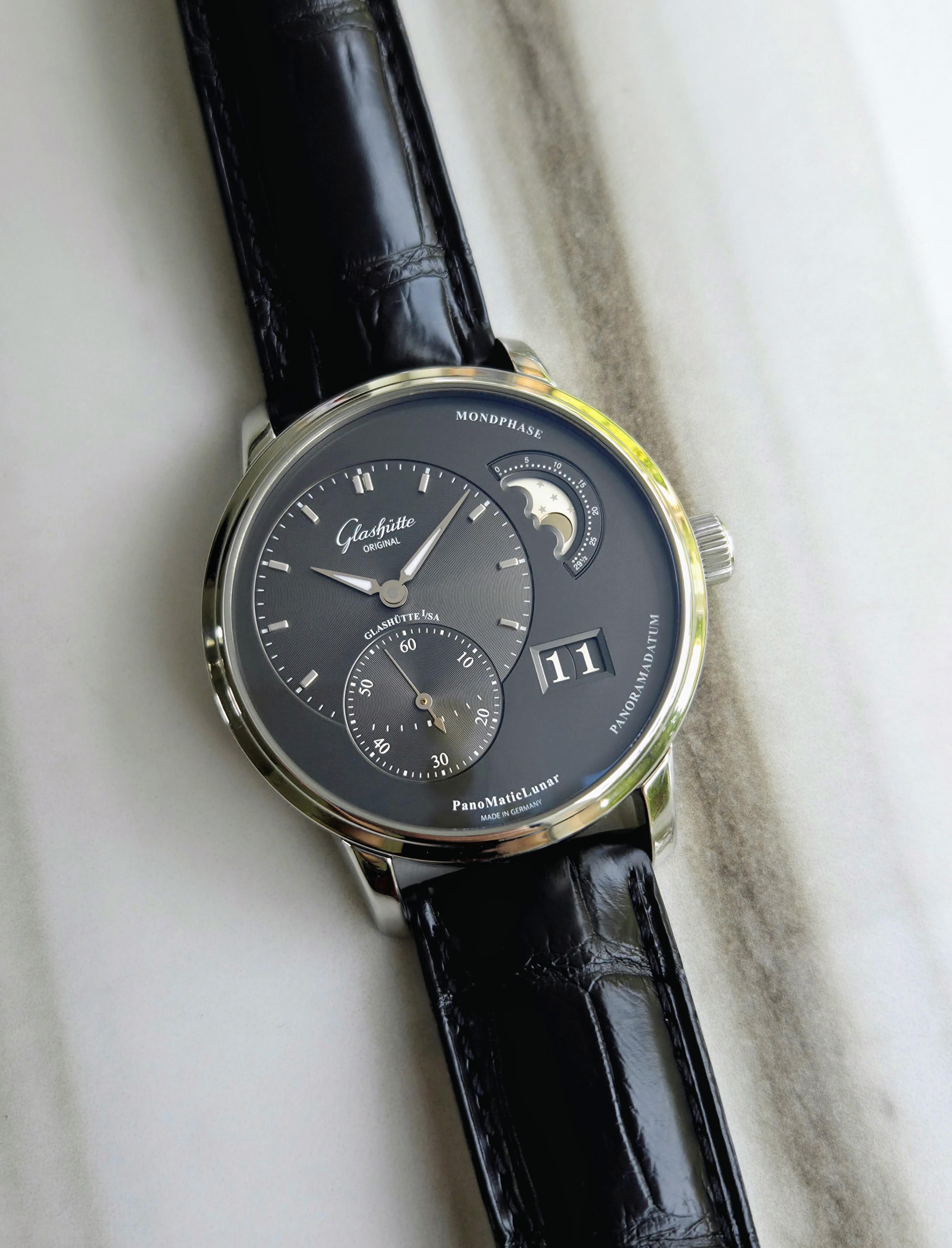 **Glashütte Original PanoMaticLunar** \- **Grey Dial** Distinct and striking, PanoMaticLunar offers moonphase display and Grande date in a beautiful configuration on a grey dial with white gold hands. 40mm stainless steel case with factory black alligator strap with a deployment buckle. Features time, panorama date and moonphase. Glashütte Original manufactured movement Calibre 90-02: Glashütte three-quarter plate with stripe finish, balance bridge hand-engraved, duplex swan-neck fine adjustment, skeletonised rotor and 21-carat gold oscillation weight, bevelled edges, blued screws. Comes with outer box, inner box, travel case, booklets and papers dated 2025. Reference 1-90-02-43-32-05 More pics: [https://imgur.com/a/lNhoE1z](https://imgur.com/a/lNhoE1z) $7,400 plus shipping 🛫 All watches shipped FedEx fully insured. Local pickup available in Los Angeles area. 💬Positive feedback from hundreds of successful transactions across the watch community, including WUS, Chrono24, eBay, Facebook, and Reddit. I’m always happy to connect by phone or video call to answer questions or verify details. Zelle, Venmo and wire accepted. ⭐150+ five-star reviews on Chrono24 — buy with confidence. ⌚I have a wide range of exceptional watches available, with new pieces added every week.