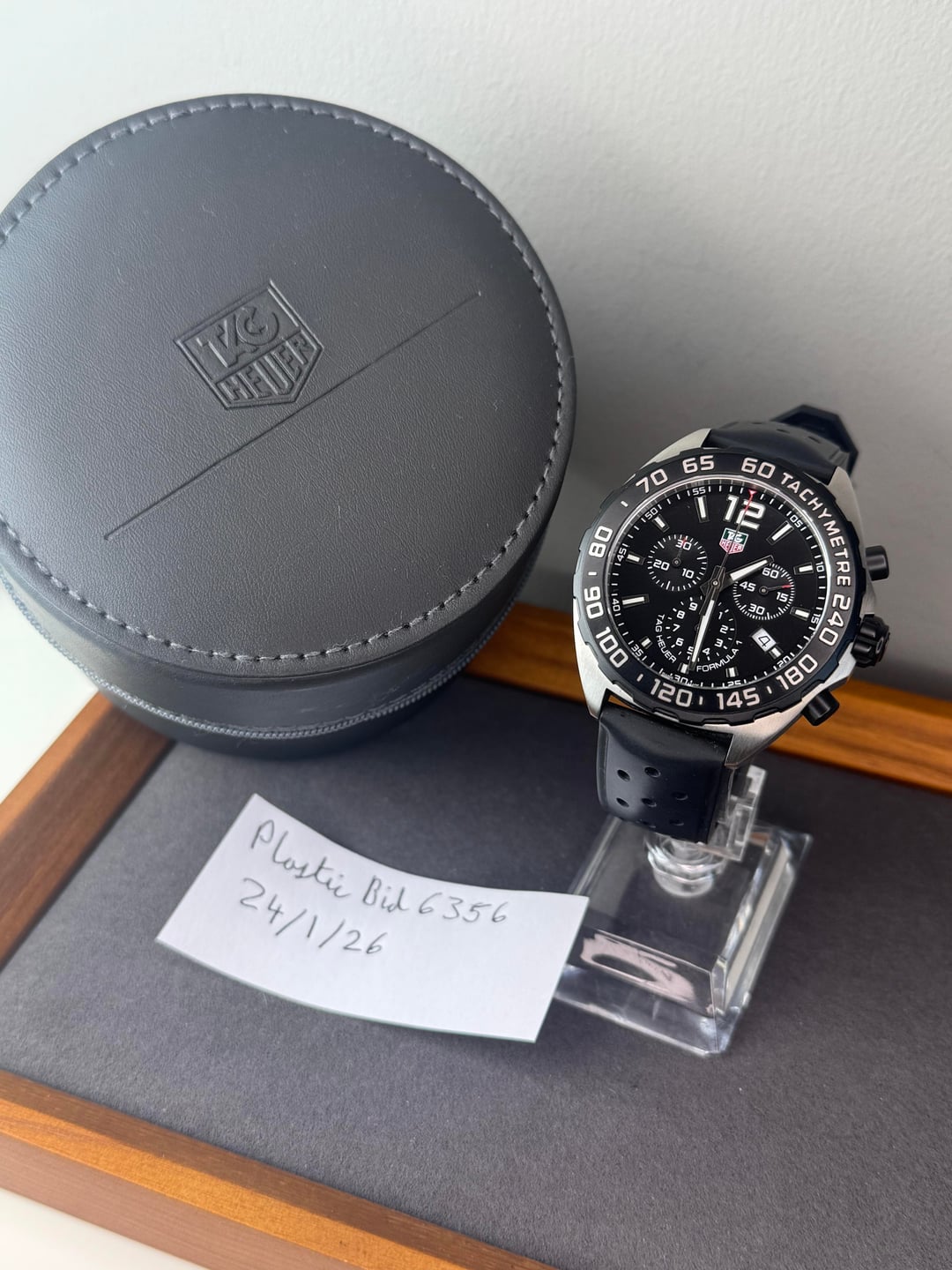 Location: London, UK Price: £660 ~ $900 USD PayPal / Bank Transfer Shipped Same day RM 1pm Guaranteed (within UK) Genuine TAG Heuer Formula 1 Chronograph, reference CAZ1110, from 2017. A sporty Swiss chronograph featuring a 41 mm stainless steel case, black dial, and original TAG Heuer black rubber strap. The watch is in 9/10 condition and presents as flawless for its age, with no notable marks and excellent overall finish, as shown in the photos. 100% authentic TAG Heuer, fitted with the correct Swiss movement. The dial features three chronograph sub-dials, luminous hands and hour markers, and a date display at 4 o'clock. Powered by a reliable Swiss quartz chronograph movement, with 200 metres water resistance, making it ideal for everyday wear. Supplied with a TAG Heuer travel case. Specifications Brand: TAG Heuer Model: Formula 1 Chronograph Reference: CAZ1110 Year: 2017 Movement: Swiss quartz chronograph (Ronda 5040.D) Case material: Stainless steel Case size: 41 mm Crystal: Sapphire Dial: Black with luminous hands & indexes Bezel: Fixed stainless steel tachymeter bezel Functions: Chronograph, date Water resistance: 200 metres Strap: Original TAG Heuer black rubber strap Lug width: 20 mm Clasp: Stainless steel pin buckle Condition & Authenticity