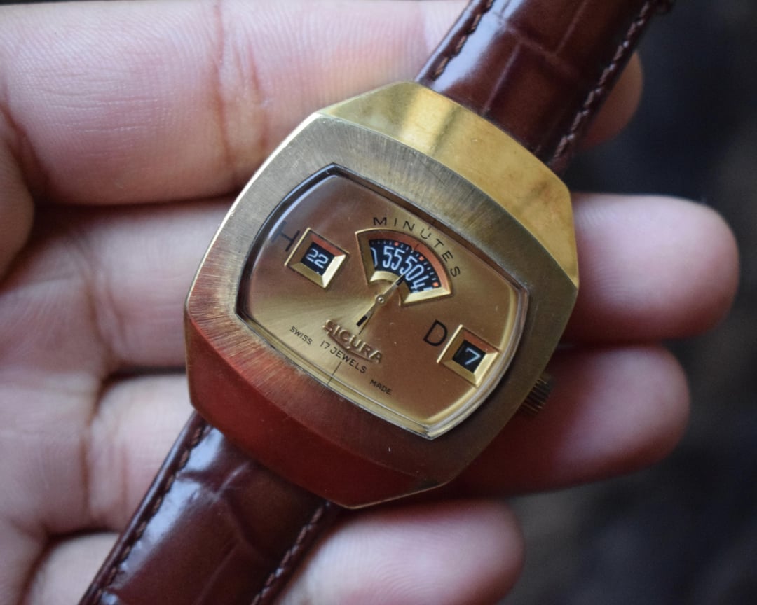 Timestamp : [IMG-0621.jpg](https://postimg.cc/WFRZ8g2y) Up for sale is a very unique and eye-catching vintage Sicura jump hour watch, featuring a rare jump hour and retrograde minutes display. A true 1970s-style design with strong character. Details: • Brand: Sicura • Type: Jump Hour / Retrograde Minutes • Movement: Swiss mechanical, 17 jewels • Dial: Gold-tone dial with jump hour window and retrograde minute scale • Case: Gold-tone case • Caseback: Stainless steel back, signed (Swiss Made, base metal bezel) • Crystal: Acrylic • Strap: Brown leather strap • Functions: Jump Hour, Retrograde Minutes Condition notes: Watch is in good vintage condition overall. Dial is clean and very attractive. Case shows normal signs of wear consistent with age. Movement is running. Please review photos for exact condition. Price: $275 shipped OBO Payment: PayPal G&S Shipping: Ships securely with tracking.