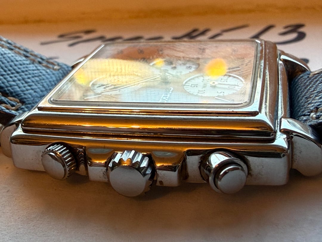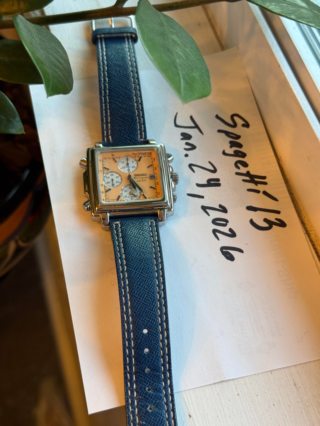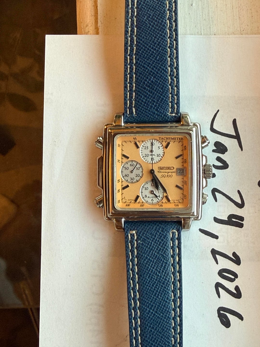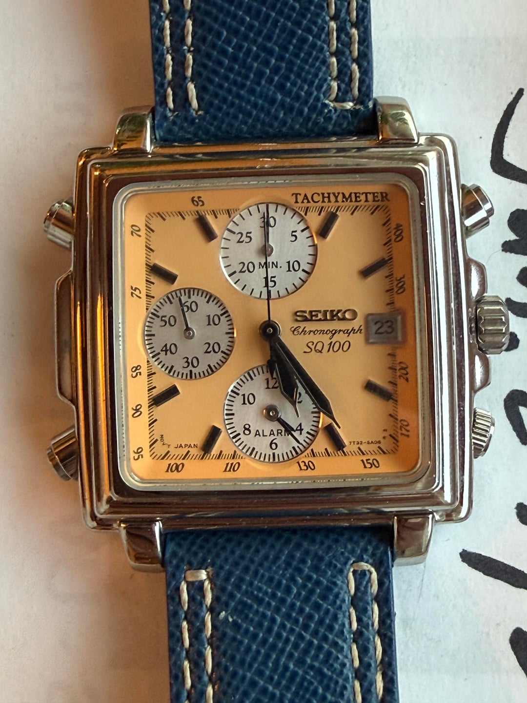 This extremely rare Seiko SQ 100 Ref. 7T32-5A09 Quartz Alarm Chronograph possesses an ever-sought-after salmon-colored dial encased in a square steel case. This one was manufactured in 1995, according to the serial number. The left chronograph registers feature a silver tone against the highly saturated base dial. The black appliques contrast the hour indicators. That makes this a highly legible timekeeper. The case is 40mm. The lug width is 20. Everything on this watch is functioning properly, including the chronograph and the alarm, which has a very unique chime. The center seconds, despite this being a quartz movement, has a very nice sweep. The watch comes on a blue Spiedel strap. These watches were produced for a very limited time and very rarely appear for sale. This is only the second one I've seen go up for sale in the past two years. **Asking price is $715 shipped to the CONUS.**