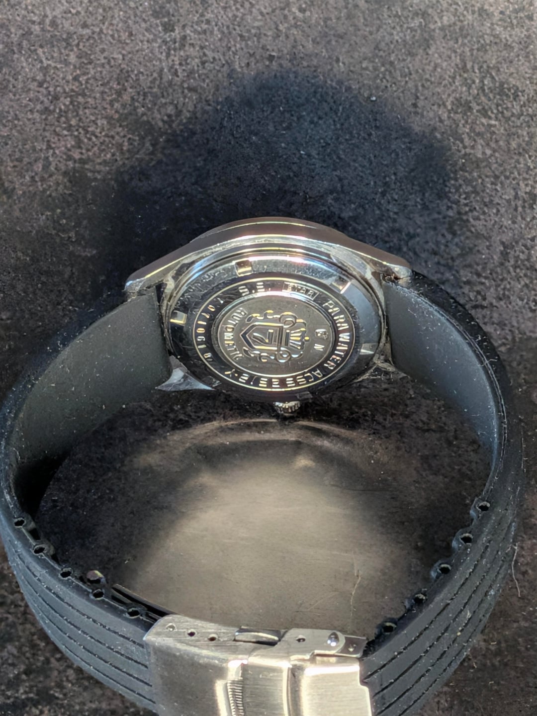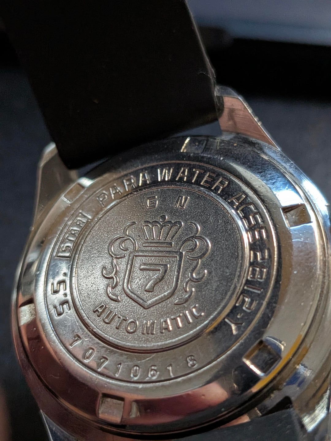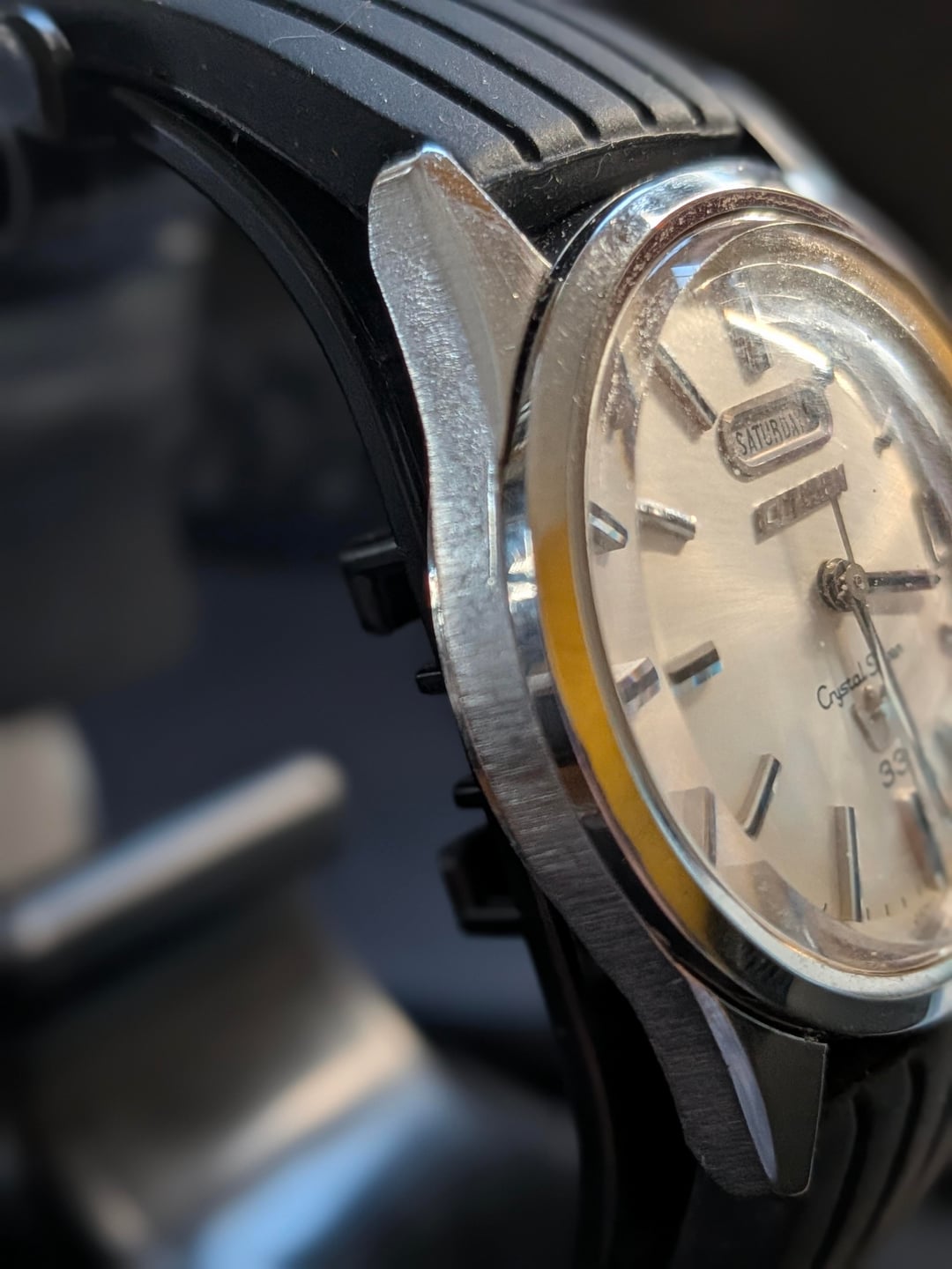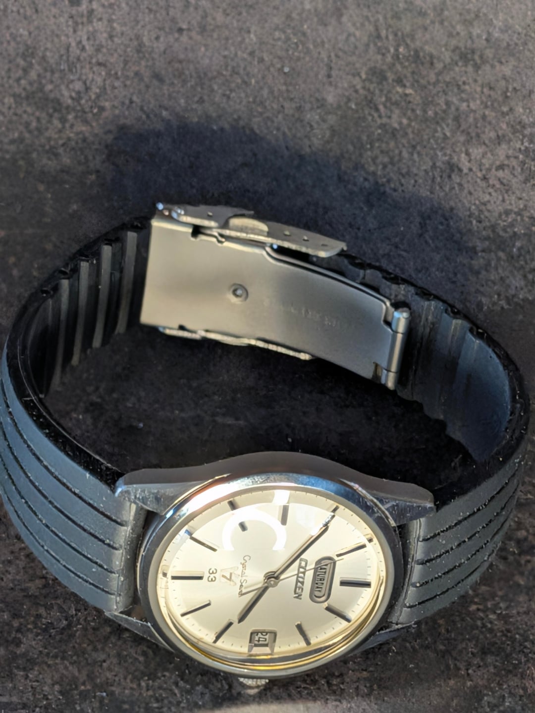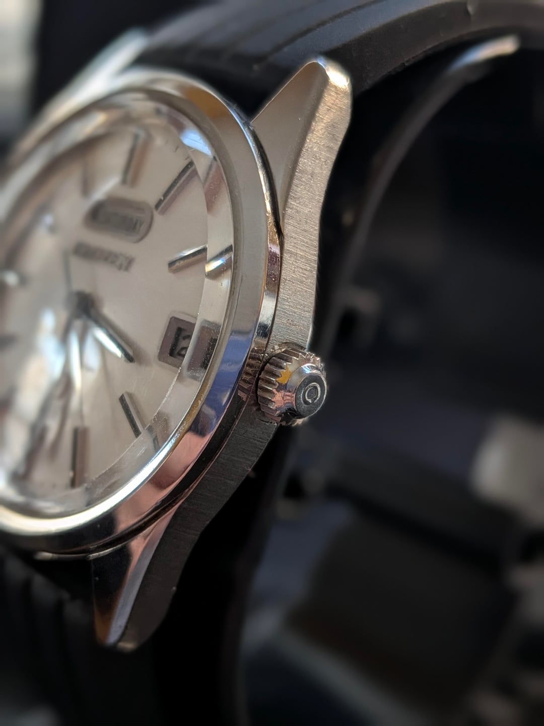 Up for sale is a vintage Citizen Crystal Seven "33" (Ref. ACSS 2812-Y), dating back to July 1967. This desirable JDM model features a high-count 33-jewel automatic movement and the classic "President-style" layout with a full day window at 12 o'clock and date at 3. The silver sunburst dial is clean and sharp, housed in a stainless steel "Parawater" case that offers great wrist presence. The watch is in honest vintage condition with some signs of wear consistent with its age, comes mounted on a black rubber strap, and is a fantastic example of high-spec 1960s Japanese watchmaking. Asking $350, CONUS only