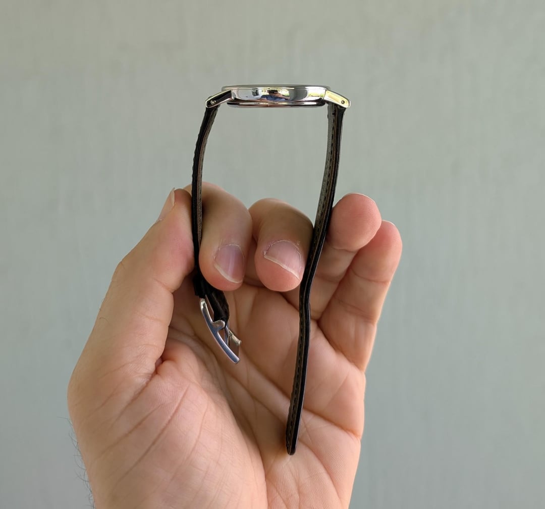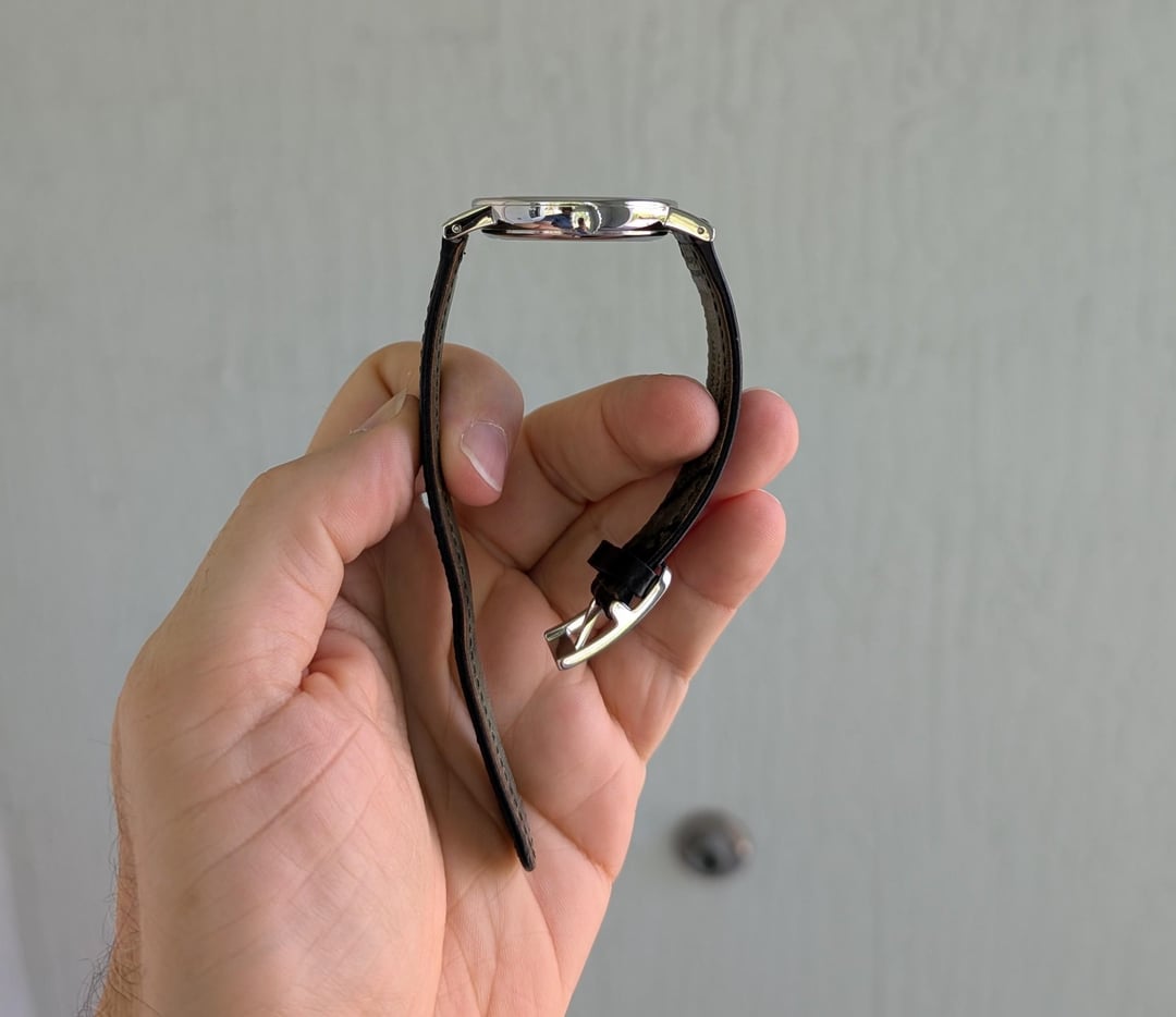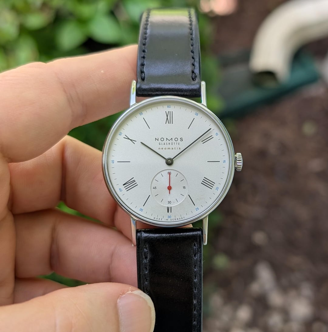 **Nomos Ludwig Neomatic model 282, complete with box and papers** **Size** \- 36.5mm, lug to lug is 46mm **VERY THIN** for an automatic watch, only **7mm** thick Galvanized white silver-plated dial with black numerals; small minute markers in the outer track in cyan blue In-house, well-finished, automatic DUW 3001 movement. Skeletonized rotor, blued screws, etc. Nomos shell cordovan black strap (has a horizontal crease on the long side by one of the holes) Rated water resistance - 50m Excellent condition. Warranty card dated Sept 29 2022. **Price**: $1995 shipped in US (list price is $3660). Paypal F&F or Zelle. Not looking to trade.