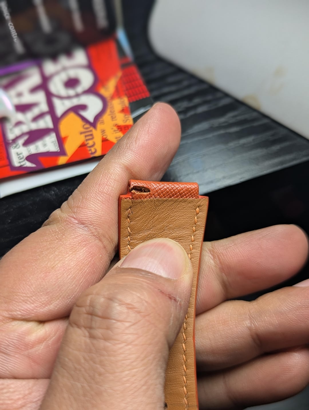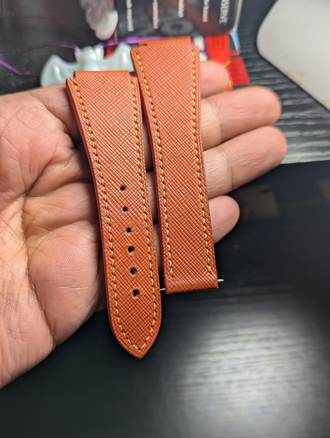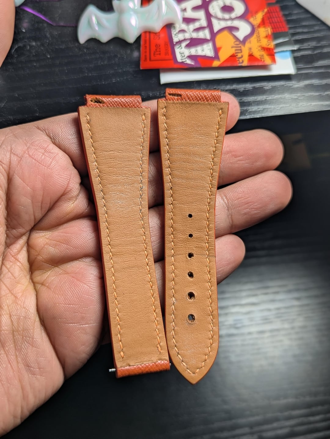 Hi Watchex! Up for sale are these custom made straps for the Brew Metric! These are fantastic and in my opinion much more supple than the OEM leather straps offered by Brew. They were made by Tokonuma Leather works. I am offering both these at the price of one **($49)**. The orange Saffino is a bit compromised because I tried to add holes for quick release spring bars. (Check last pics for more details). It still works well though The black Dollaro strap is Brand new and Unworn. I will include the Stainless Steel deployant clasp as a well in the deal! Let me know if you have any questions. **Check out my other strap sales!**