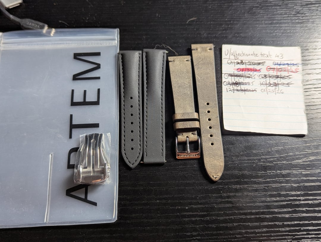 Hello Watchex! Up for sale are these **Brand New and Unworn 19mm straps from Artem and Veblenist at a significant discount over their retail prices!** **19mm Artem loop-less Hydroflex Dark Matter + free aftermarket SS Deployant Clasp - $130** (Retail - $250) Link: https://artemstraps.com/products/loop-less-hydroflex%E2%84%A2-black-sailcloth-watch-strap-with-black-stitching-1 **19mm Veblenist Smoke Leather strap - $75** (Retail - $125) Link: https://veblenist.com/products/smoke-watch-strap?srsltid=AfmBOooU3pLqnat_IsFhuDwgntM8Vu9JHRKOZmrTiDnvg2tYxA1NNcGO **Both straps are standard length and unused** Happy to answer questions. **Check out my other strap listings!**