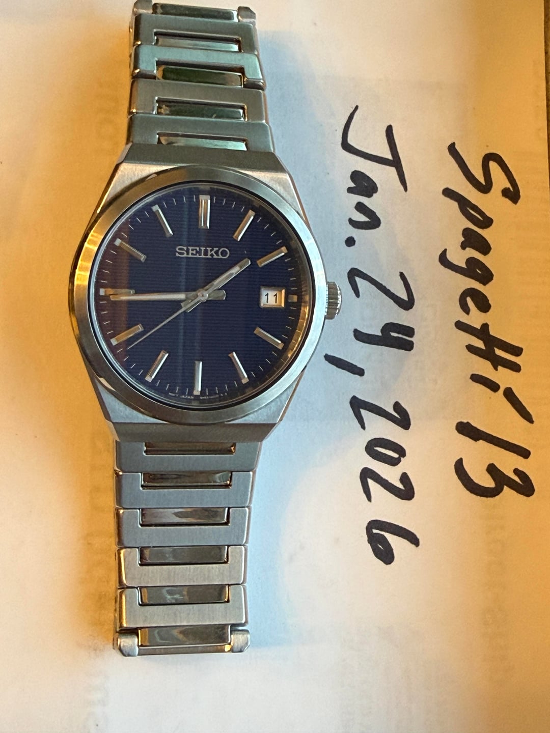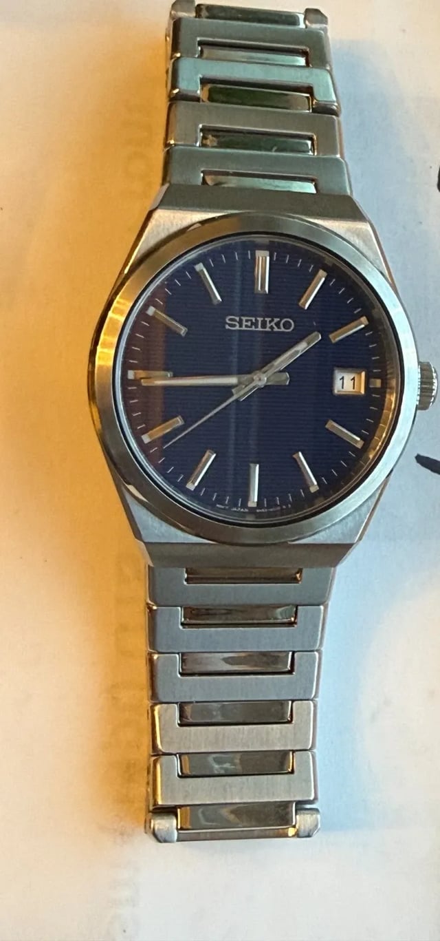 Asking $215 SHIPPED to the CONUS! This watch was purchased in a Macy's liquidation sale. It was a display model, and is new without the box or tags, because it was a display model. Comes with full links. 38.5mm case size Here's what Seiko says about it: From the Essentials Collection. An updated classic, this sleekly angled watch features a vibrant blue pressed-pattern dial with simple stick indices, date calendar, and LumiBrite hands and markers. Crafted of stainless steel with a scratch-resistant sapphire crystal, this versatile timepiece includes a secure screwdown caseback and tri-fold push button release clasp. 10 bar, 100M Water Resistant