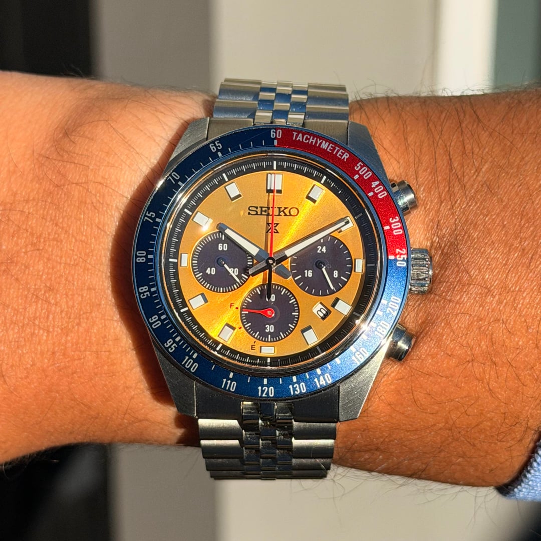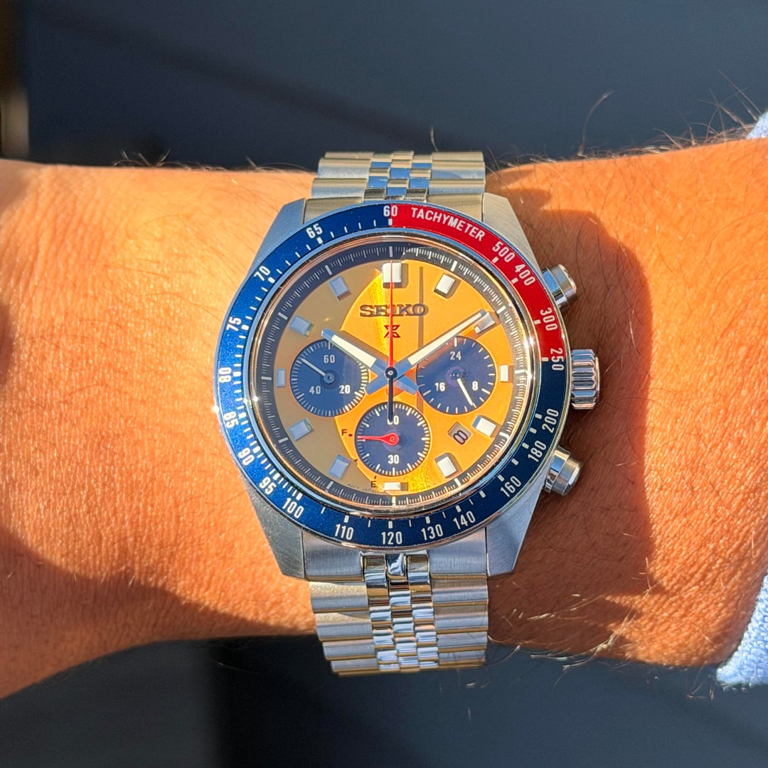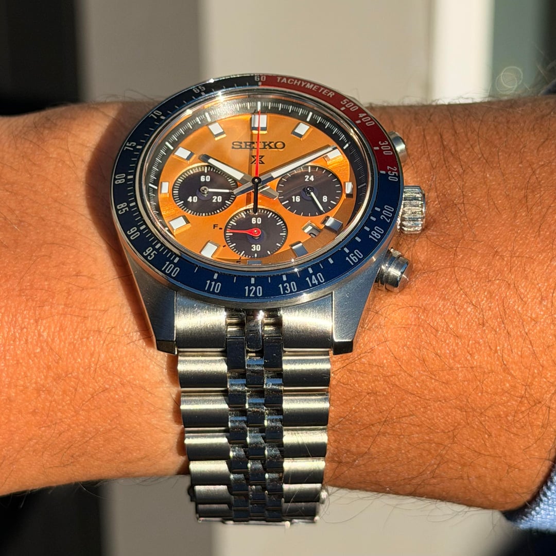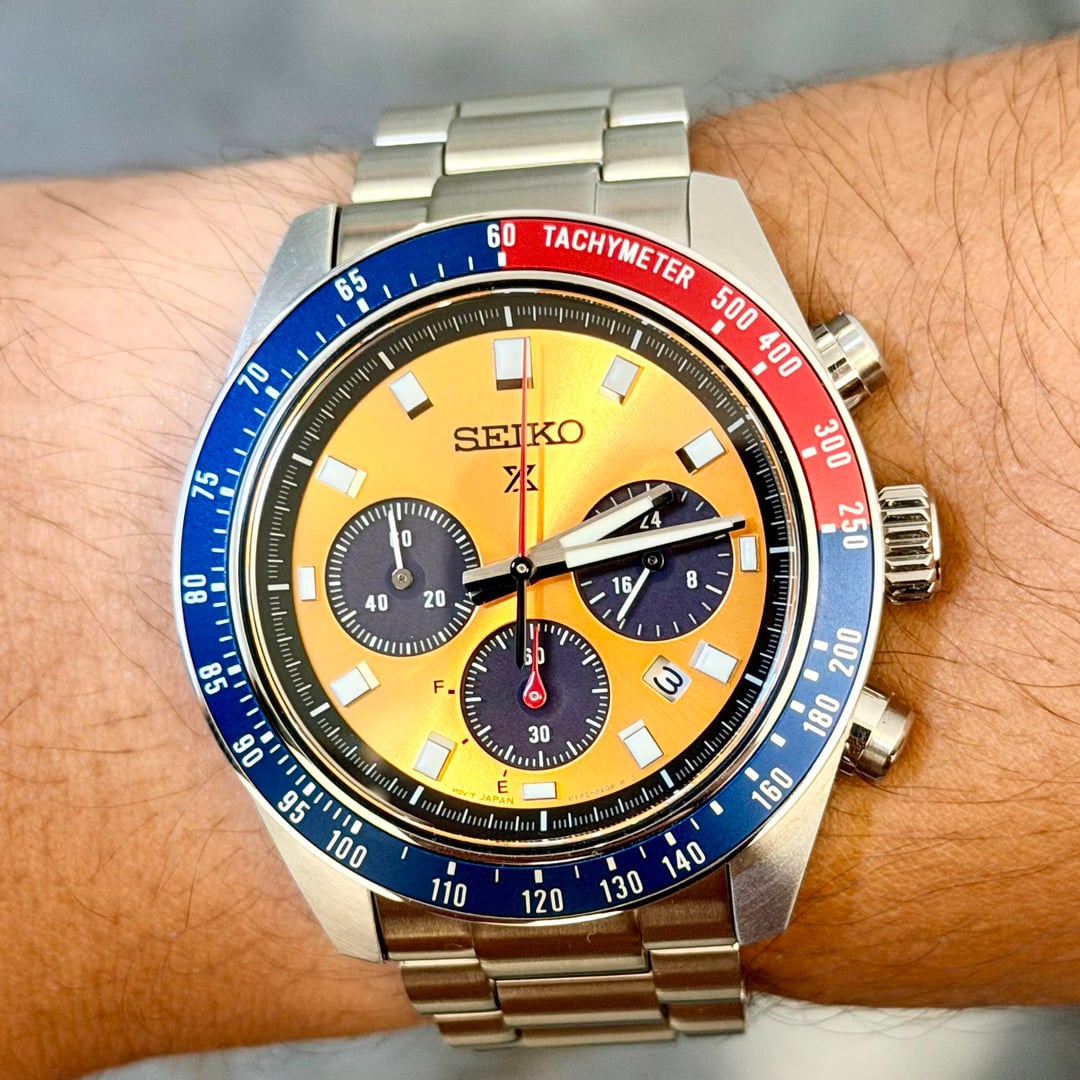 Bought from Exquisite Timepieces and delivered to me on 10/03/2025. Worn in a rotation of 6 watches and pictures can basically show that the only wear marks are on the clasp. Full set with Box & Papers + 1. An Islander Jubilee made for the Speedtimer 41.4mm. 2. A StrapXpro extremely comfortable, thin, & will finished clasp. 3. A Crafter Blue FKM strap with the steel end-Links. The OEM Bracelet and clasp are in perfect condition because it was sized but never really worn. Dimensions: 13mmX41.4mmX45.9mm What I love about it: awesome solar movement, great lume, 100mm WR, very very wearable for almost any wrist size, and that iconic Seiko Pogue color way! Asking for $499 + Shipping via any payment options. If you’re going to use PayPal then please use G+S and add 4% on you (unless you have plenty of references) Shipping USA only If you’re in Twin cities Minnesota, let’s meet up! Thank you! No trades, Please