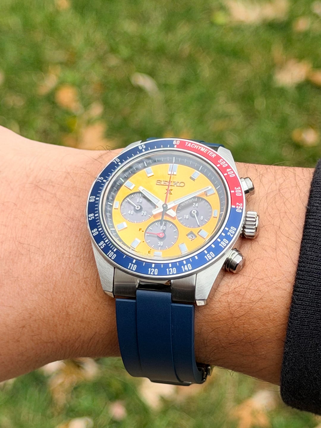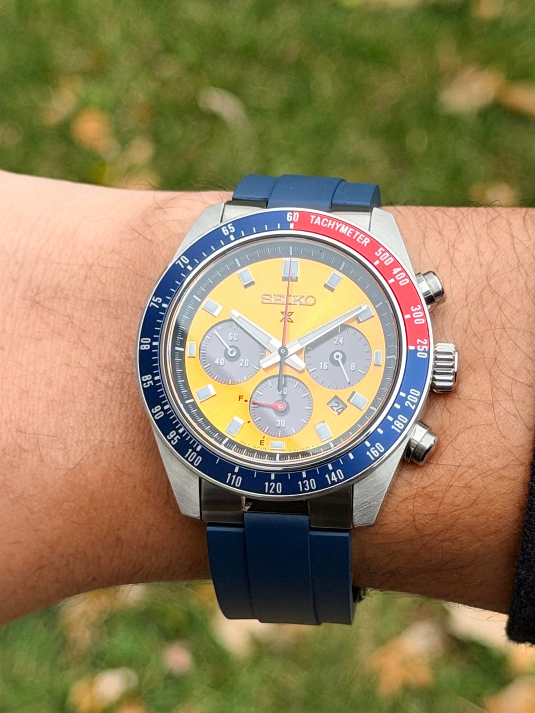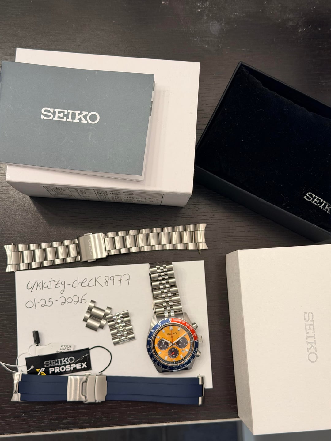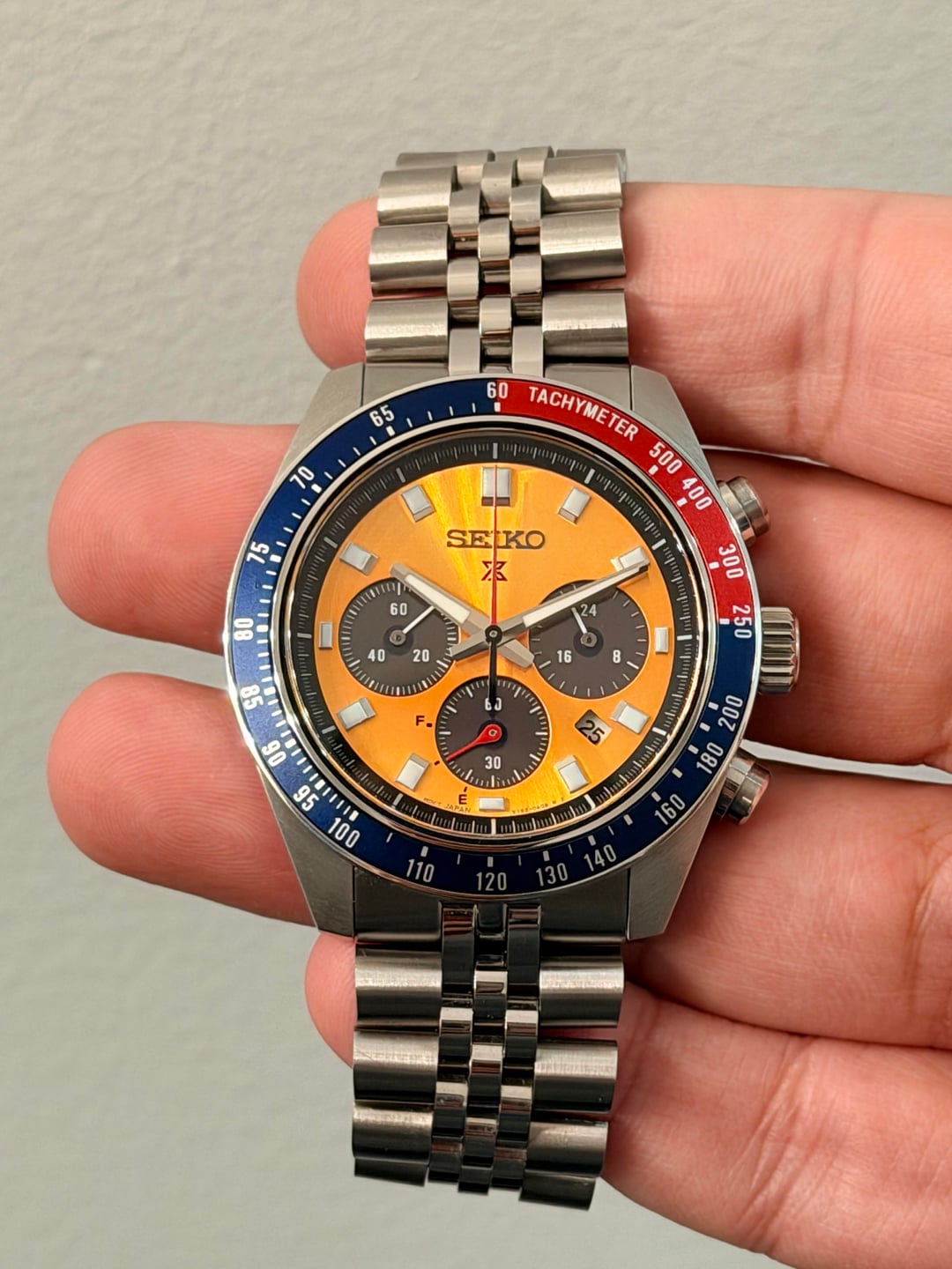 Bought from Exquisite Timepieces and delivered to me on 10/03/2025. Worn in a rotation of 6 watches and pictures can basically show that the only wear marks are on the clasp. Full set with Box & Papers + 1. An Islander Jubilee made for the Speedtimer 41.4mm. 2. A StrapXpro extremely comfortable, thin, & will finished clasp. 3. A Crafter Blue FKM strap with the steel end-Links. The OEM Bracelet and clasp are in perfect condition because it was sized but never really worn. Dimensions: 13mmX41.4mmX45.9mm What I love about it: awesome solar movement, great lume, 100mm WR, very very wearable for almost any wrist size, and that iconic Seiko Pogue color way! Asking for $499 + Shipping via any payment options. If you’re going to use PayPal then please use G+S and add 4% on you (unless you have plenty of references) Shipping USA only If you’re in Twin cities Minnesota, let’s meet up! Thank you! No trades, Please