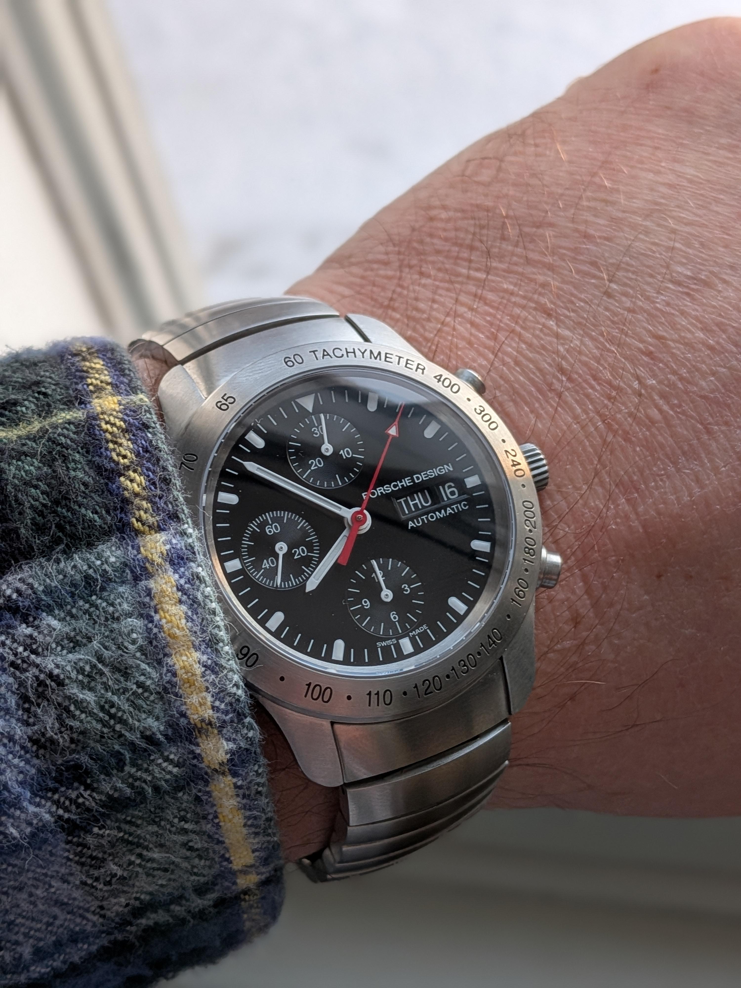 Hello everyone! Up for sale is this gorgeous neo-vintage day/date chronograph from Porsche Design, built by Eterna. This watch has been fully serviced and is running great. It is in excellent all original condition and will fit up to 8" wrists. If you're looking for a chronograph that punches weigh above it's weight class, this is it. [Photos](https://imgur.com/a/HUzYxfY) [Timestamp](https://imgur.com/gtcnAaN) * Case: 39mm Stainless Steel * Dial: Original * Crown: Original, Screw Down * Bracelet: Original, fits up to 8" * Movement: Automatic Day/Date Chronograph **I’m asking $1100 for this piece.** If interested, please consider following [Crooked River Vintage](http://www.instagram.com/crookedrivervintage) on Instagram for other vintage watch offerings. I will respond more quickly to inquiries via Instagram, Reddit can be difficult for me to check during the day. Please don't hesitate to DM me with specific questions or pic requests! **I will consider offers.** Asking price includes shipping CONUS via USPS Priority Mail. I prefer Zelle or PayPal F&F for payment. As with all vintage watches, exposure to water is not recommended and total accuracy and duration cannot be guaranteed. Unless otherwise noted service history is unknown. [Please check my profile for my other offerings!](https://www.reddit.com/user/farkasvirag/submitted/) Thanks and take care everyone!